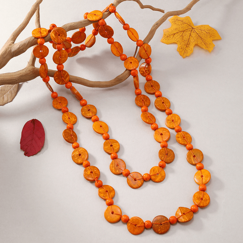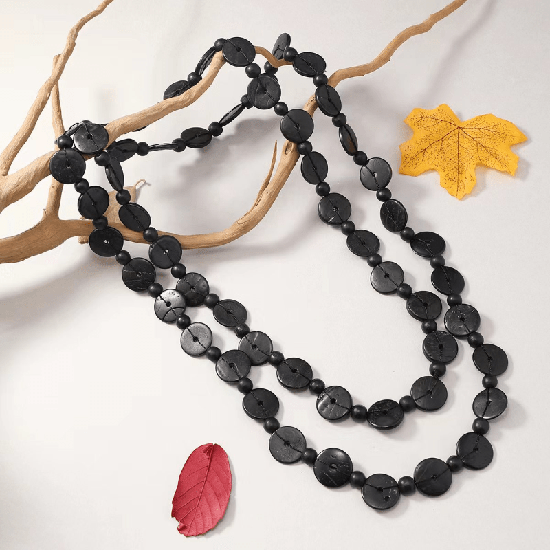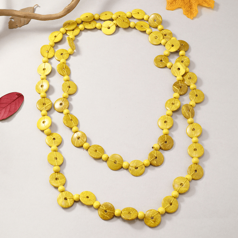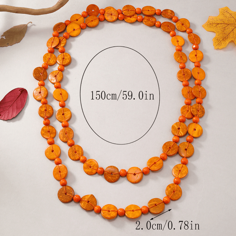 Embrace a bohemian vibe with this long sweater chain necklace made of coconut shell beads. Perfect for adding a touch of ethnic charm to your outfit.