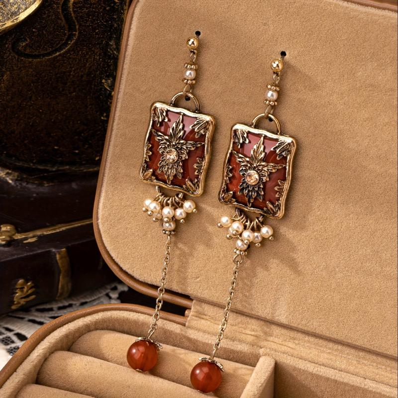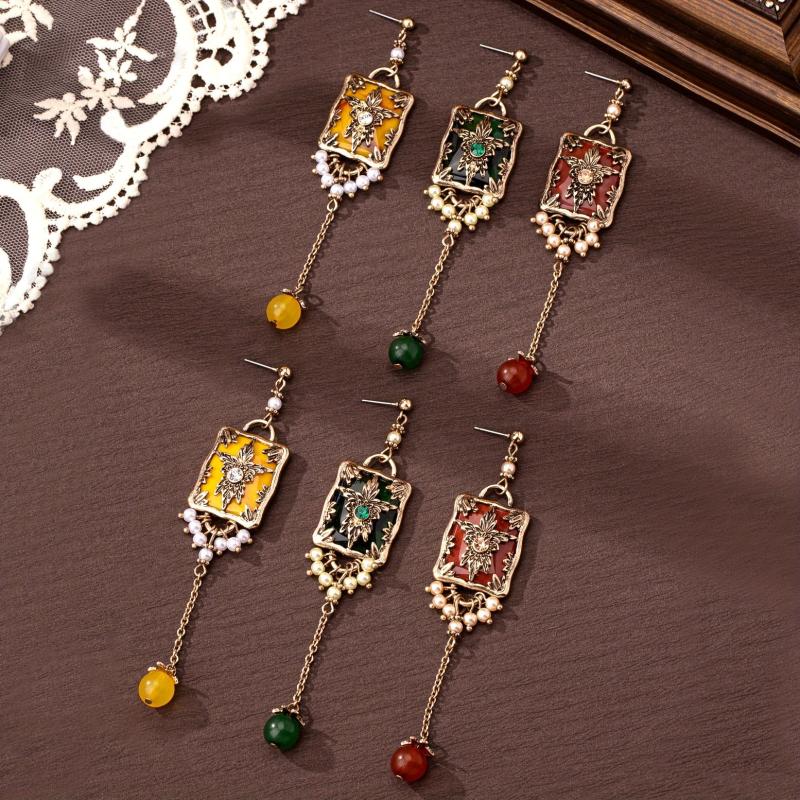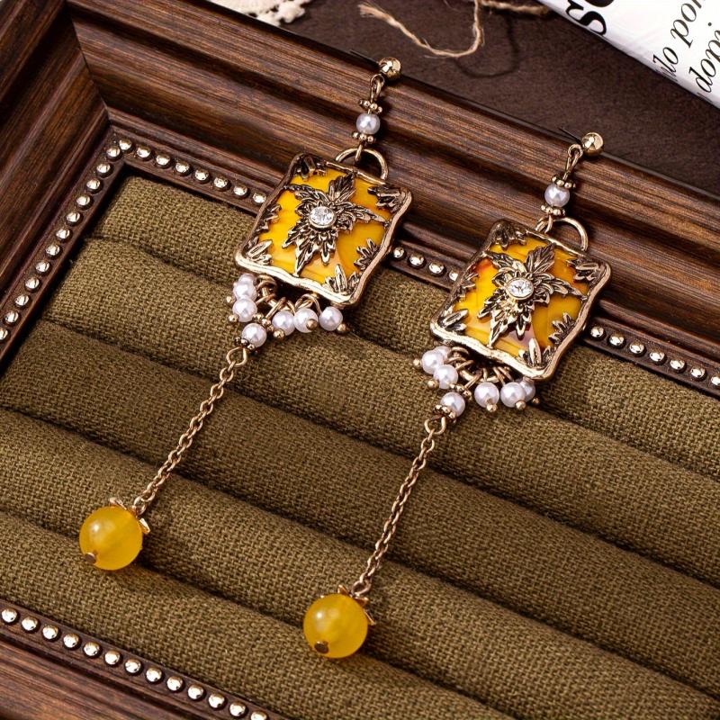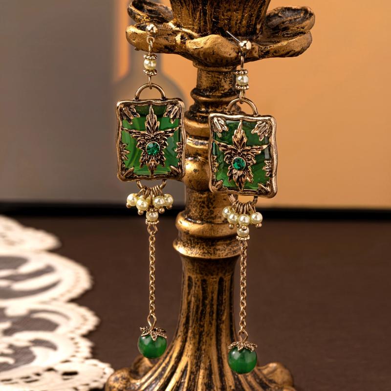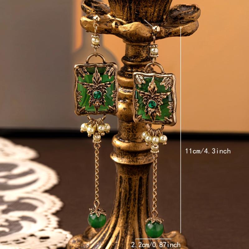Elegant vintage drop earrings made of zinc alloy with golden plating. Features rhinestone inlay, stainless steel needle, faux jade, and tassel accents for a stylish look.