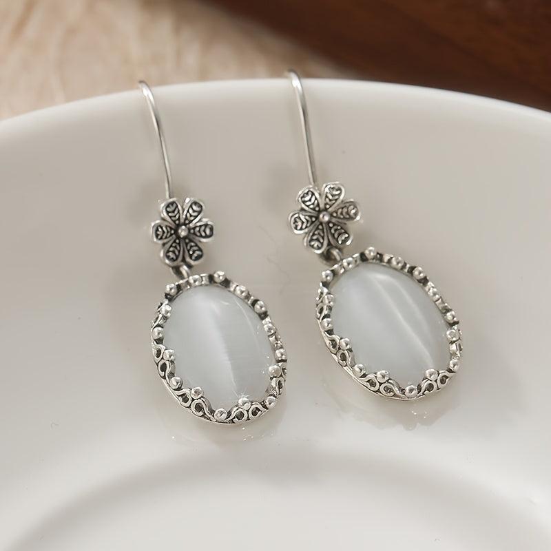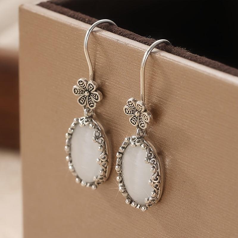 These vintage ethnic filigree dangle earrings are silvery plated chandelier style with eye-catching tiger's eye gemstones. Perfect for adding a touch of bohemian charm to any outfit.