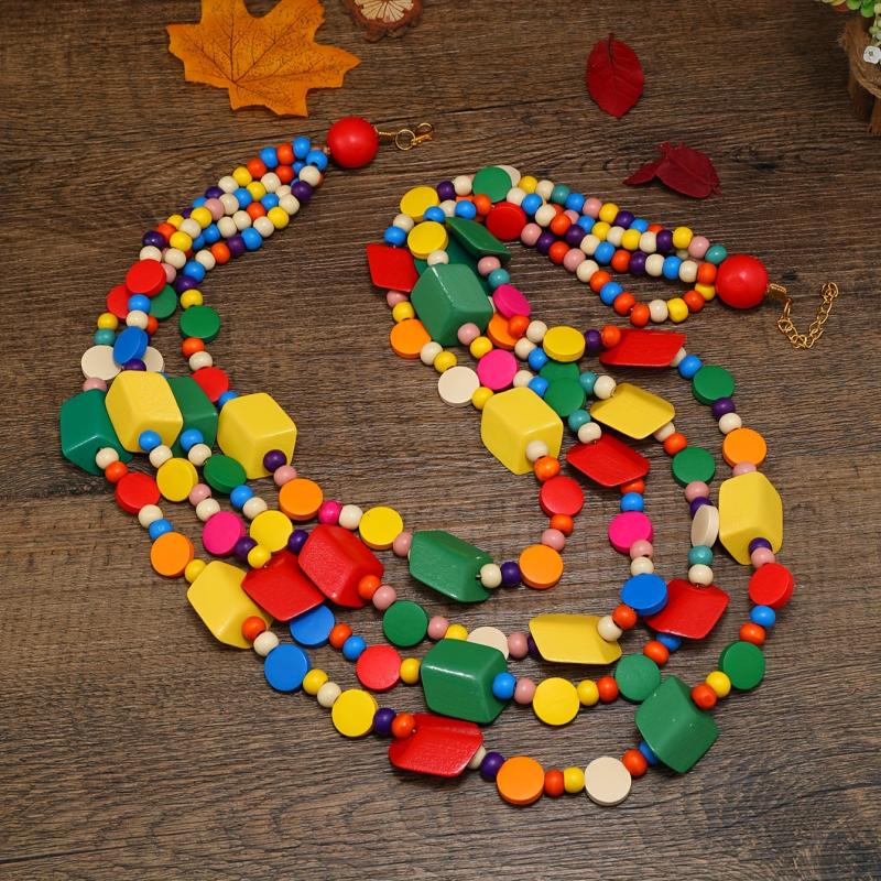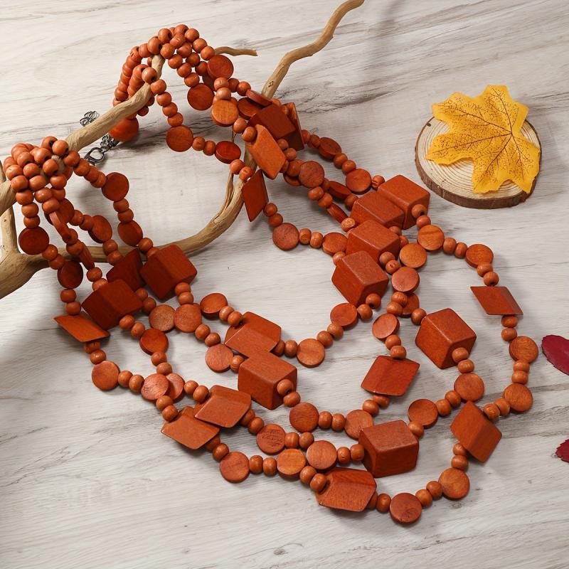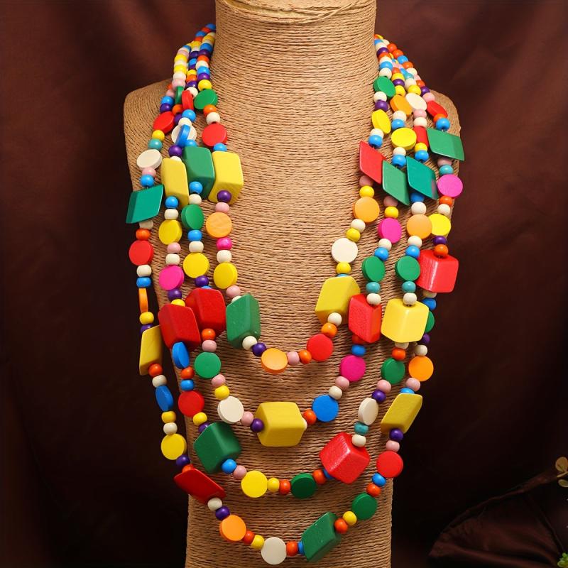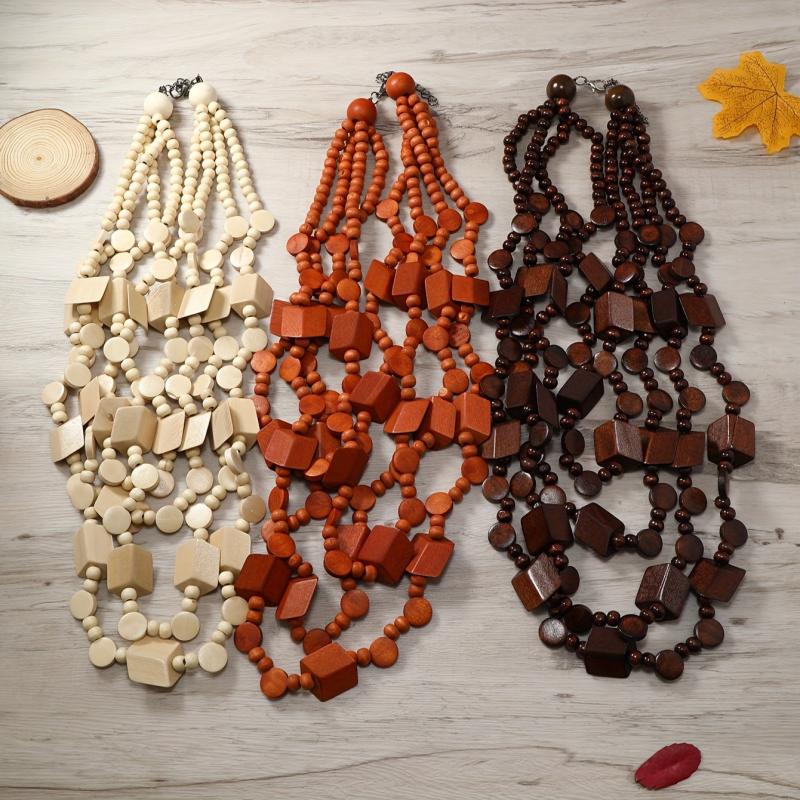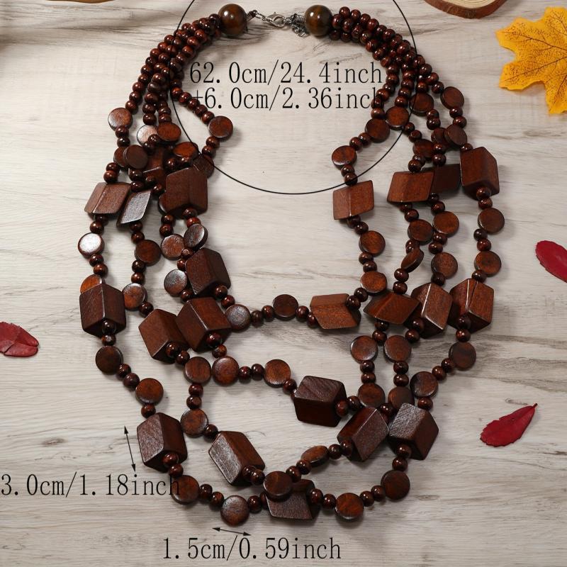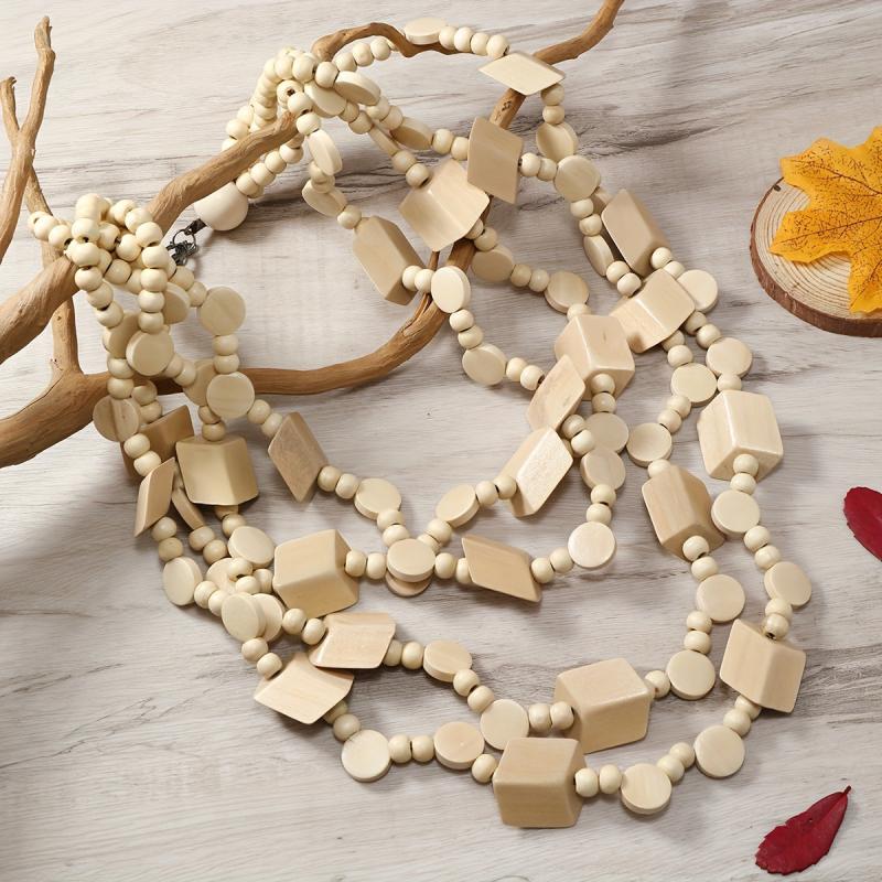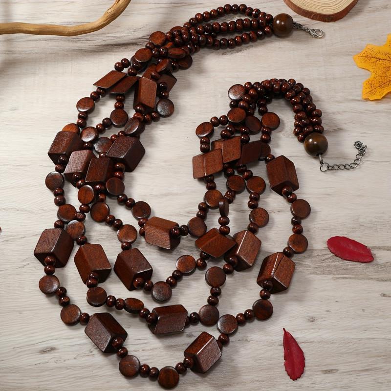 Add a unique touch to your outfit with this vintage ethnic style wooden necklace. It's a long bohemian layered sweater chain that makes a statement.