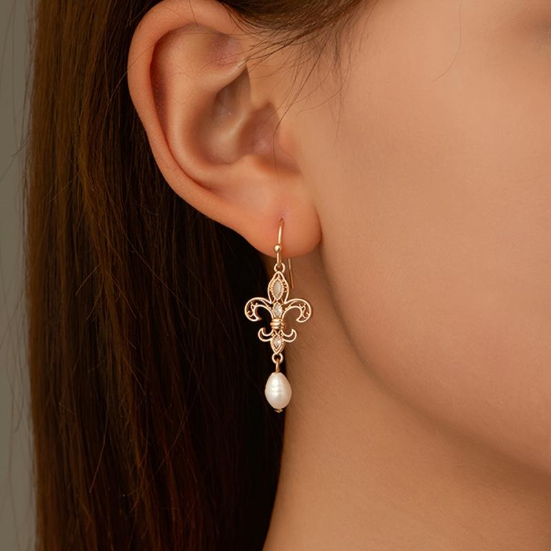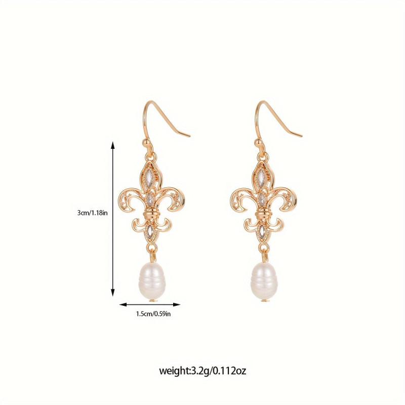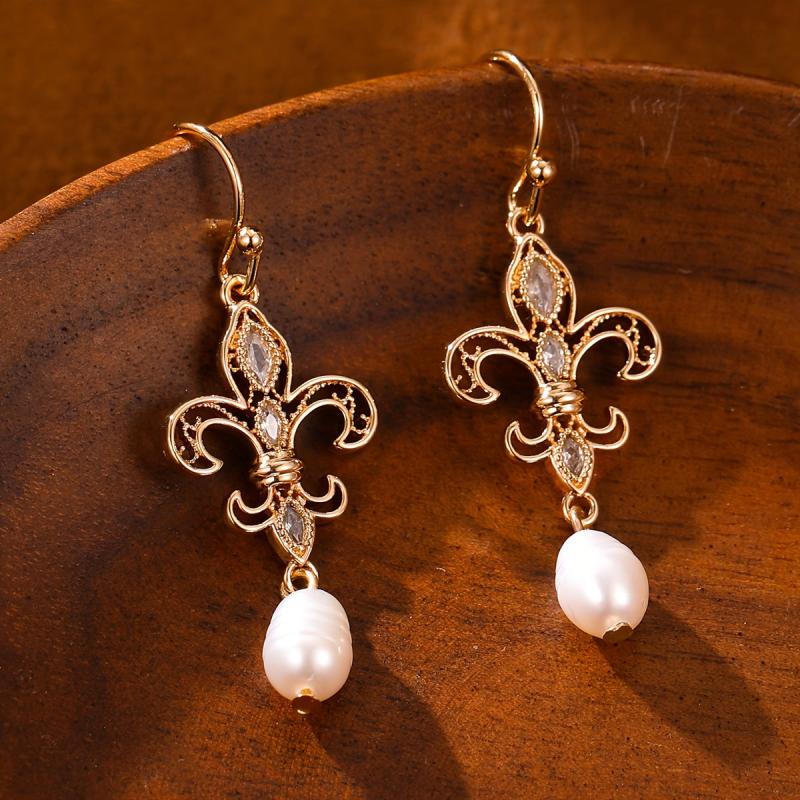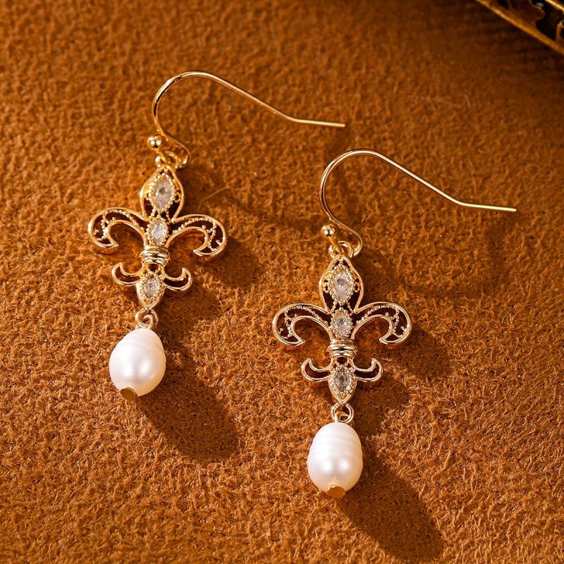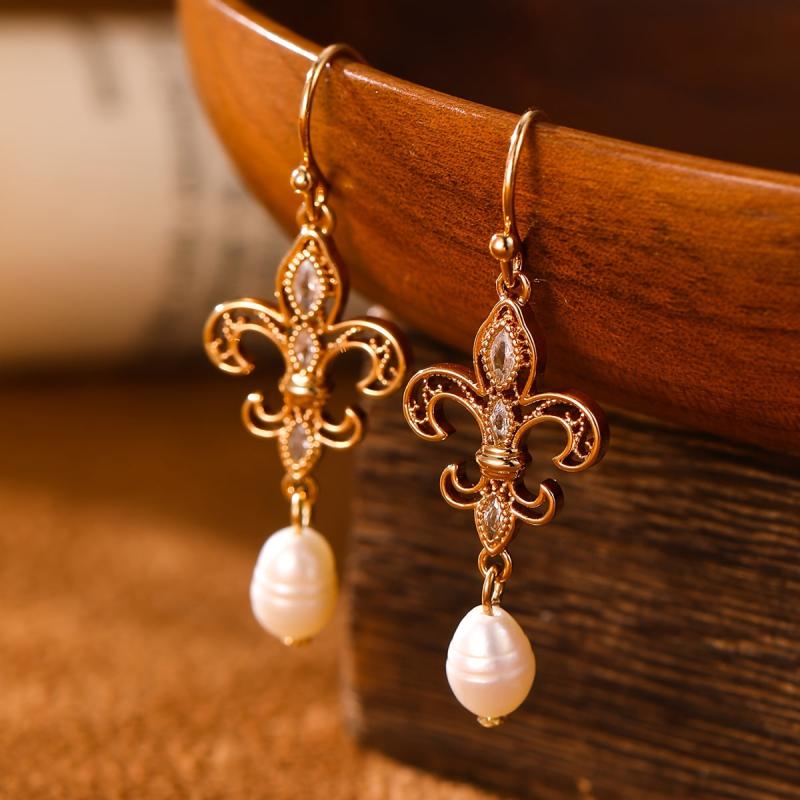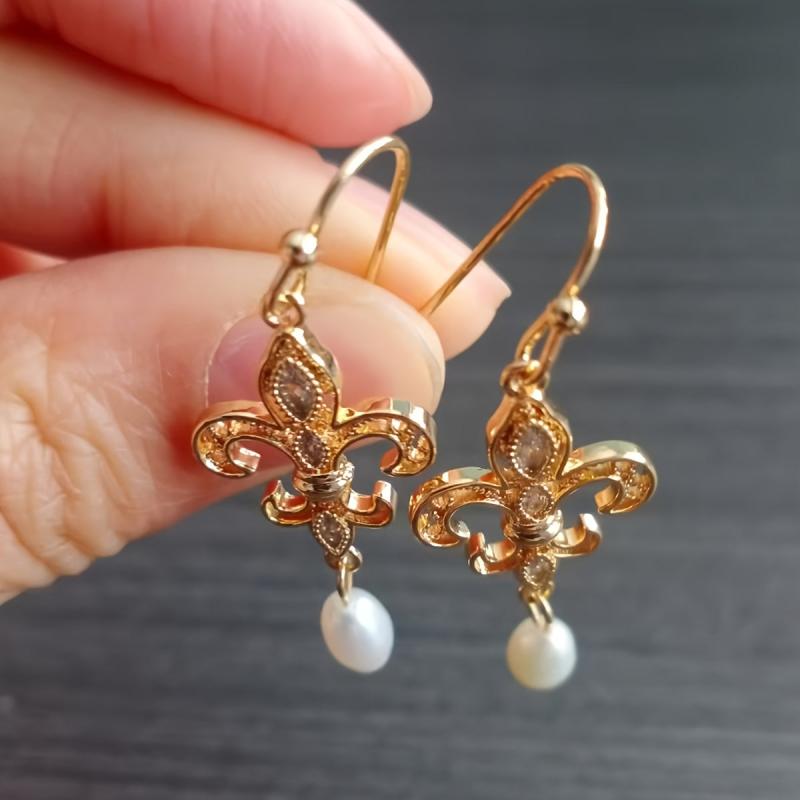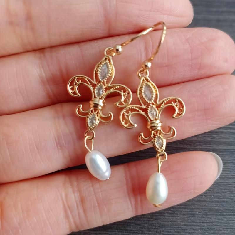 These vintage Fleur De Lis dangle earrings are crafted with 14K golden plated copper and stainless steel needles. They feature a pearl and zirconia pave set, making them perfect for weddings or special occasions.