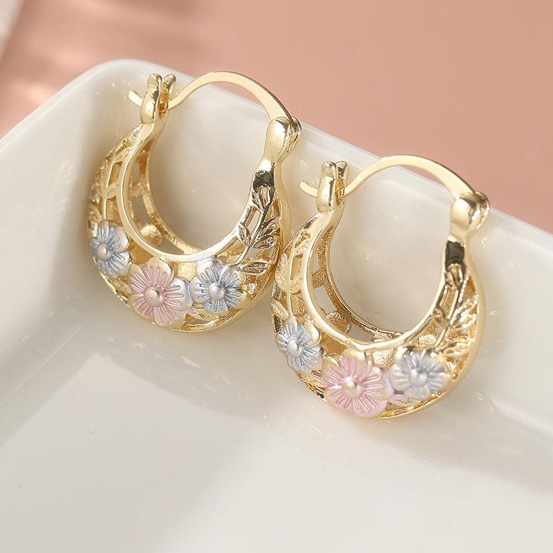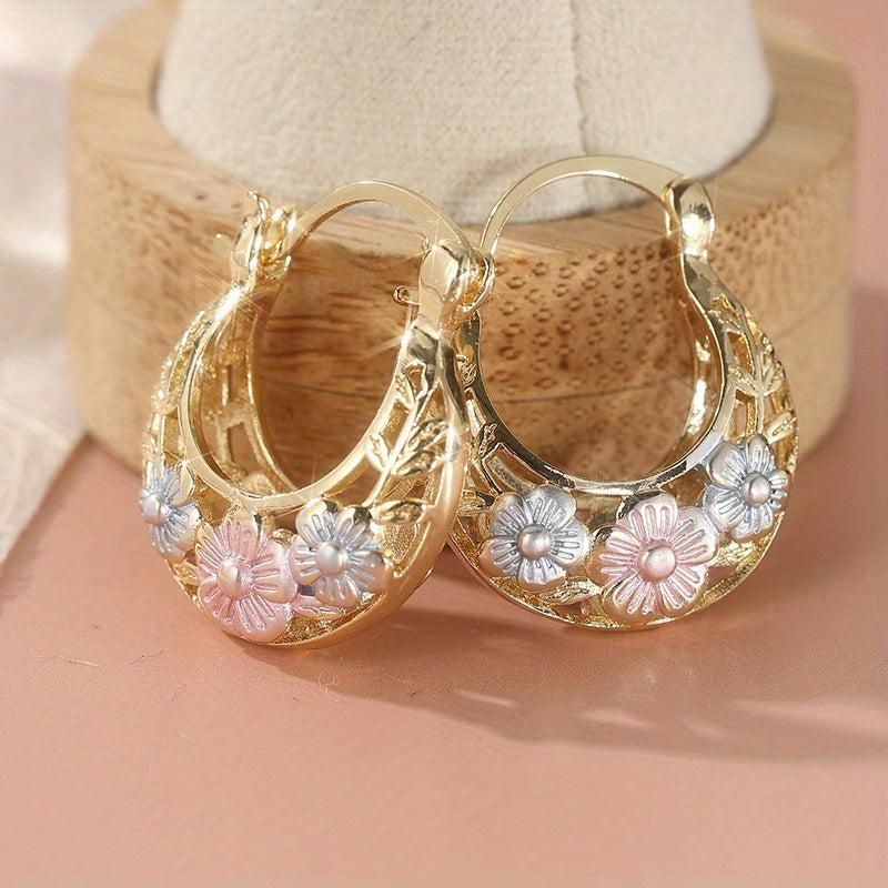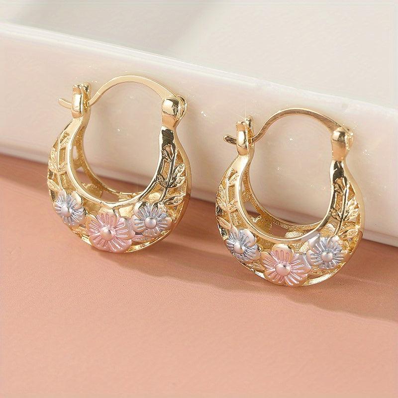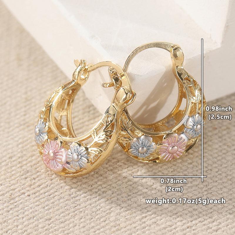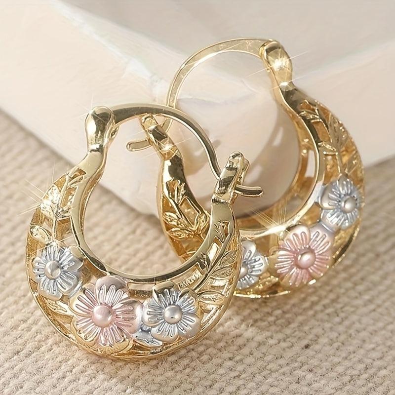 Elegant and intricate hoop earrings with vintage flower carved golden leaf design. Perfect gift for any occasion.