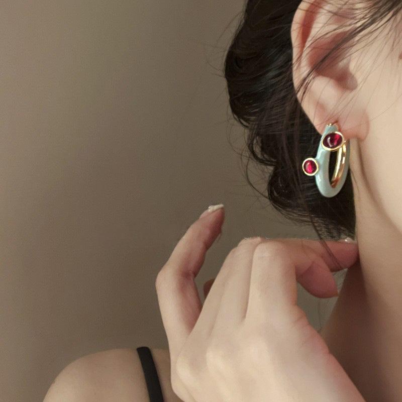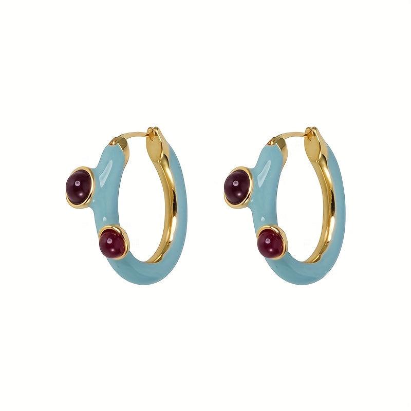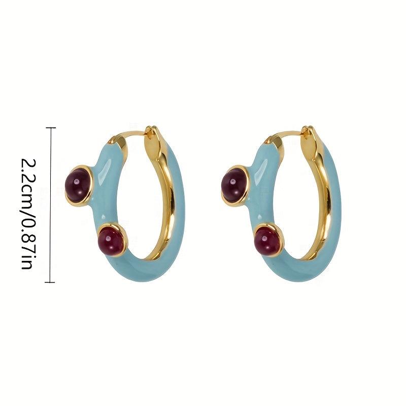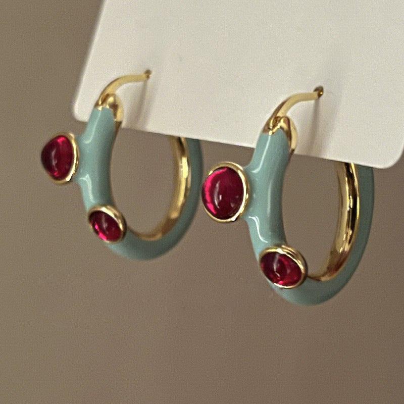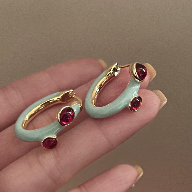 These elegant earrings feature red crystal accents in a geometric design, perfect for adding a touch of vintage French style to your look. The earrings are made with KC gold-plated alloy and come with copper posts for durability.
