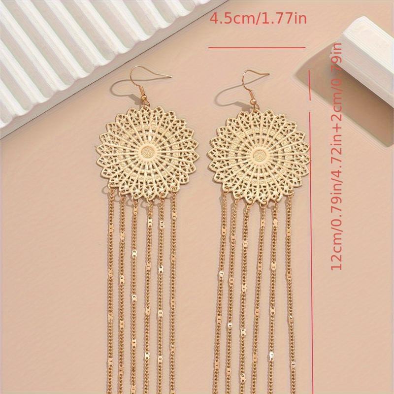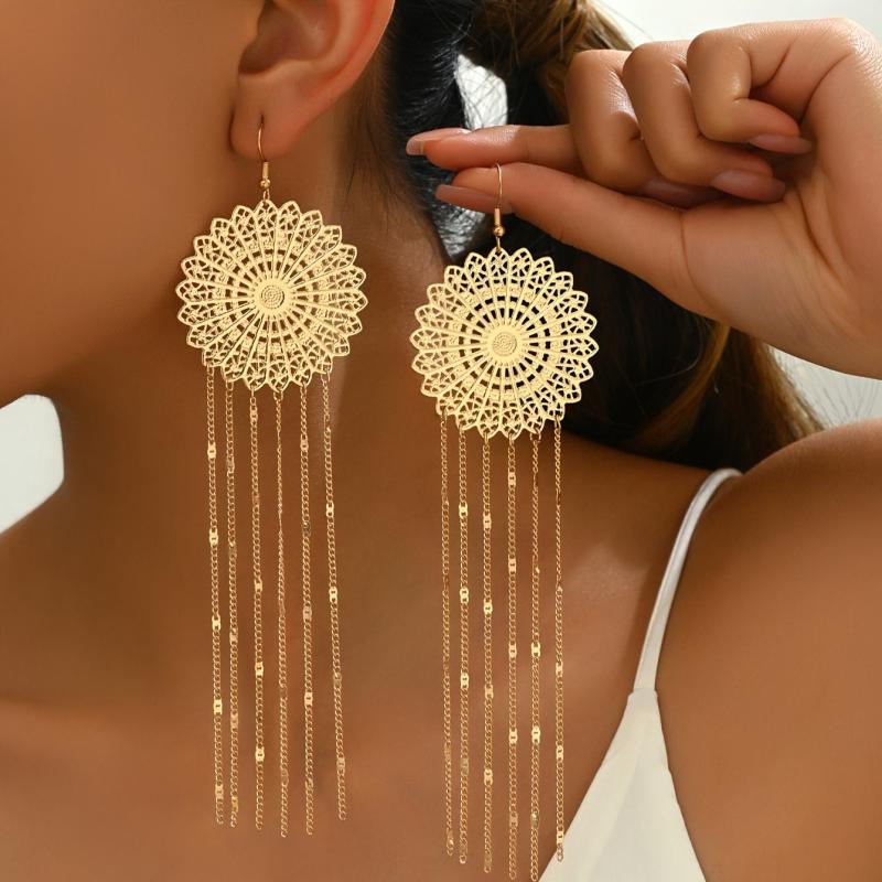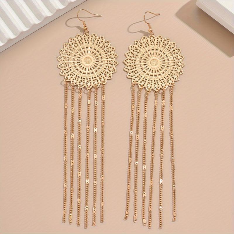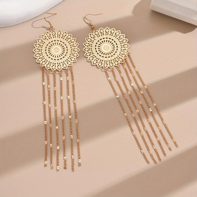 Add a touch of vintage glamour to your look with these golden geometric dangle earrings featuring tassel accents. Perfect for daily wear or special occasions.
