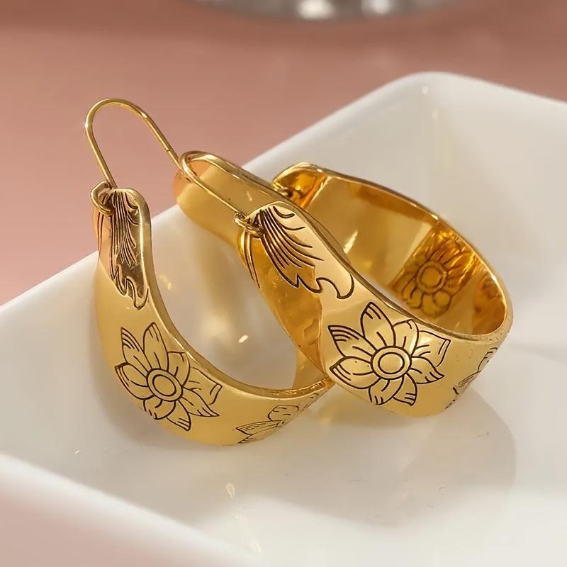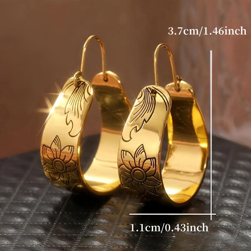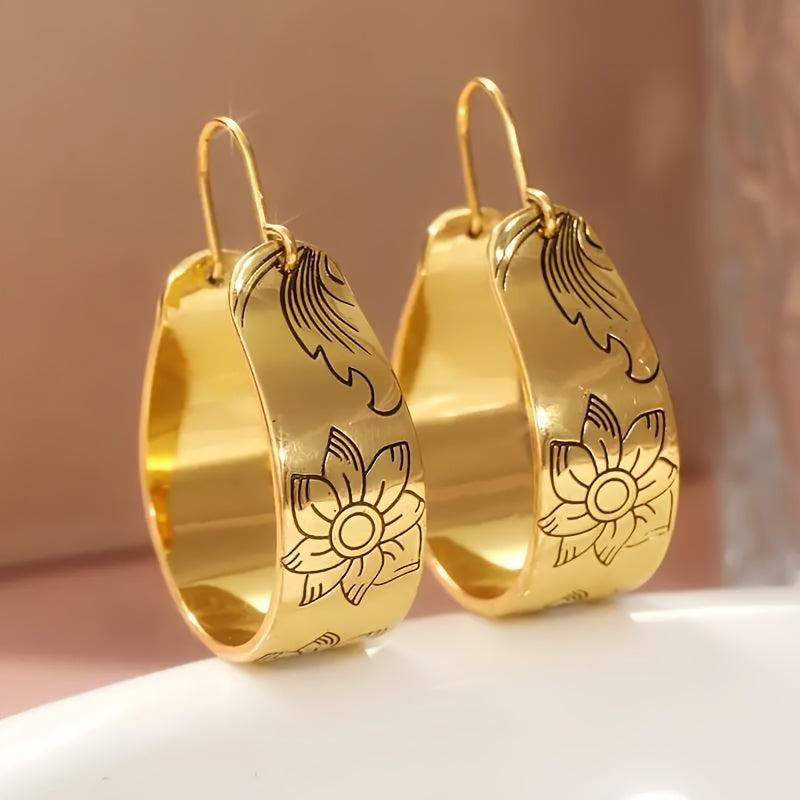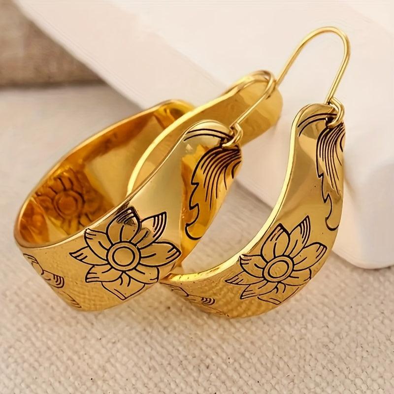 Add a touch of bohemian ethnic style to your look with these vintage golden plated hoop earrings featuring a lotus flower design. Perfect for daily wear, parties, weddings, and other occasions.