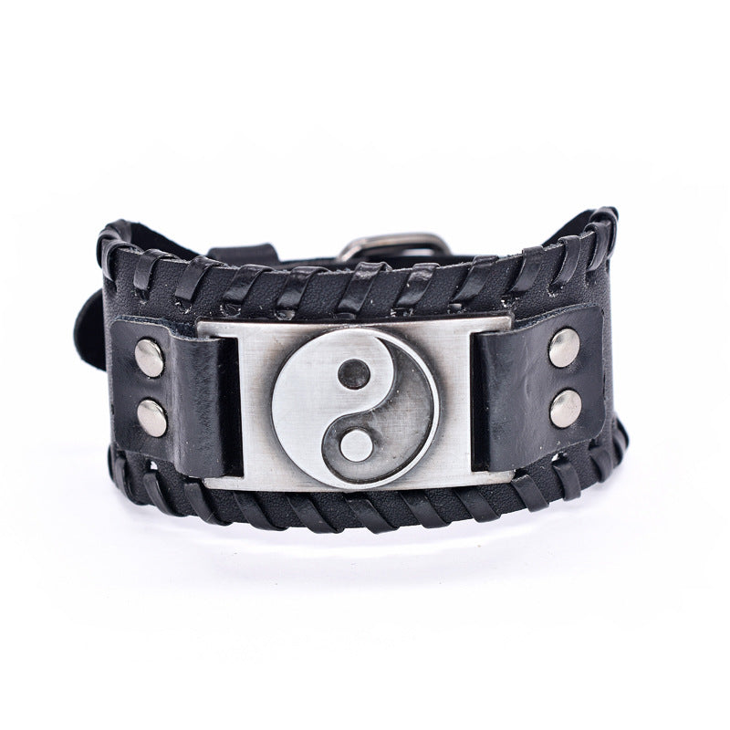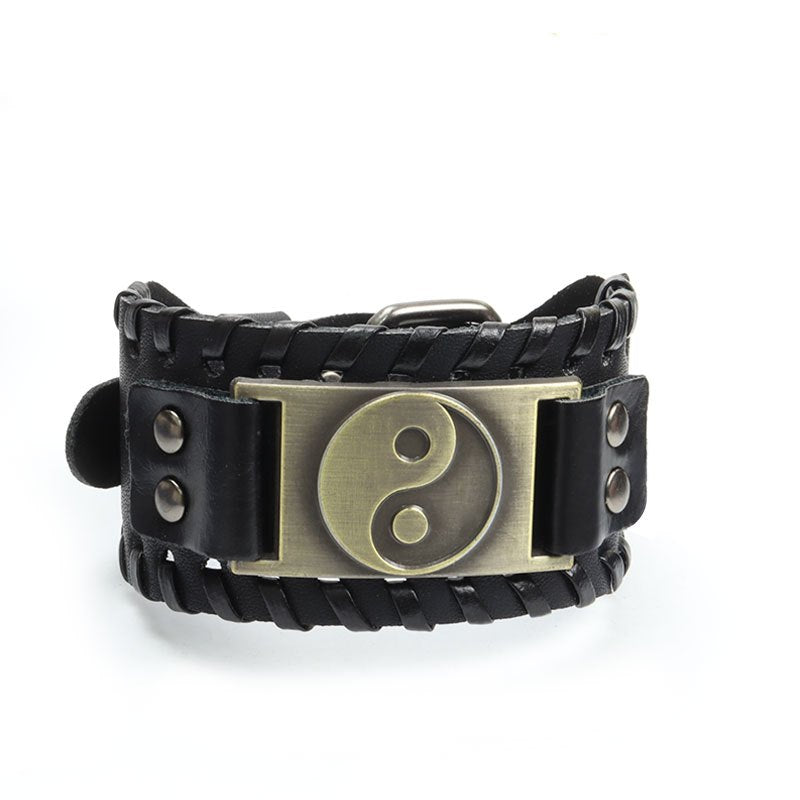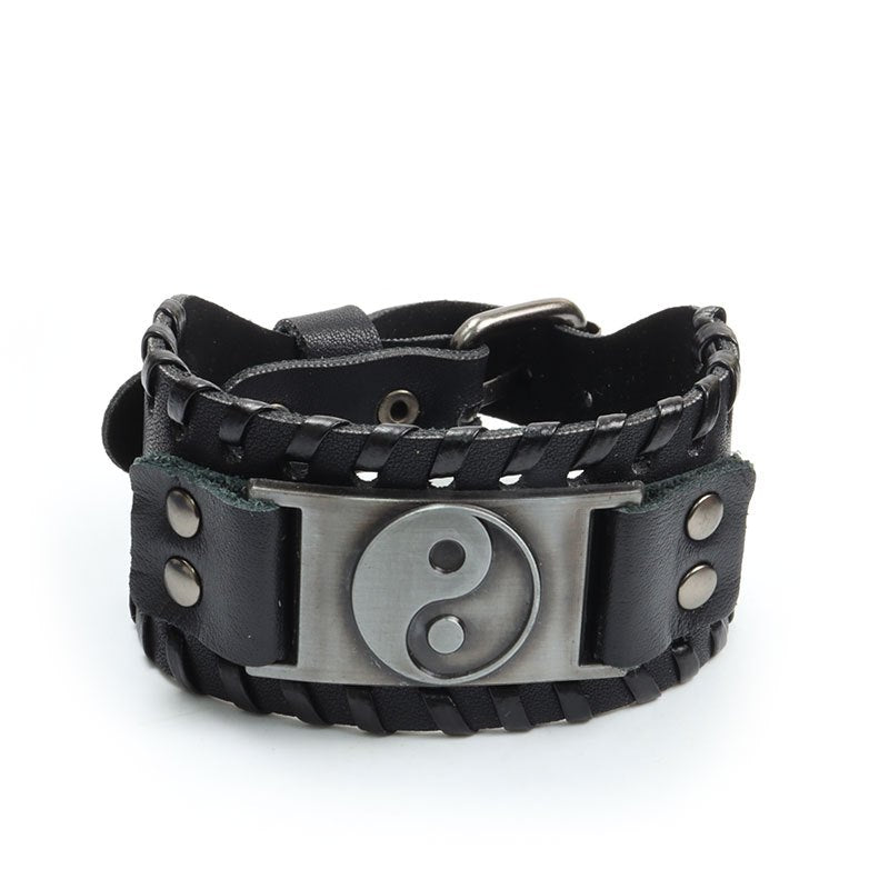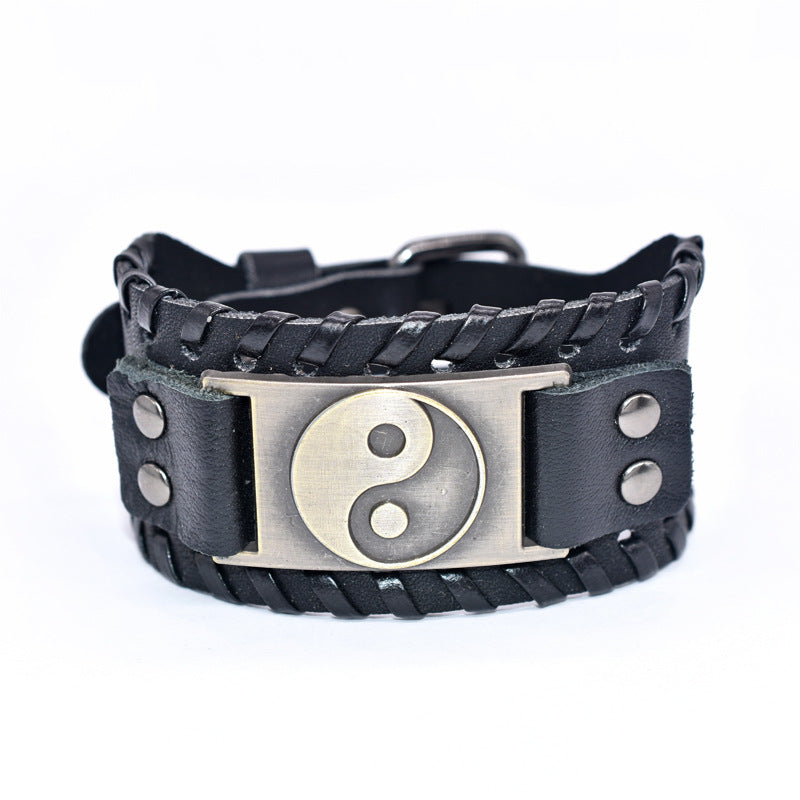 Add a touch of vintage style with this wide leather bracelet featuring an adjustable braided strap and a classic buckle closure for a secure fit.