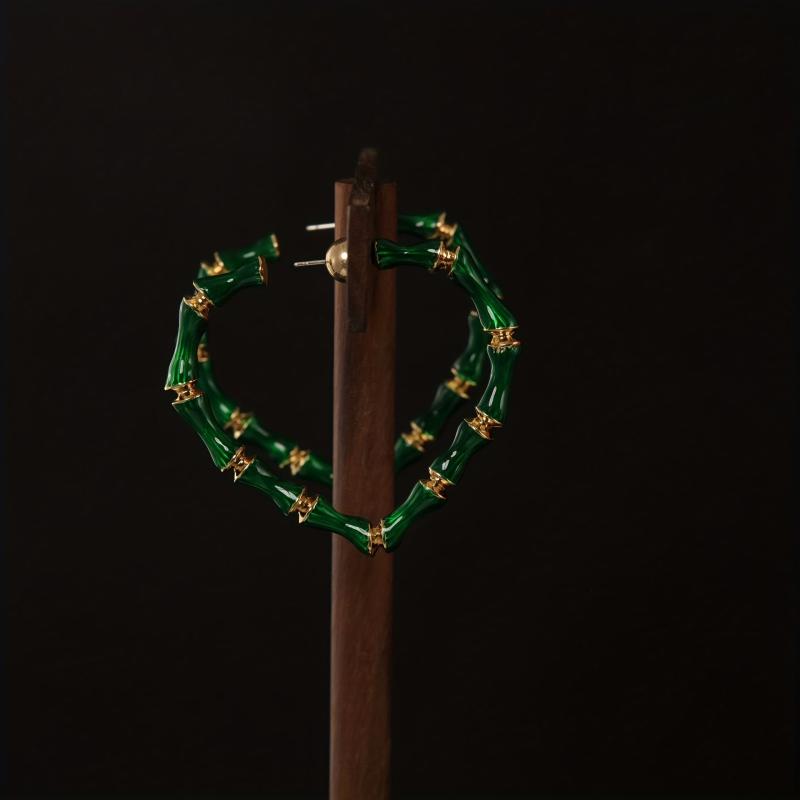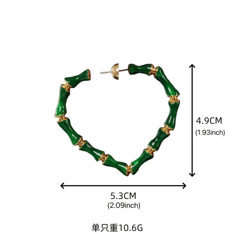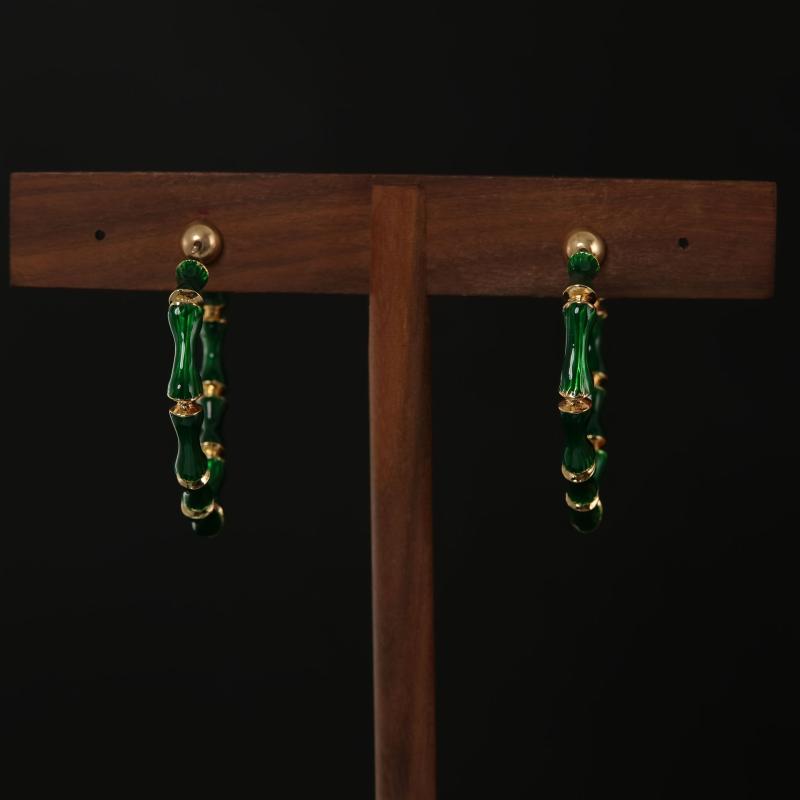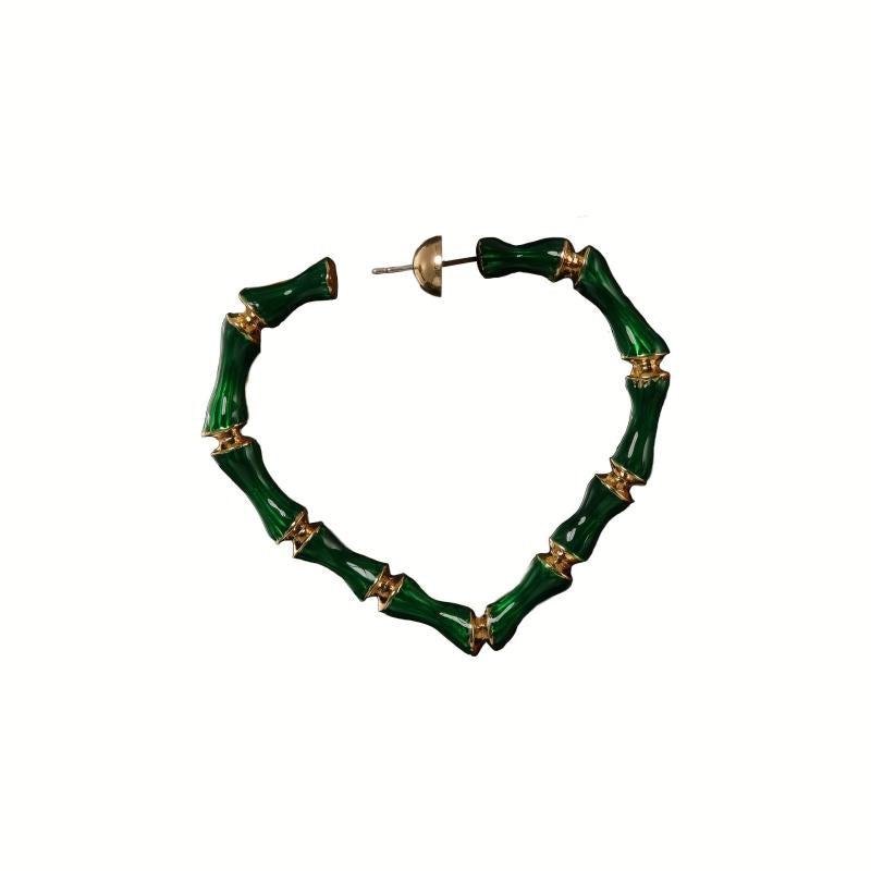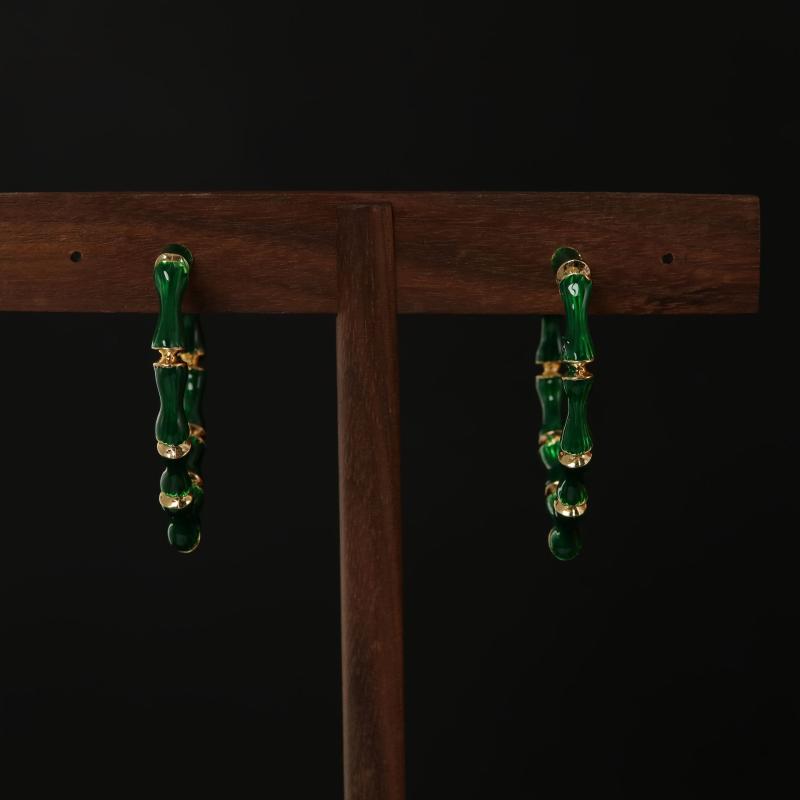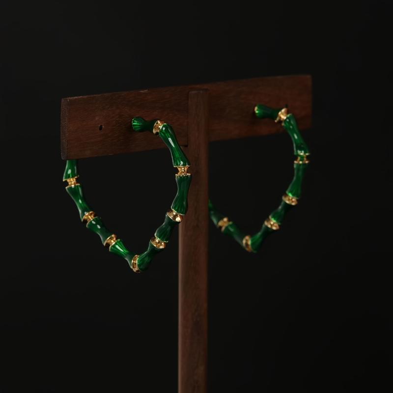These unique earrings feature a pair of green enamel bamboo joint hearts with 22K plated golden accents, inspired by traditional Chinese design. Versatile for daily wear.