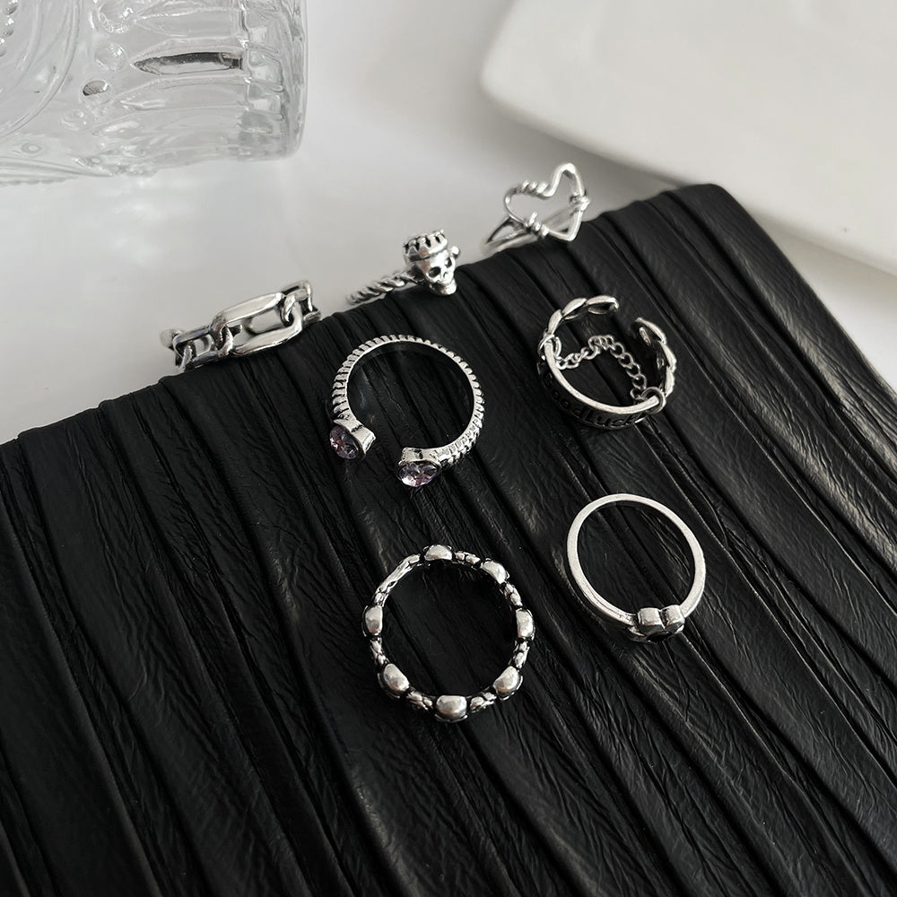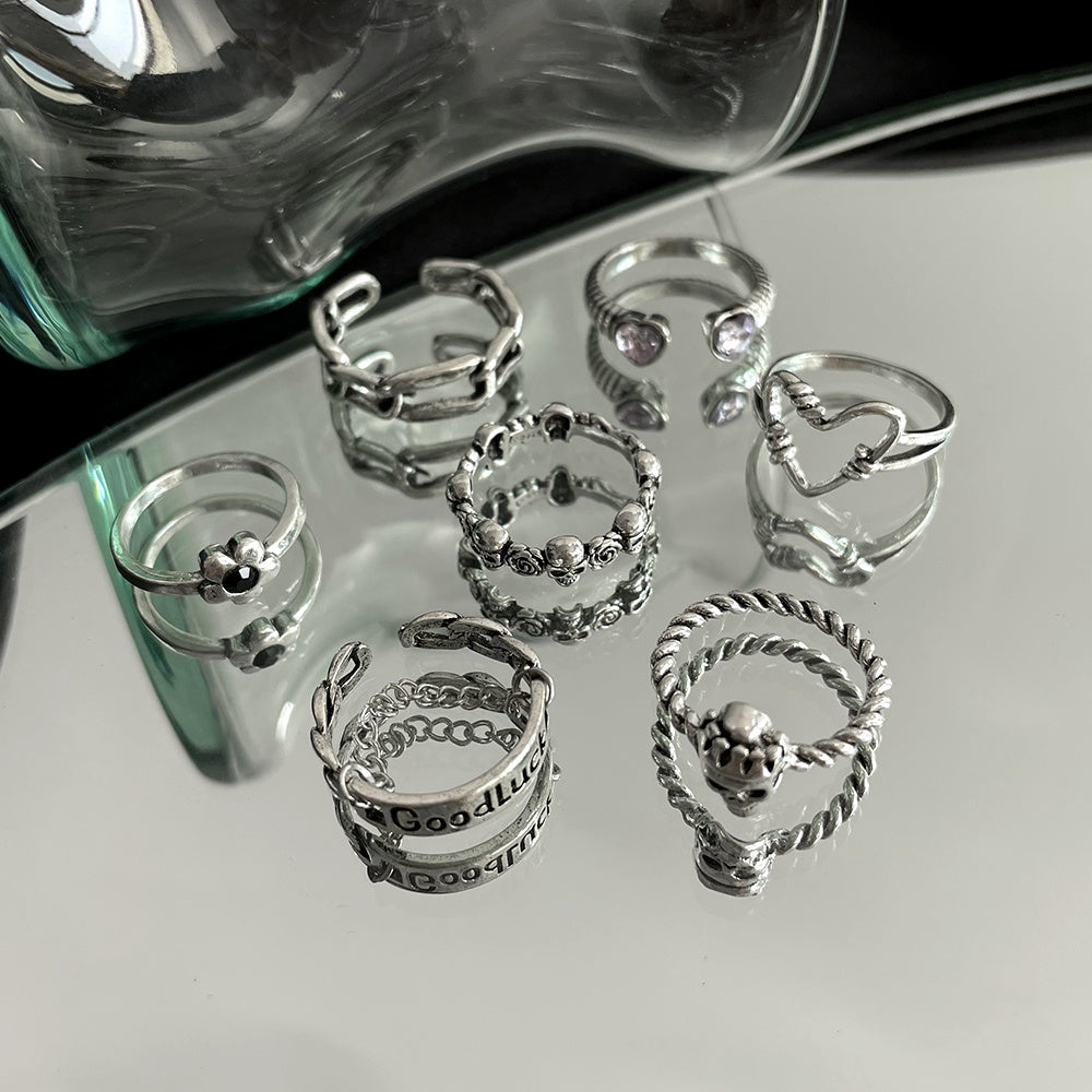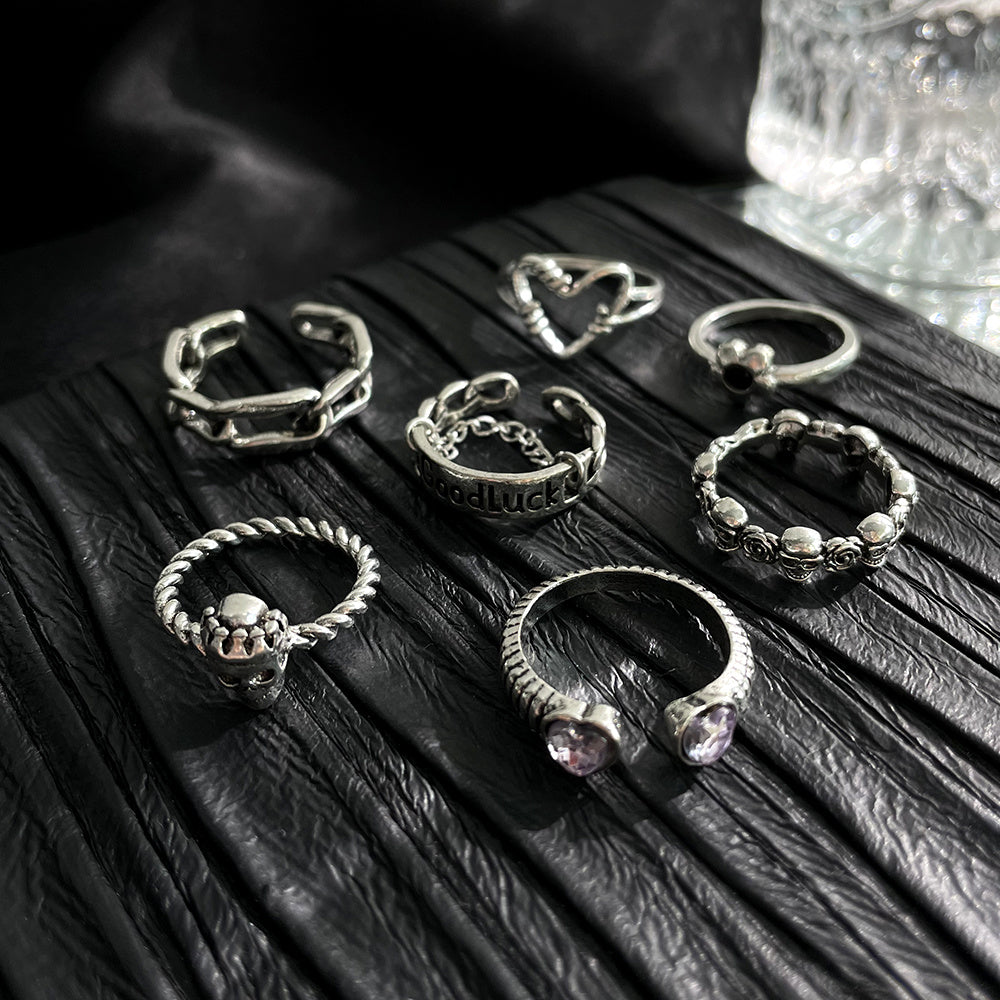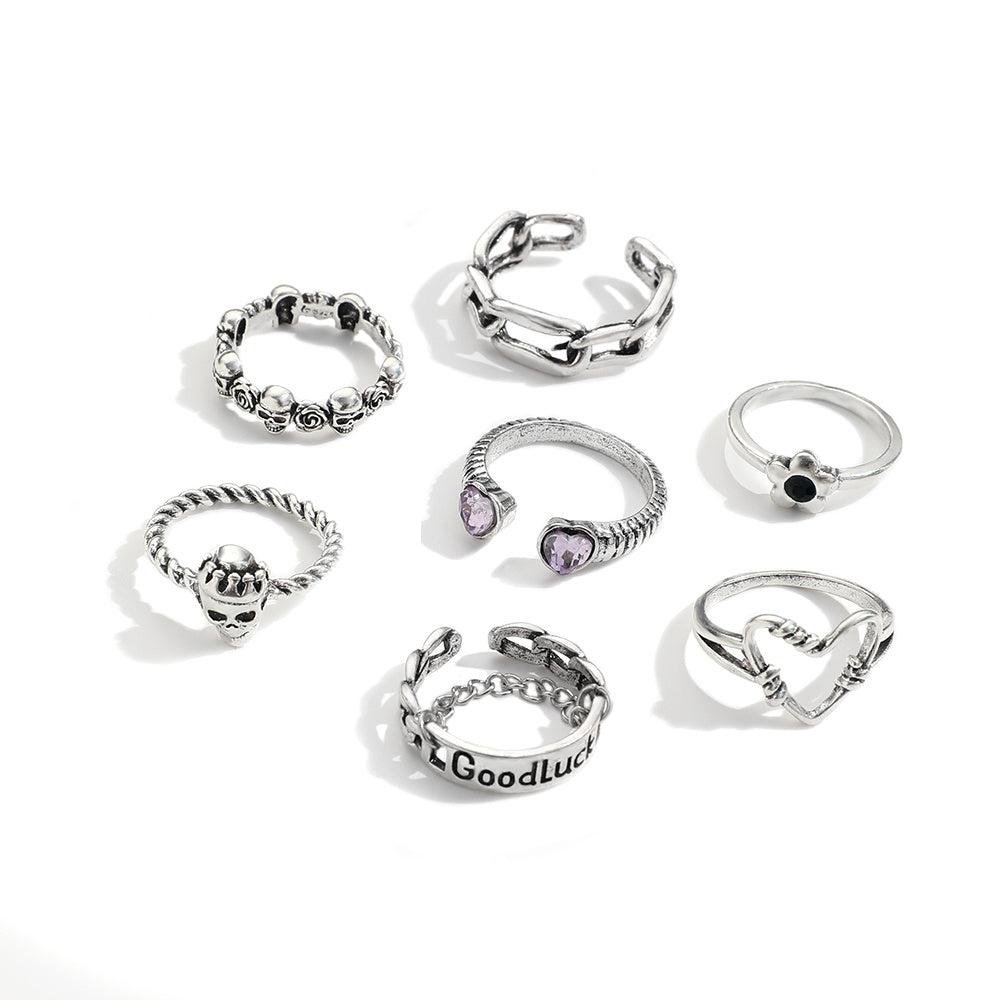 This set includes 7 stylish rings with vintage heart, letter, skull, and flower designs. Perfect addition to your accessory collection.