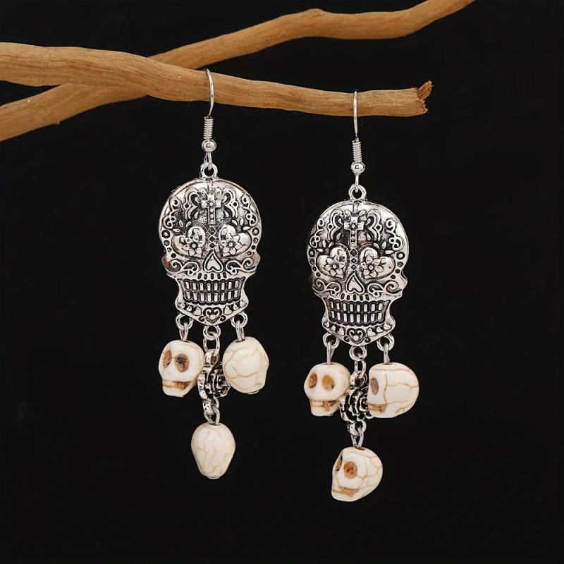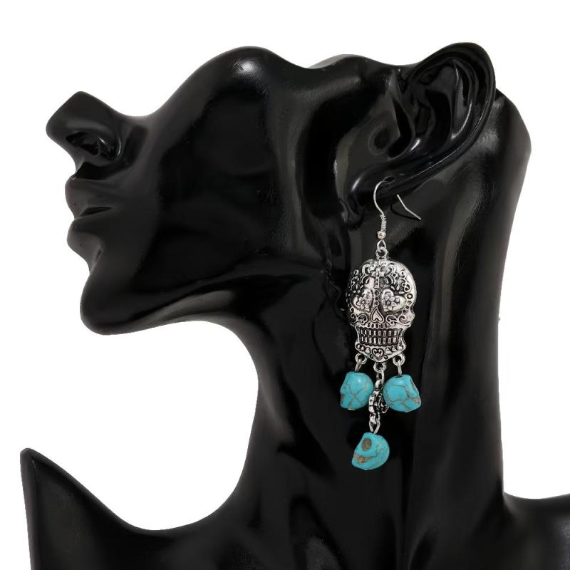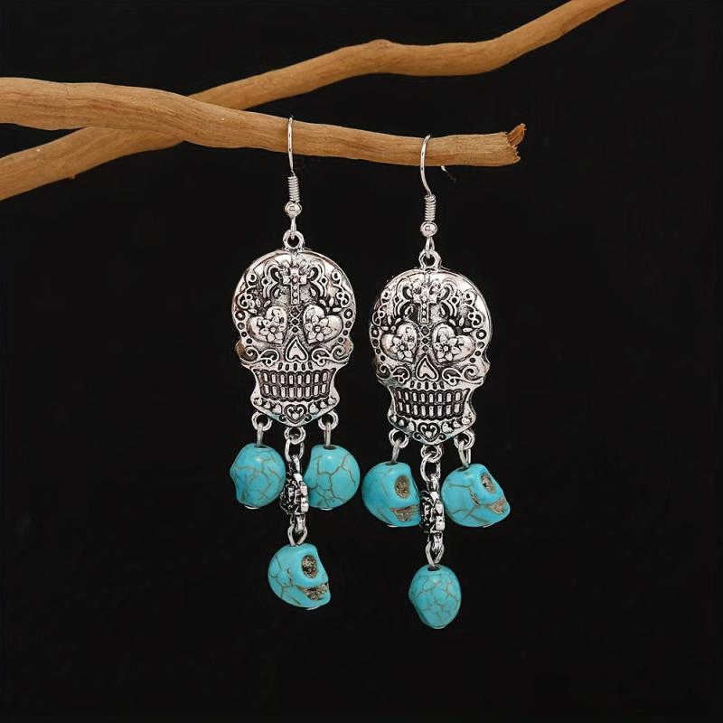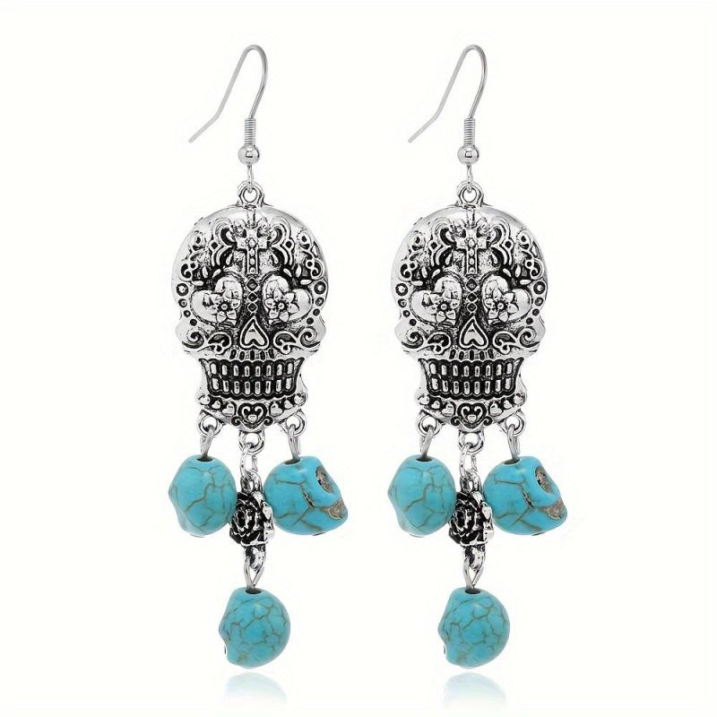 Vintage Hip Hop Skull Earrings with Turquoise Mosaic, Halloween Gift