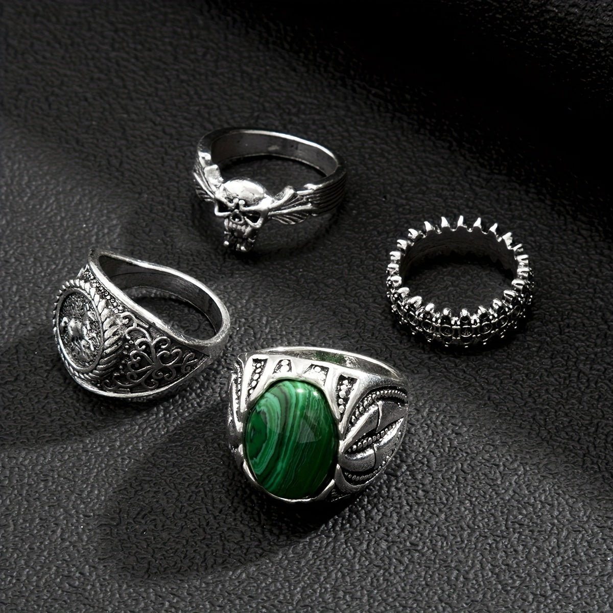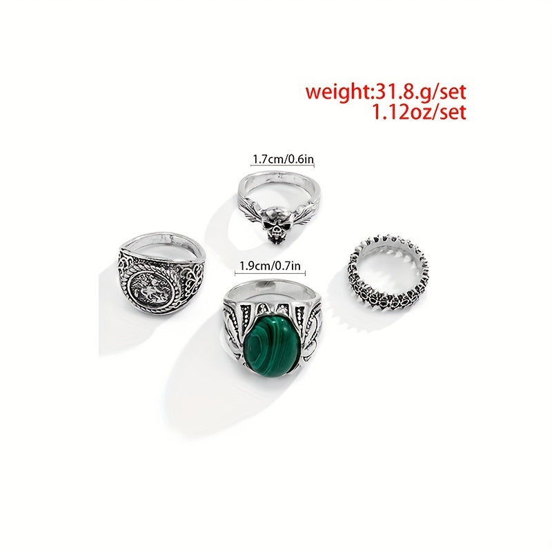Elevate your style with this 4-piece vintage Malachite ring set featuring a striking skull design and unique detailing.