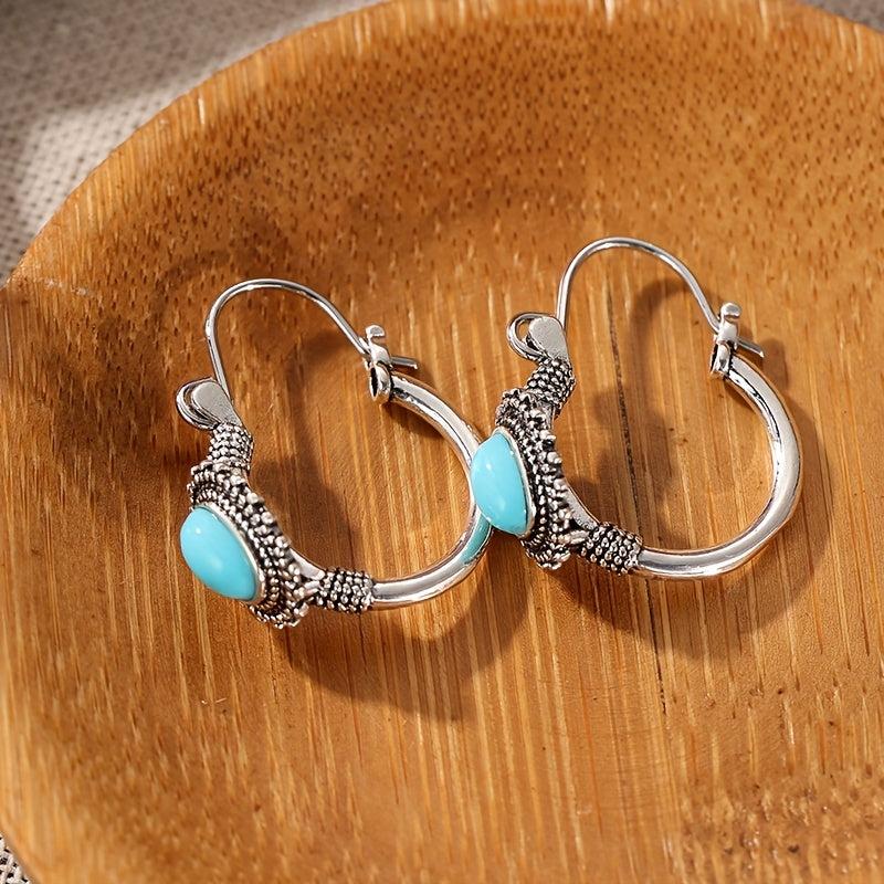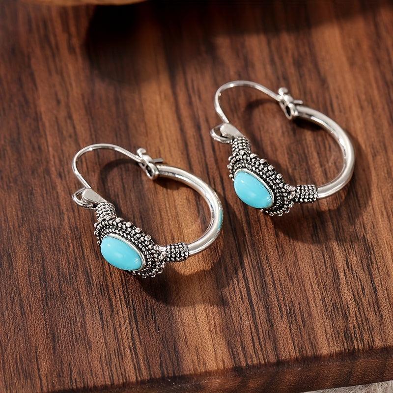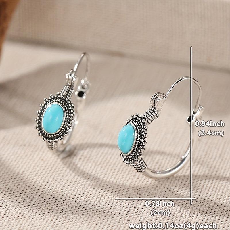 Golden plated earrings with oval synthetic turquoise stones, perfect for women who love boho style jewelry. Ideal for weddings and vacations.