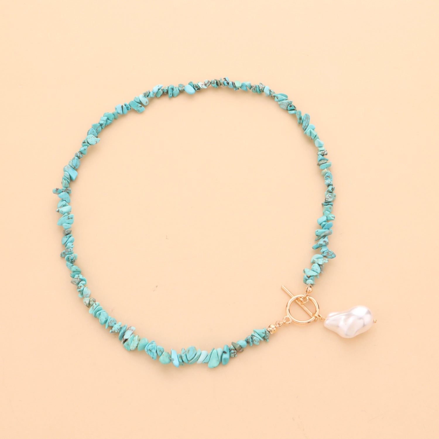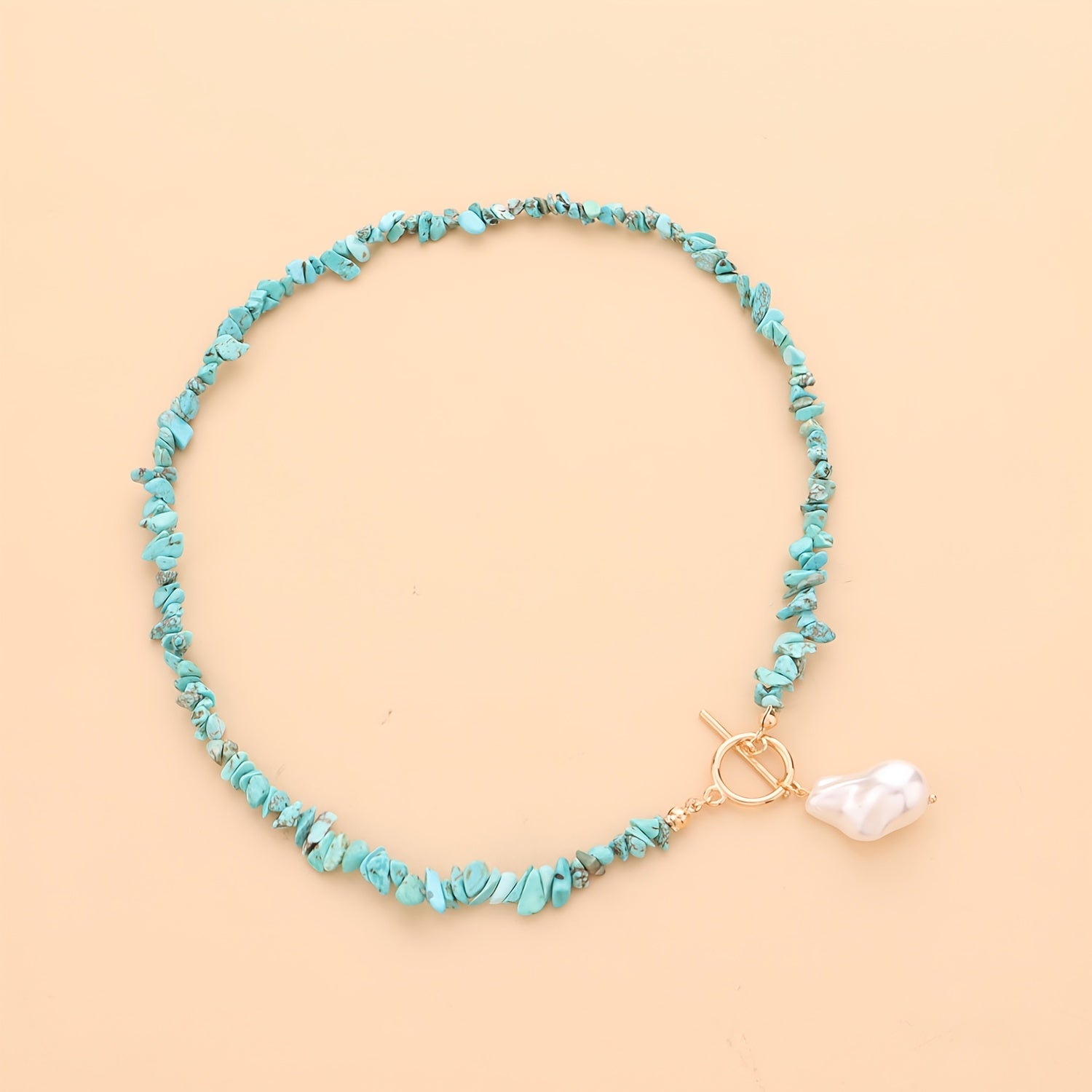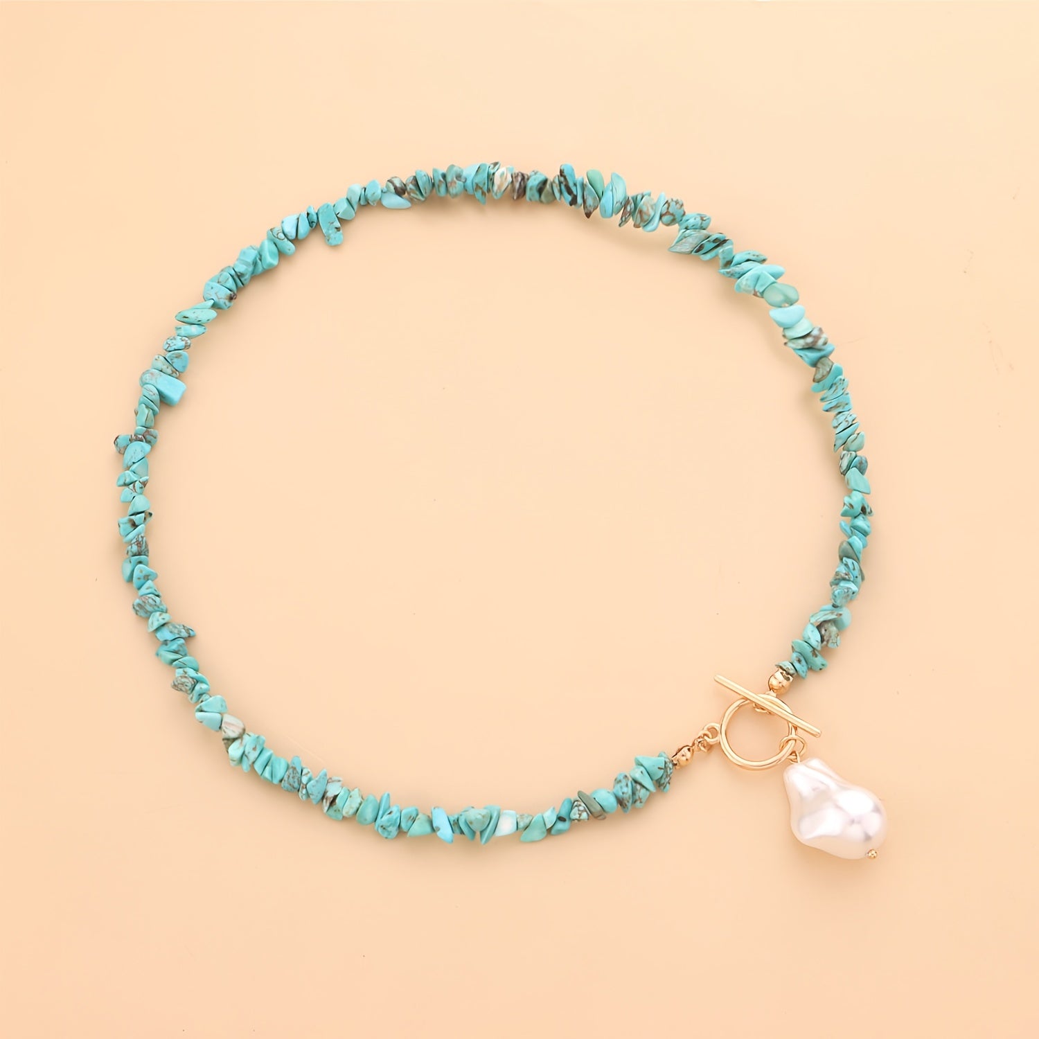 This necklace features a vintage pearl pendant with turquoise beads in a boho ethnic style. A beautiful accessory for women's jewelry collection.