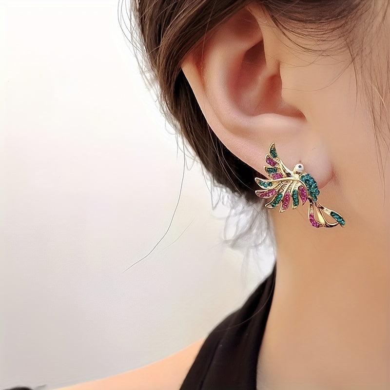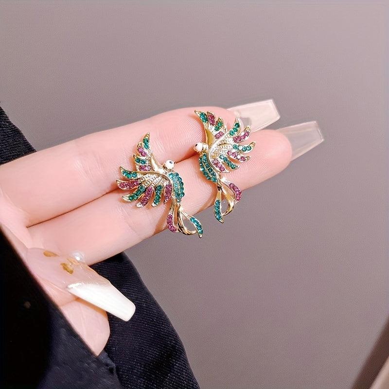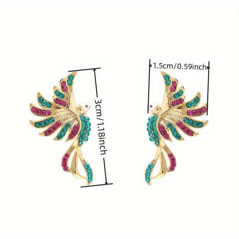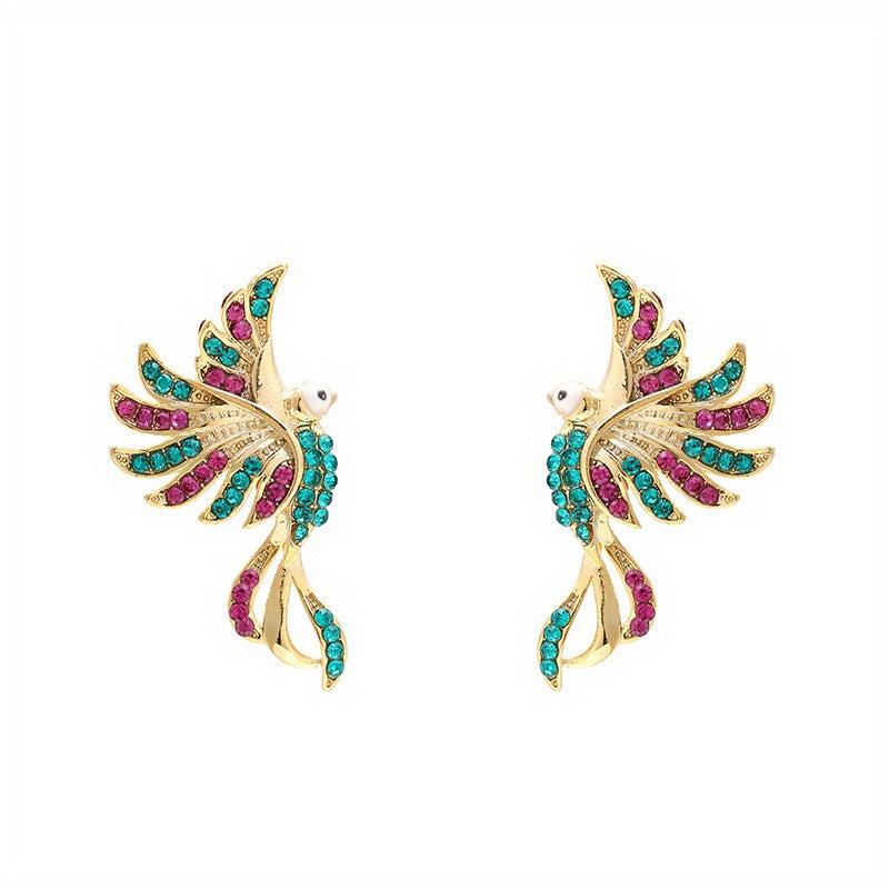 Elegant pair of vintage-inspired earrings featuring a phoenix bird design with sparkling synthetic cubic zirconia and pink stones. Ideal for formal events and special occasions.