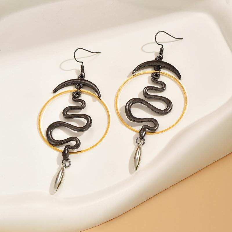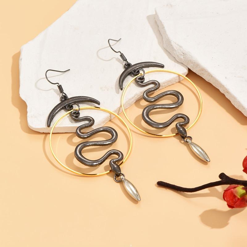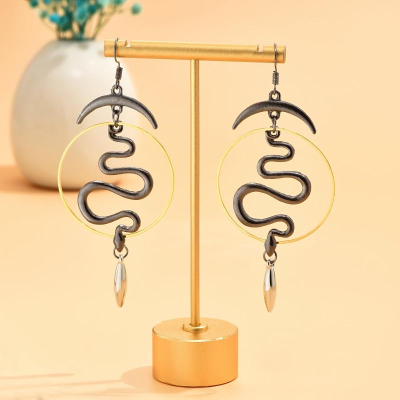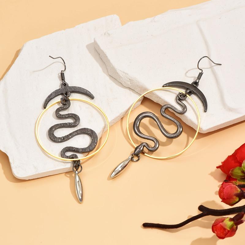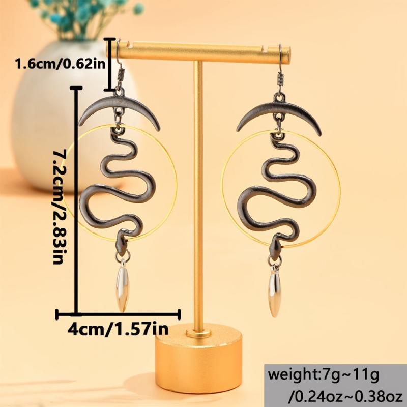 Add a touch of bohemian style with these vintage silvery dangle earrings featuring cutout moon and snake patterns. Ideal gift for women.