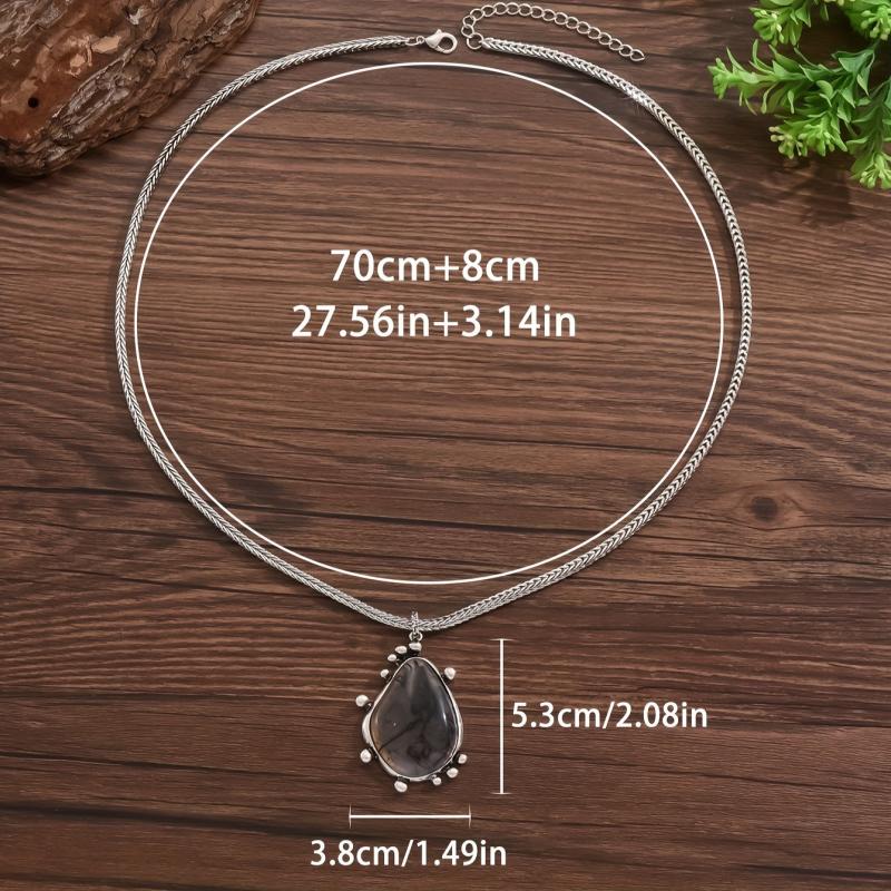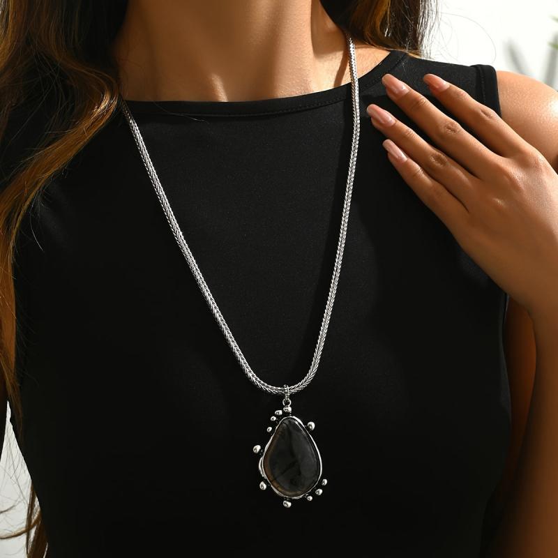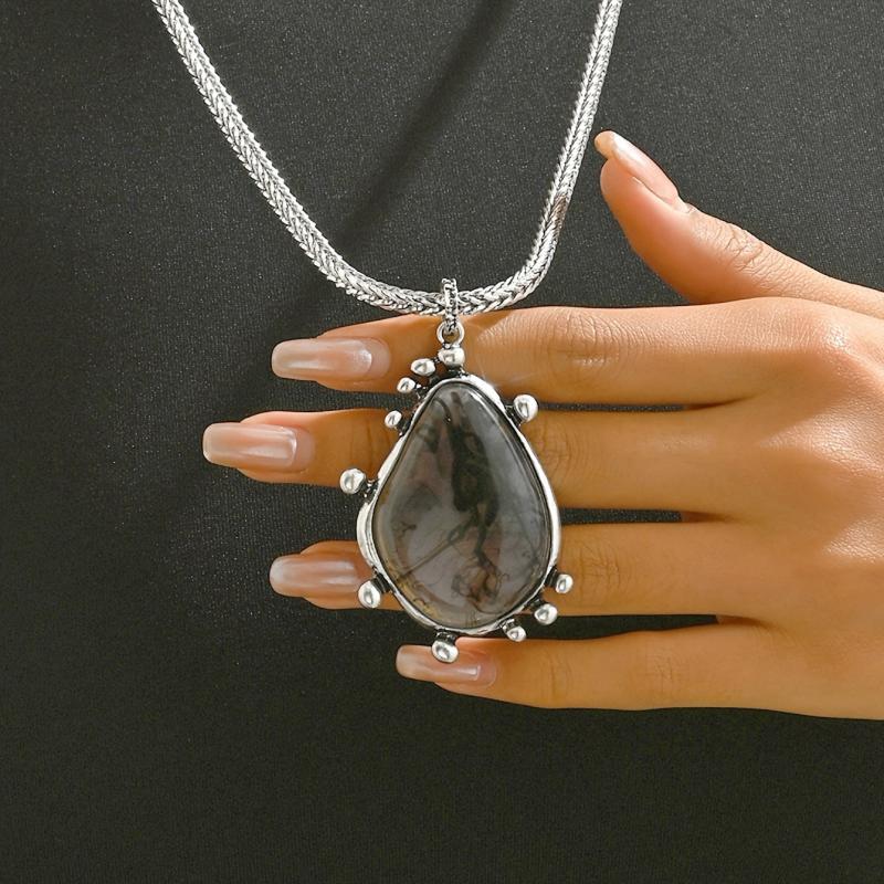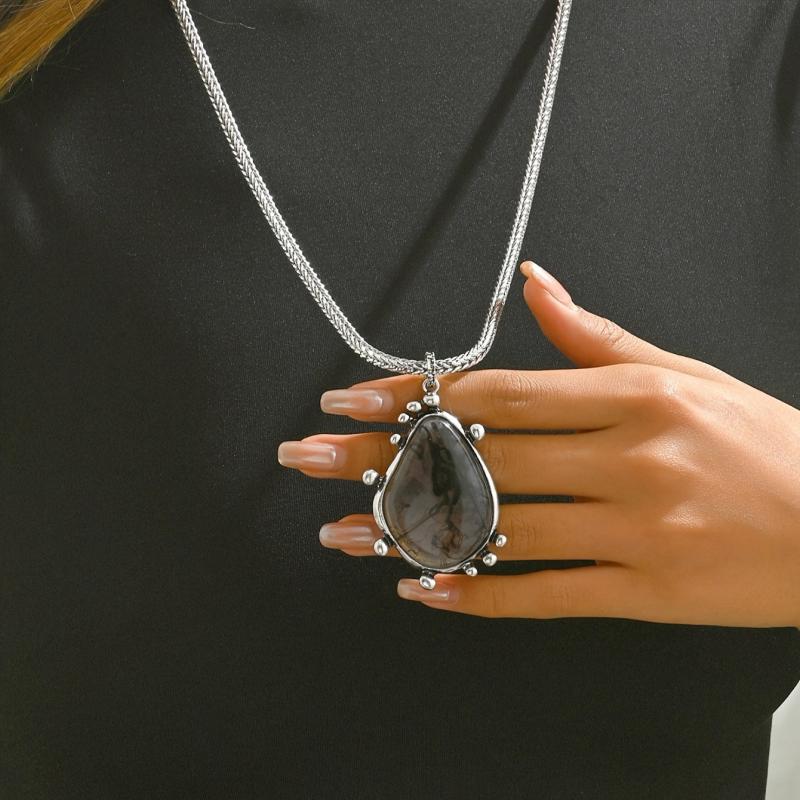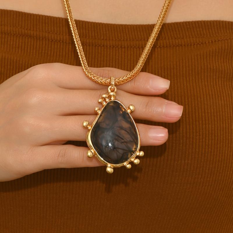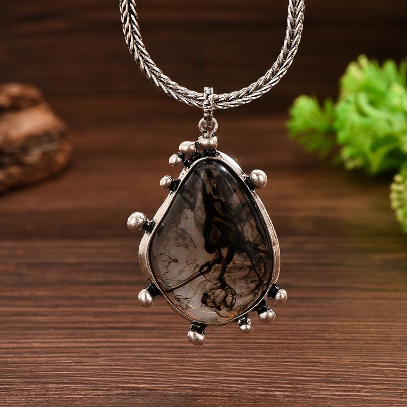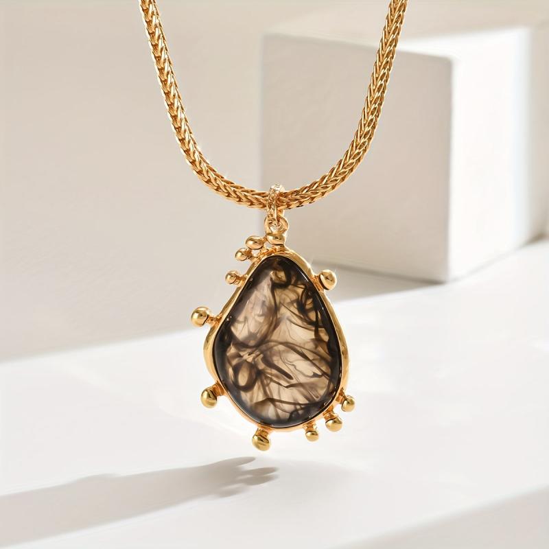 Elegant necklace featuring herringbone chain, ink flower pattern, and water droplet shaped metal piece with resin pendant.