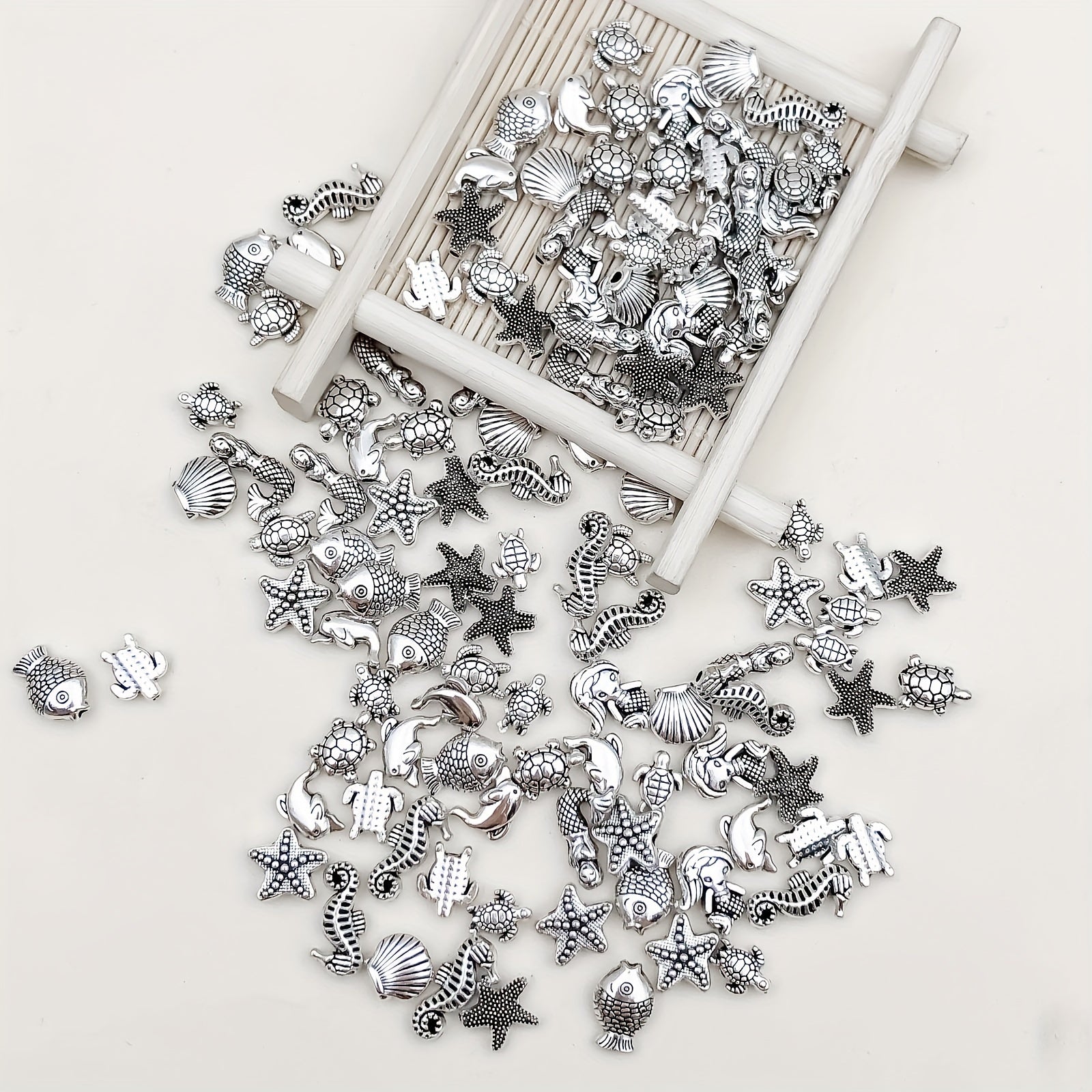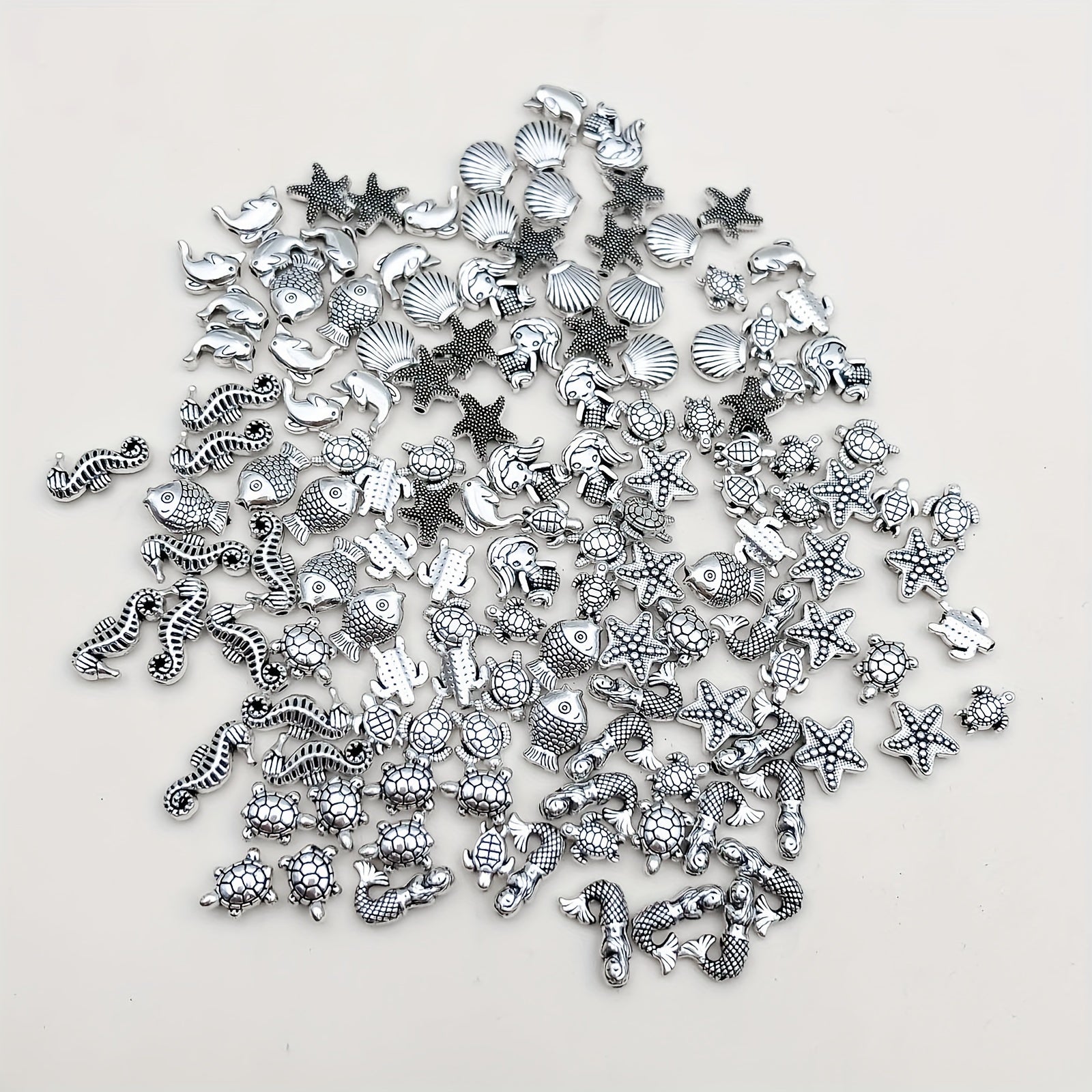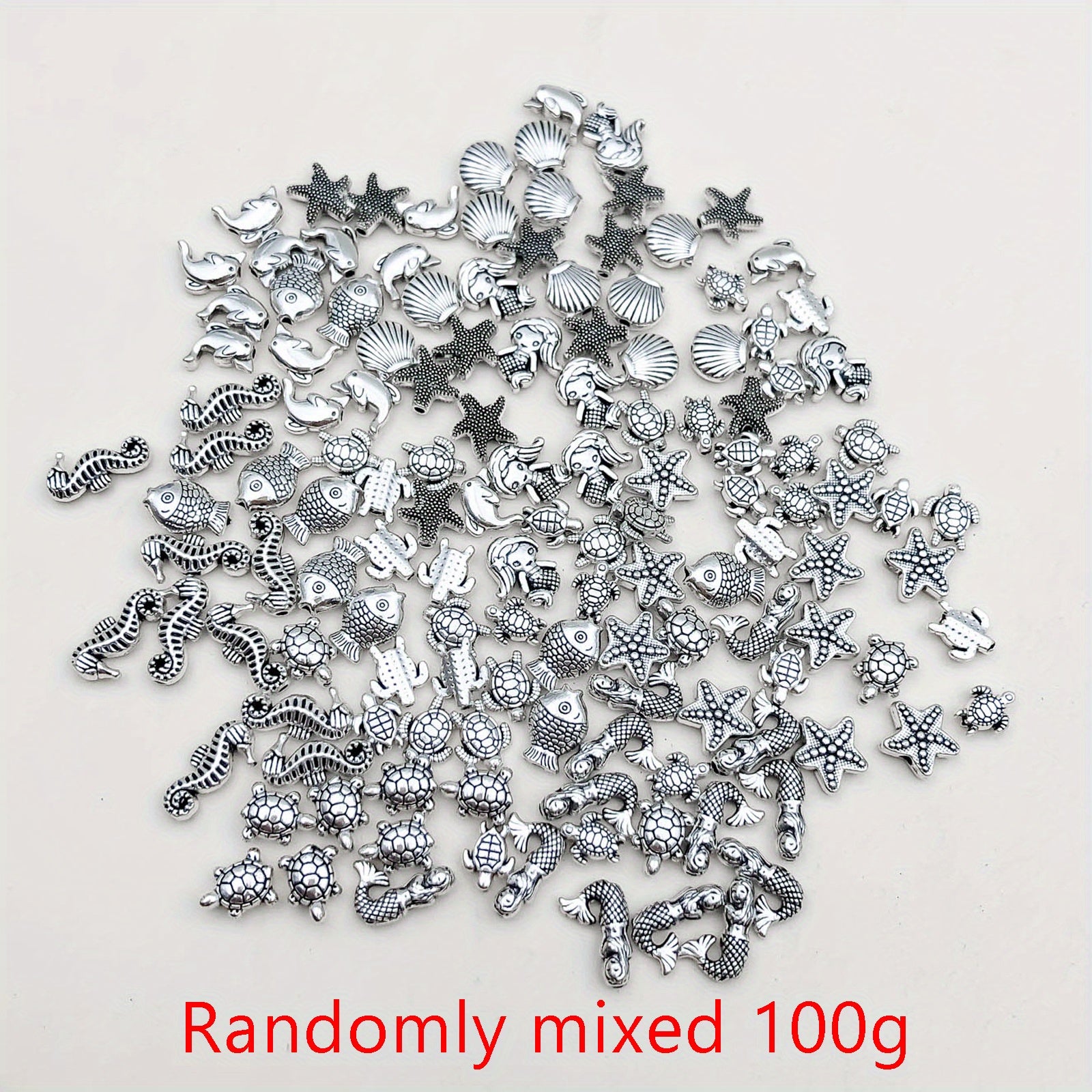 This 100g pack of vintage silvery metal beads features marine life fish and flower tubular spacer beads. Perfect for crafting and jewelry making.