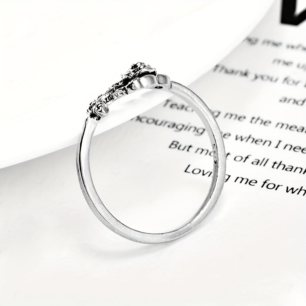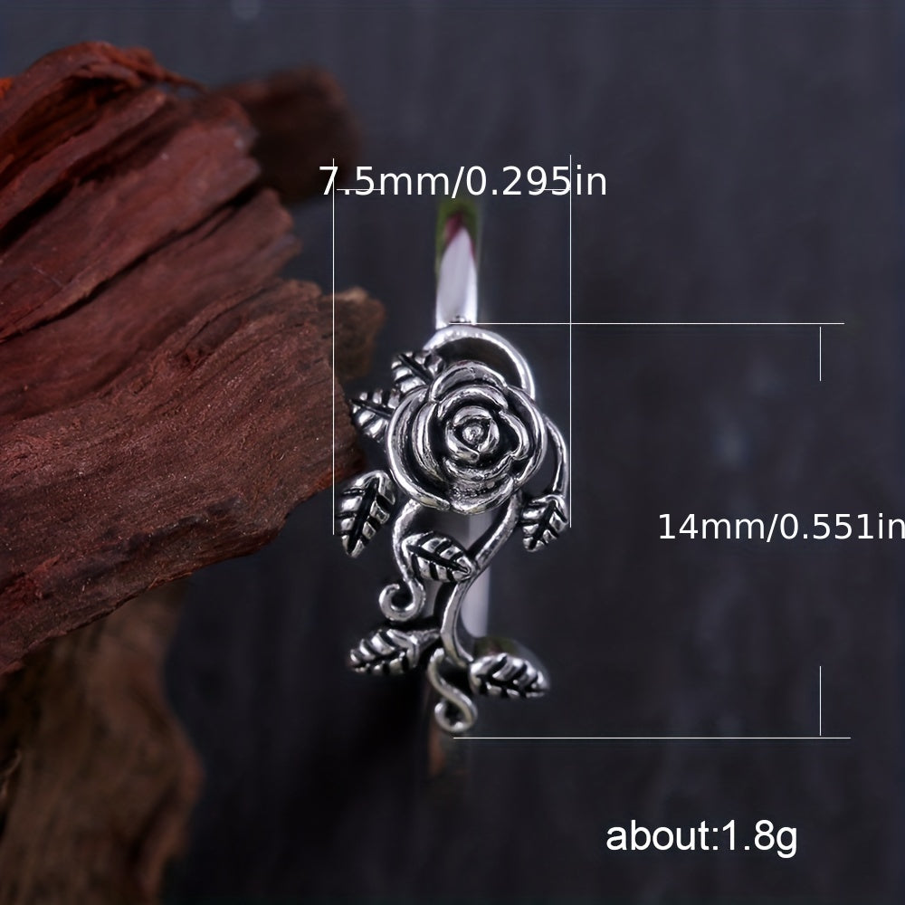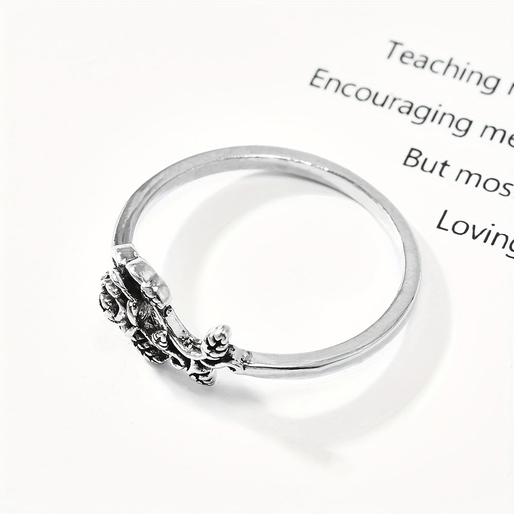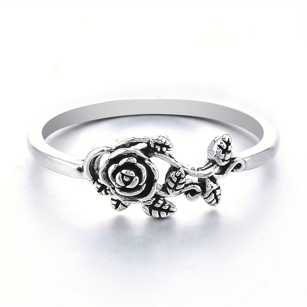 Add a touch of vintage charm to your hand with this silvery rose ring. Perfect for engagement or everyday wear, this antique-style ring is a statement piece of hand jewelry.