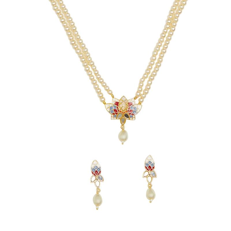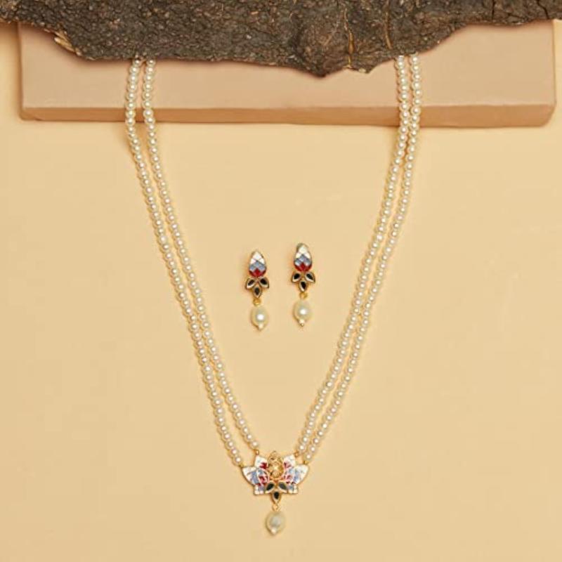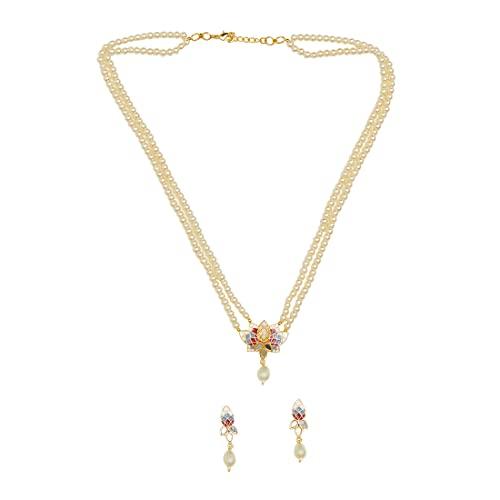 This elegant jewellery set features antique plated filigree design with faux pearls embellishments. Perfect for adding a touch of vintage charm to your outfit.