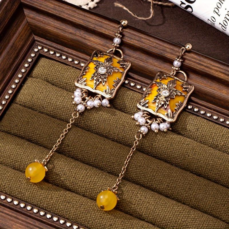 Add a touch of vintage elegance to your look with these geometric earrings featuring faux jade and pearl tassels.
