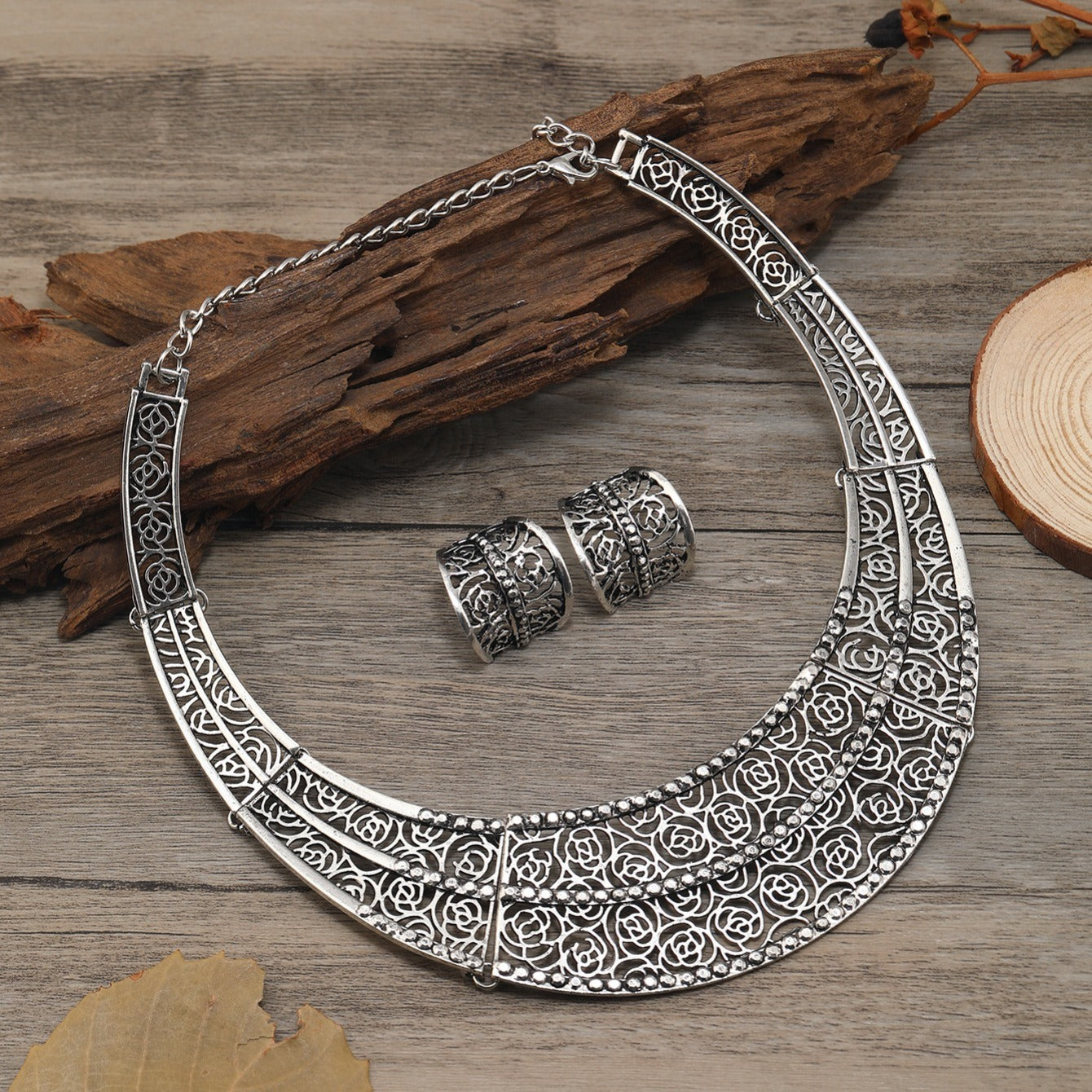 Elegant vintage-style jewelry set featuring a choker necklace and stud earrings. These pieces are exquisitely designed with hollow out accents for a stunning look that adds a touch of sophistication to any outfit.