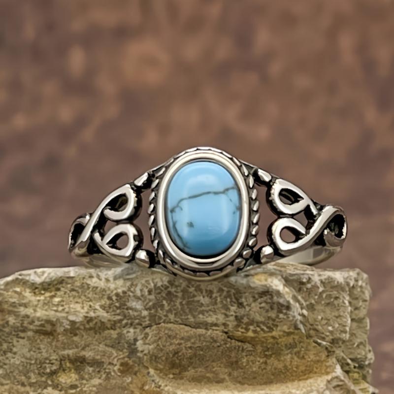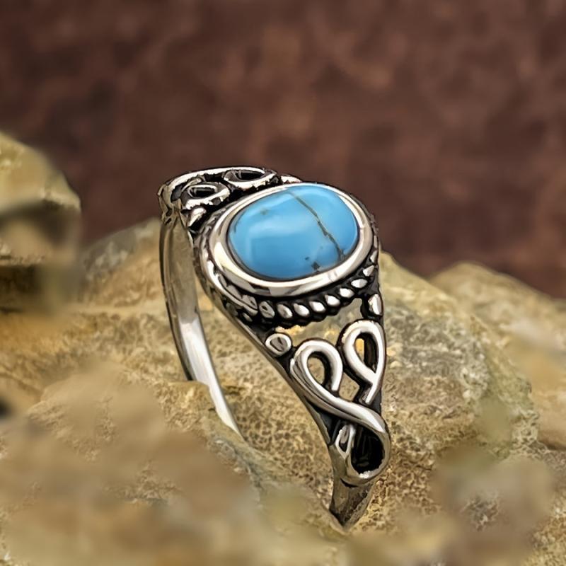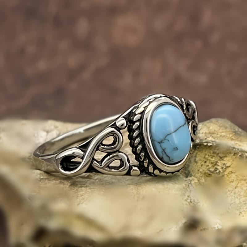 This antique-inspired ring features a synthetic turquoise stone set in titanium 304 stainless steel band. Perfect for women who love vintage jewelry.