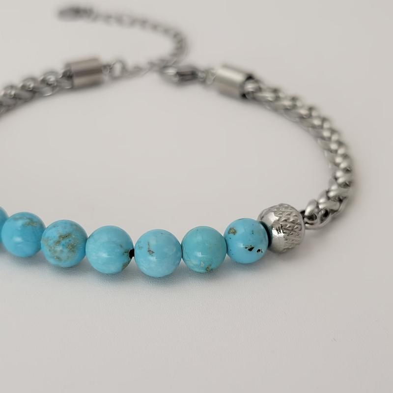 This adjustable bracelet is made of high-quality titanium steel and features synthetic turquoise beads, perfect for daily wear, parties, and vacations.