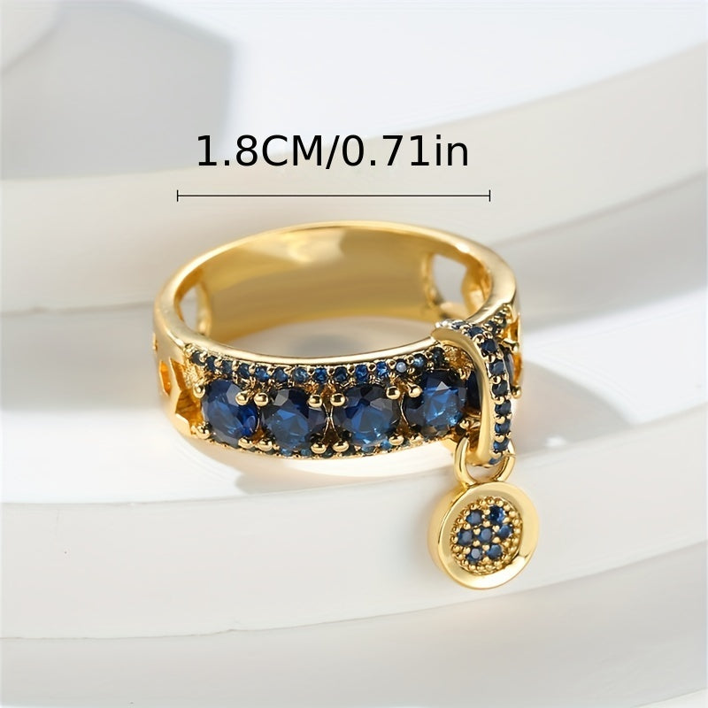 This elegant ring features a synthetic sapphire stone in a round shape, set in a golden plated alloy band. Perfect for special occasions or everyday wear.