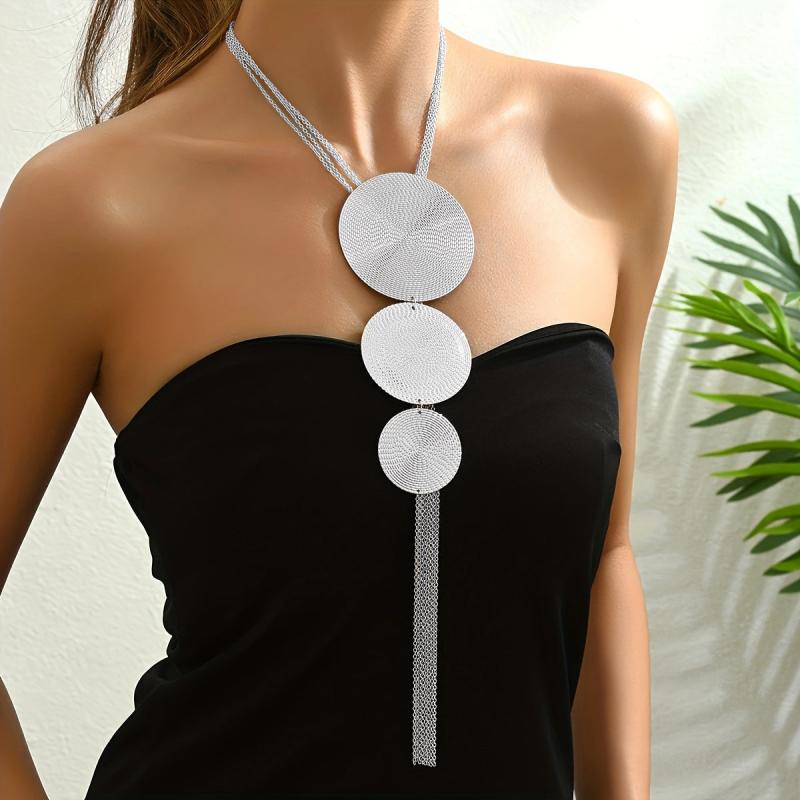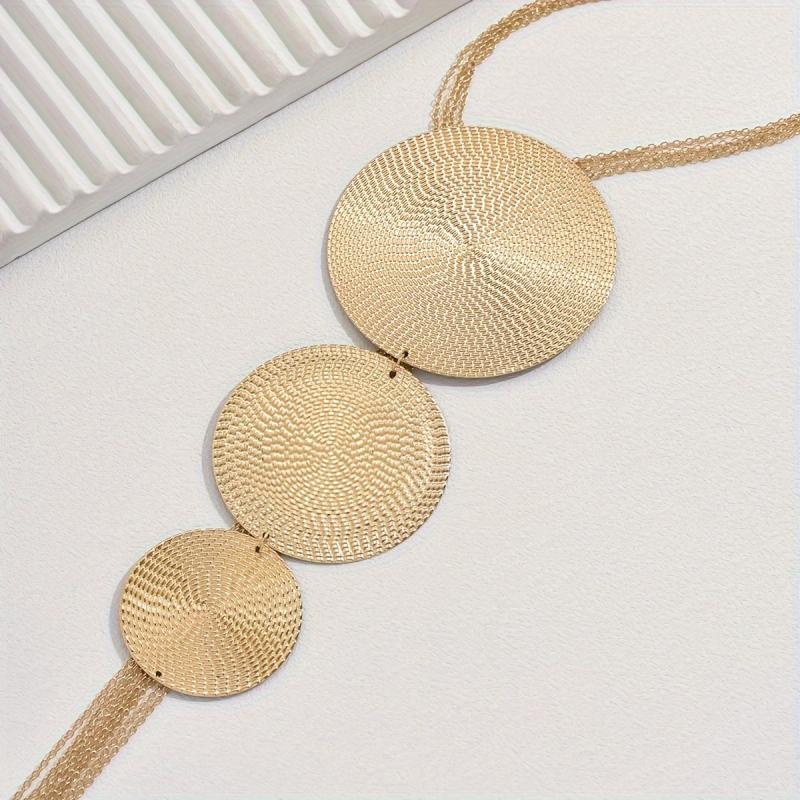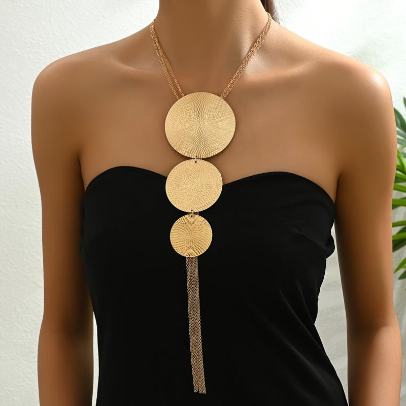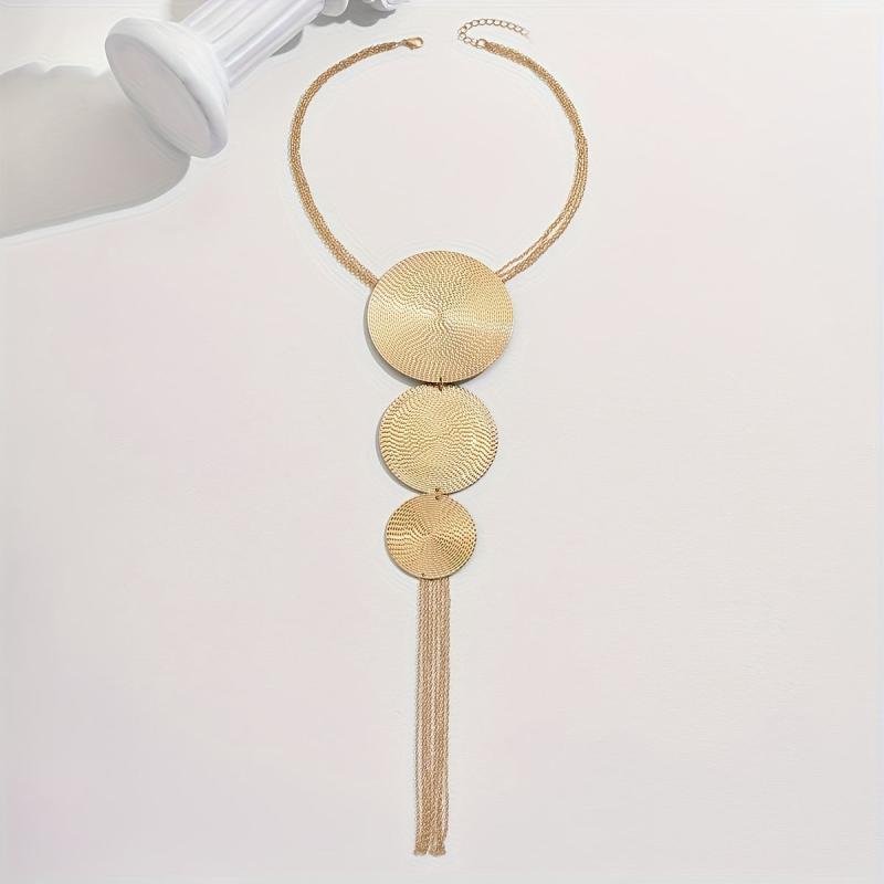 Add a touch of elegance to your outfit with this vintage tassel necklace featuring three large round golden tone metal pendants and cascading chains. Perfect for daily wear or special occasions.