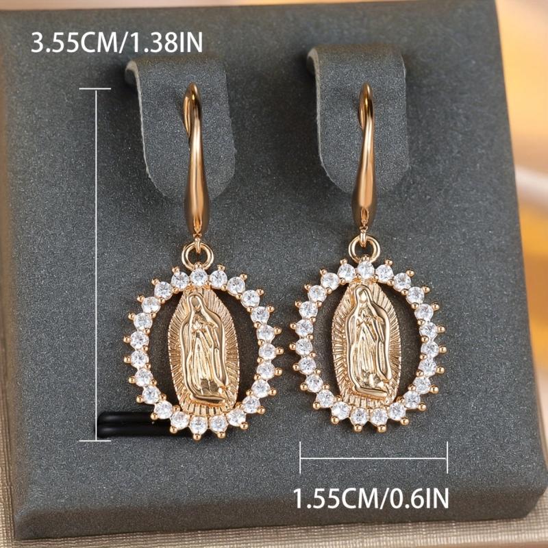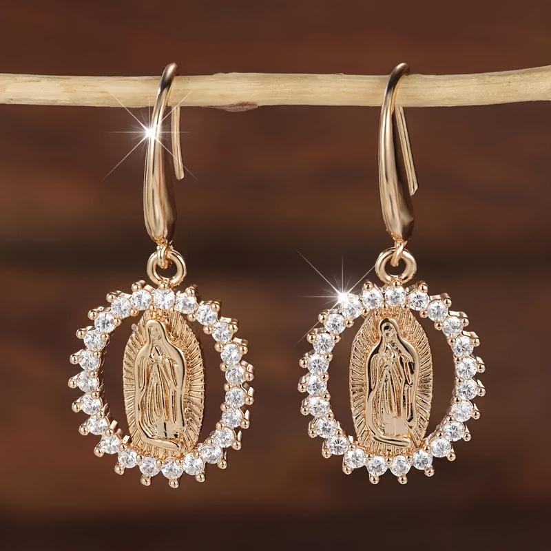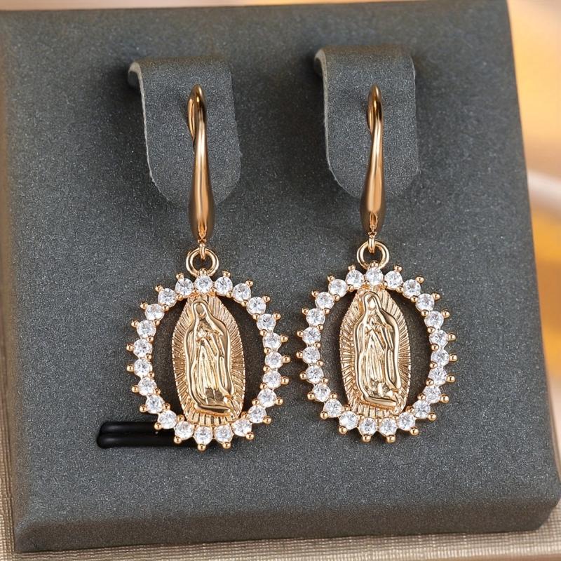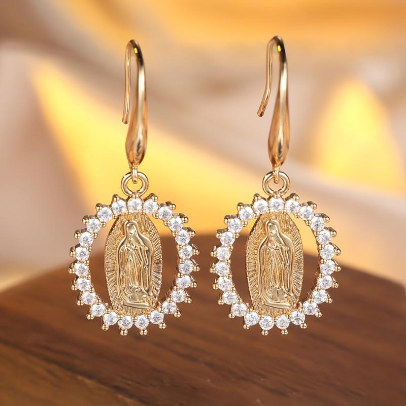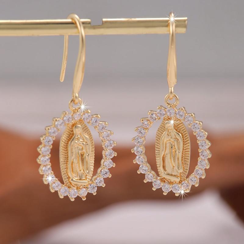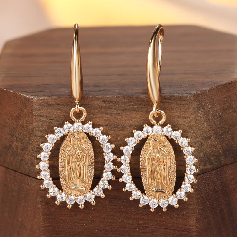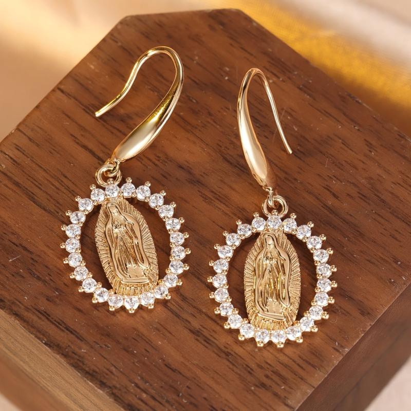 These exquisite pair of earrings feature a tribal design with a Virgin Mary oval drop adorned with synthetic cubic zirconia. Perfect for a Catholic wedding or special occasion.