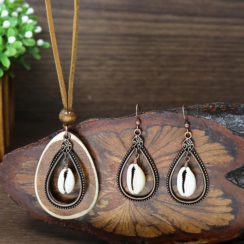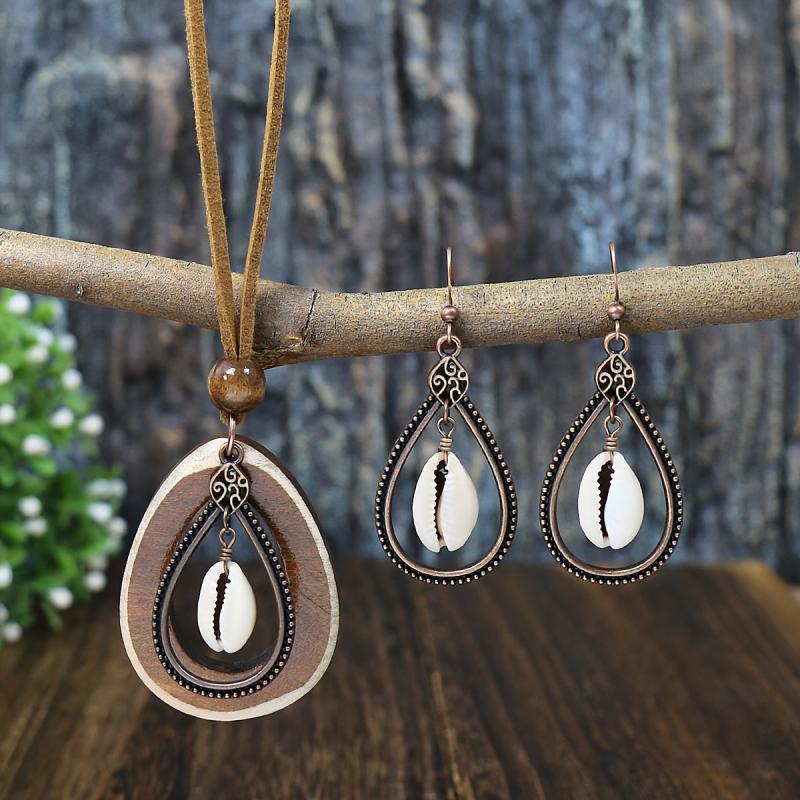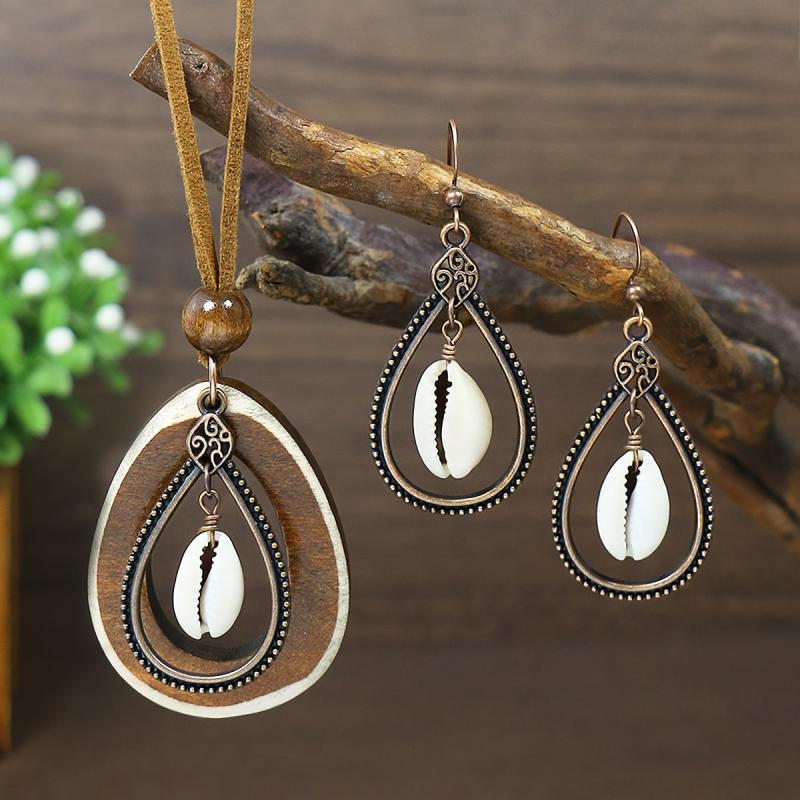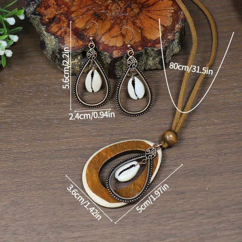 This 3-piece jewelry set features tribal design with teardrop earrings, shell pendant, and natural wooden double layer dangle for a fashionable daily wear accessory.