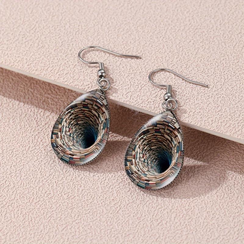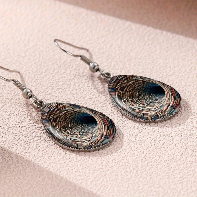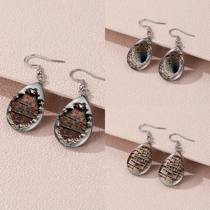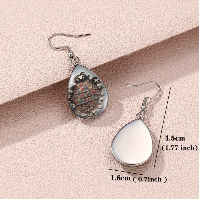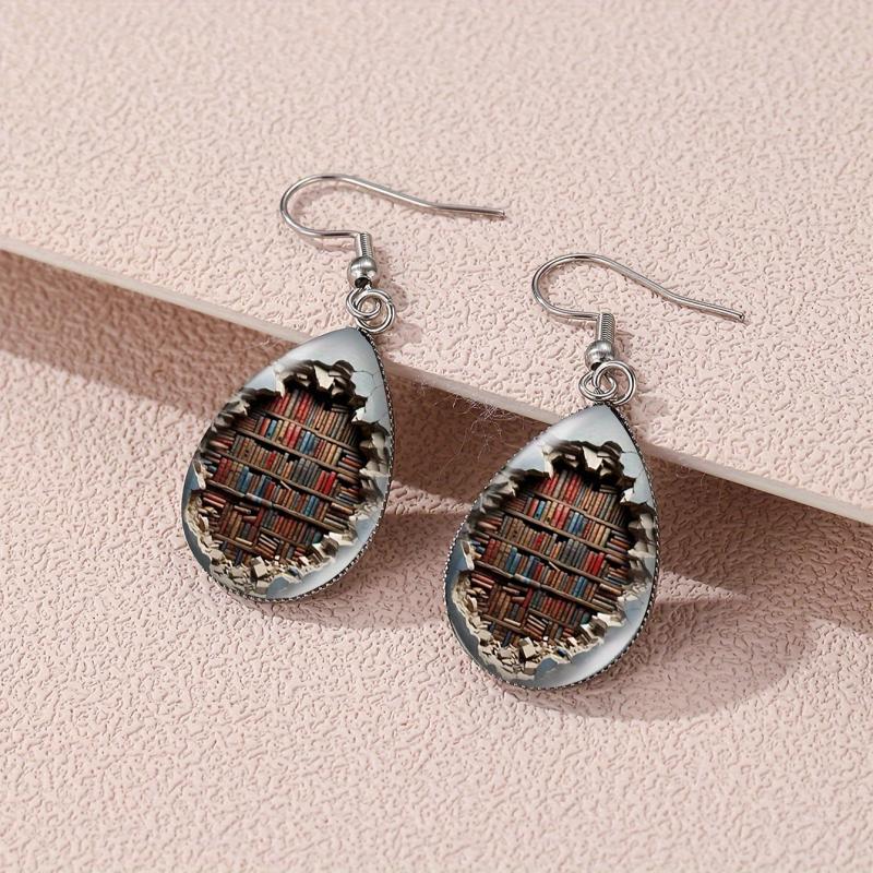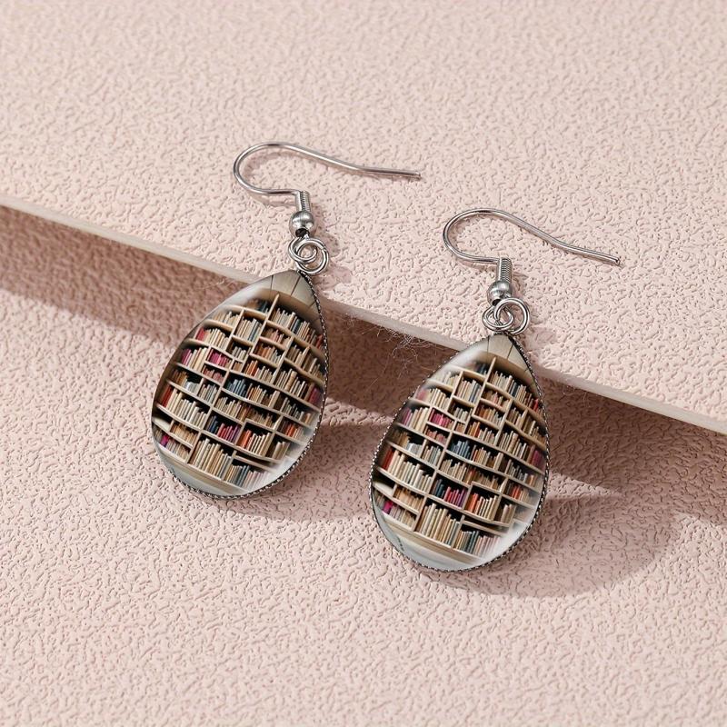 Unique bookshelf print dangle earrings designed for men, featuring wall hole design. Great gift for book lovers and readers.