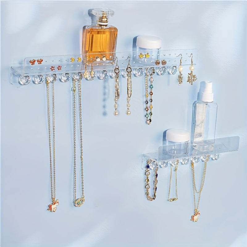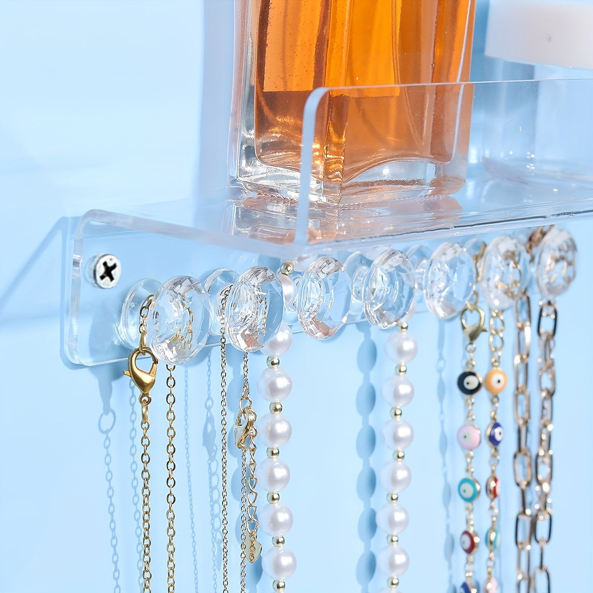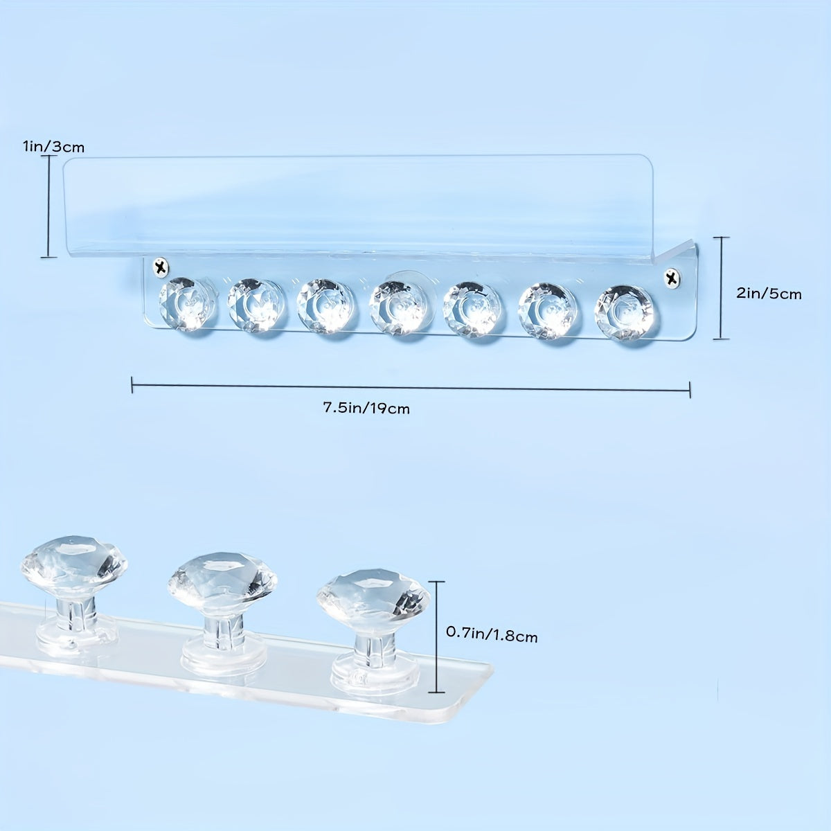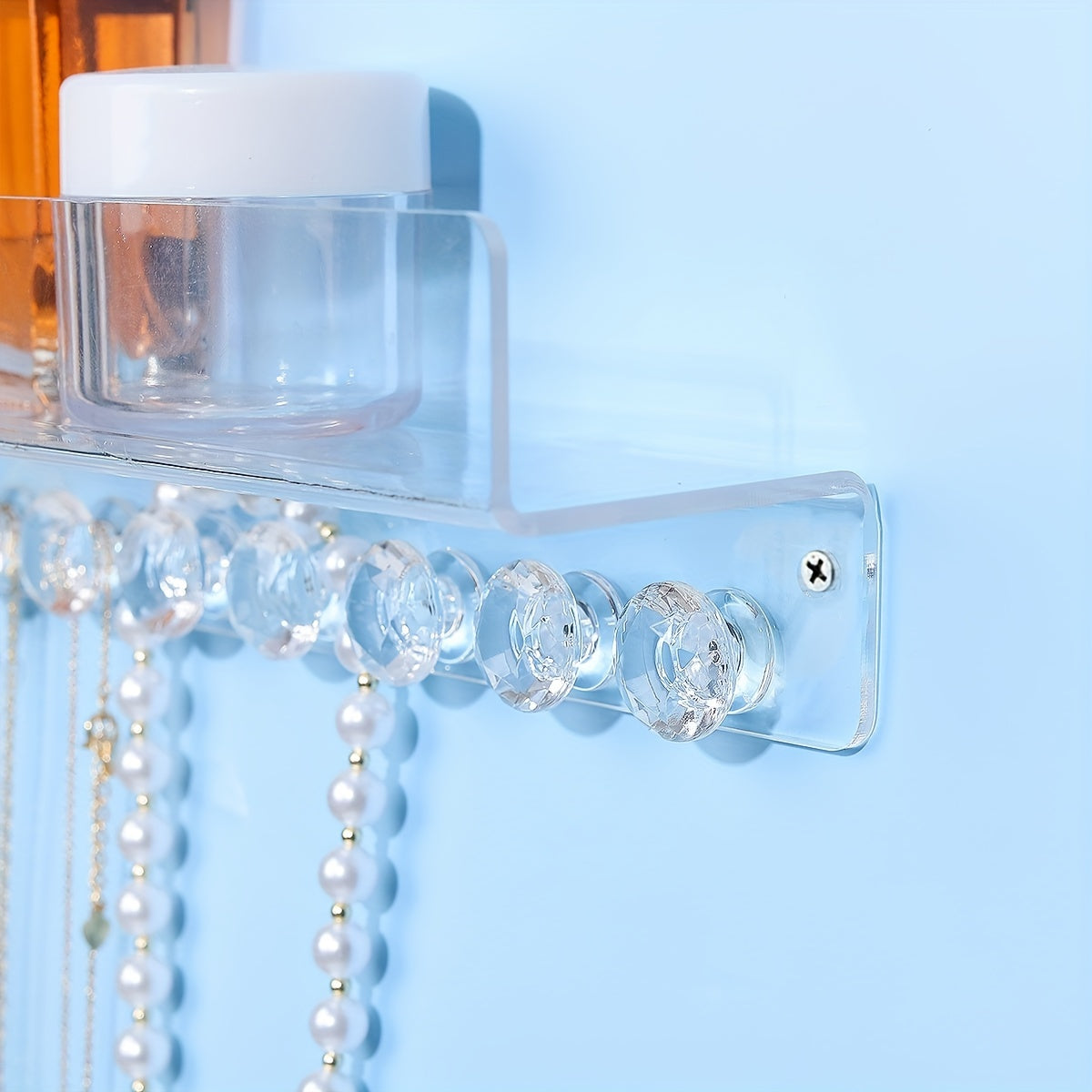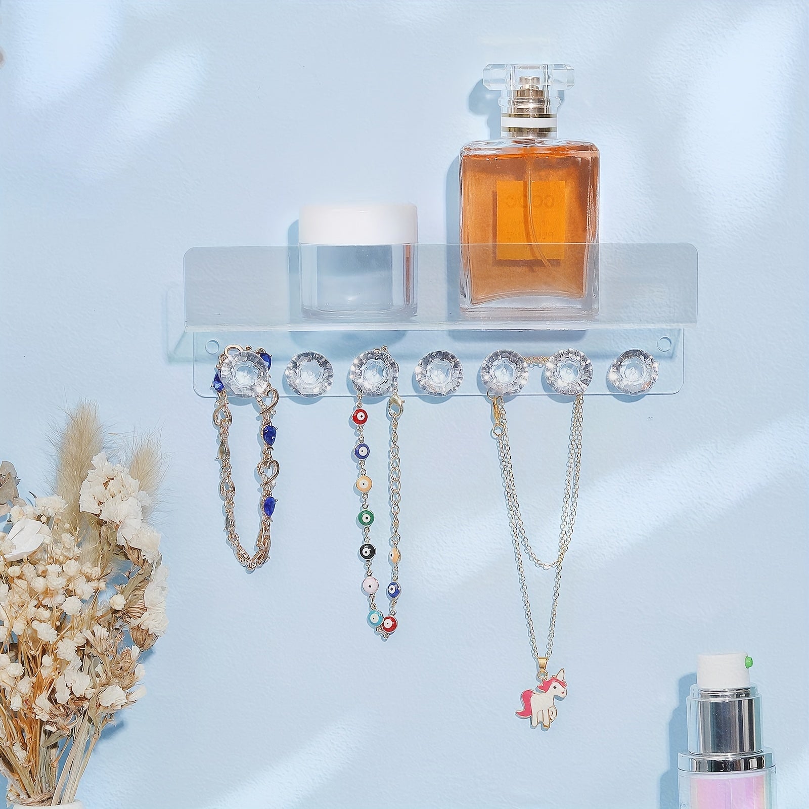 Keep your jewelry and cosmetics neatly organized with this wall-mounted holder. Features an acrylic crystal design and 7 hooks for hanging necklaces, bracelets, perfumes, and more.