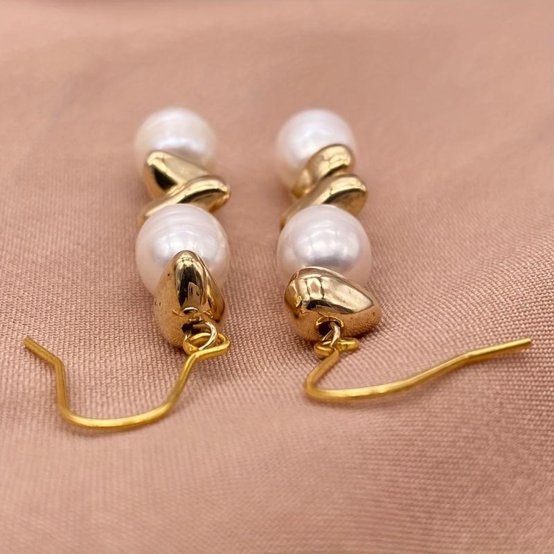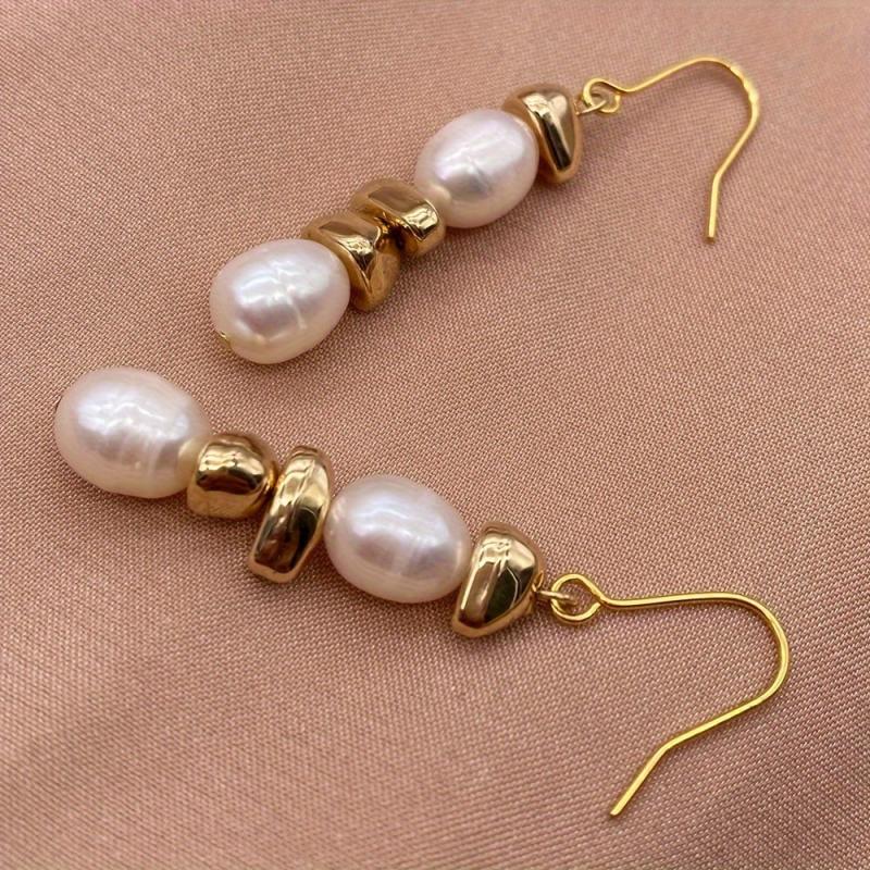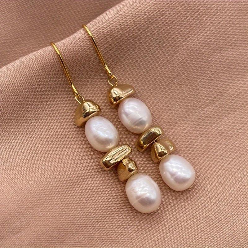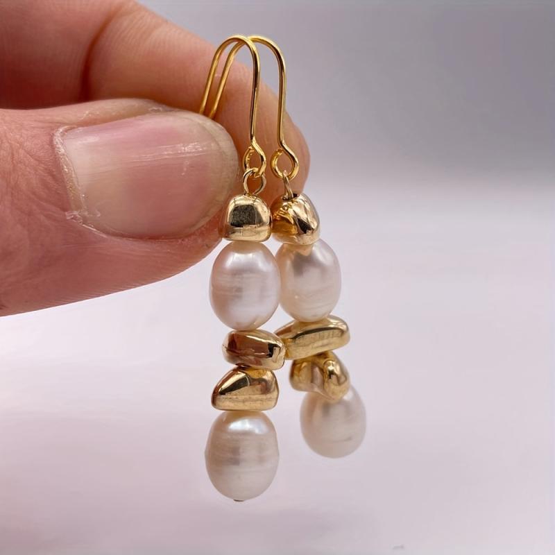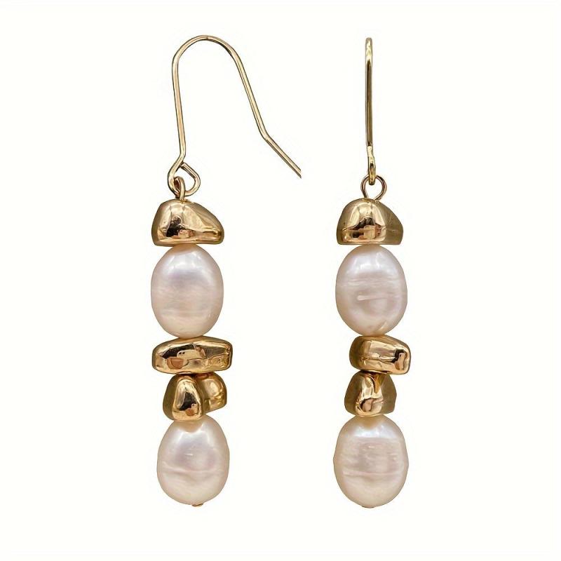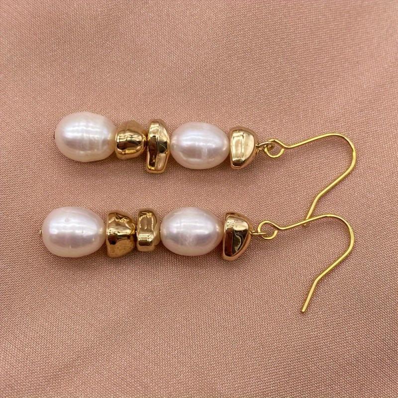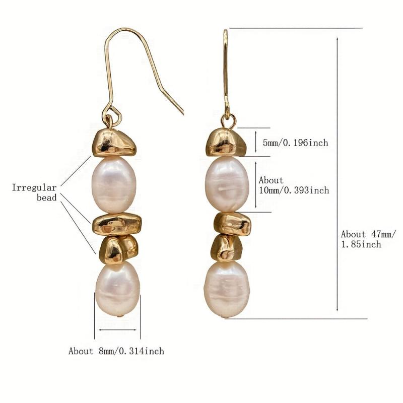 These 47mm long earrings feature natural gemstone freshwater pearls in a water drop shape with irregular golden and silvery accents. They are designed with French ear hooks for easy wearing and are perfect for everyday wear.