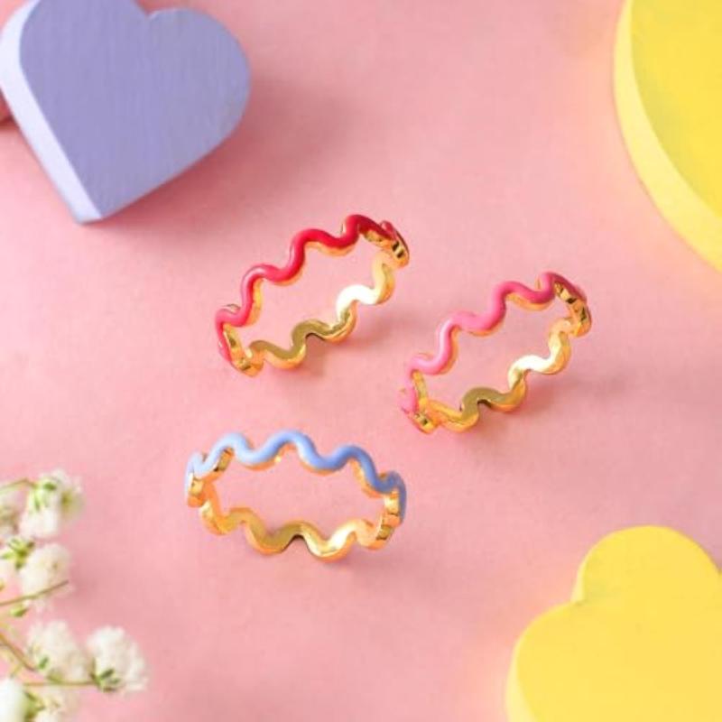 This set of stackable rings features a wavy borderless design with vibrant enamel colors. A perfect gift for her on Valentine's Day.