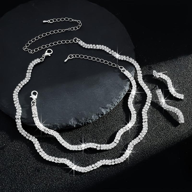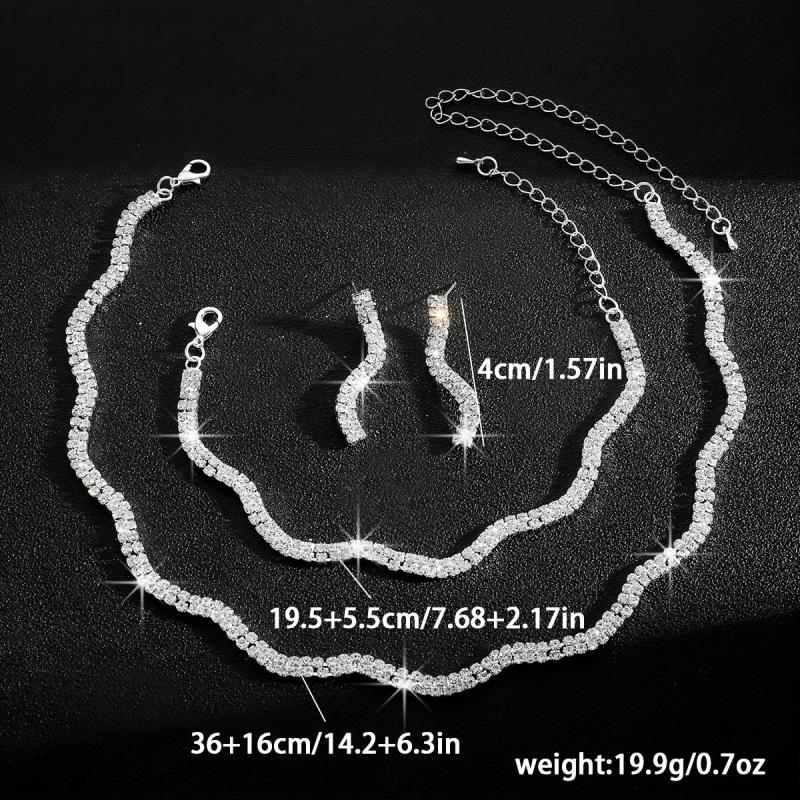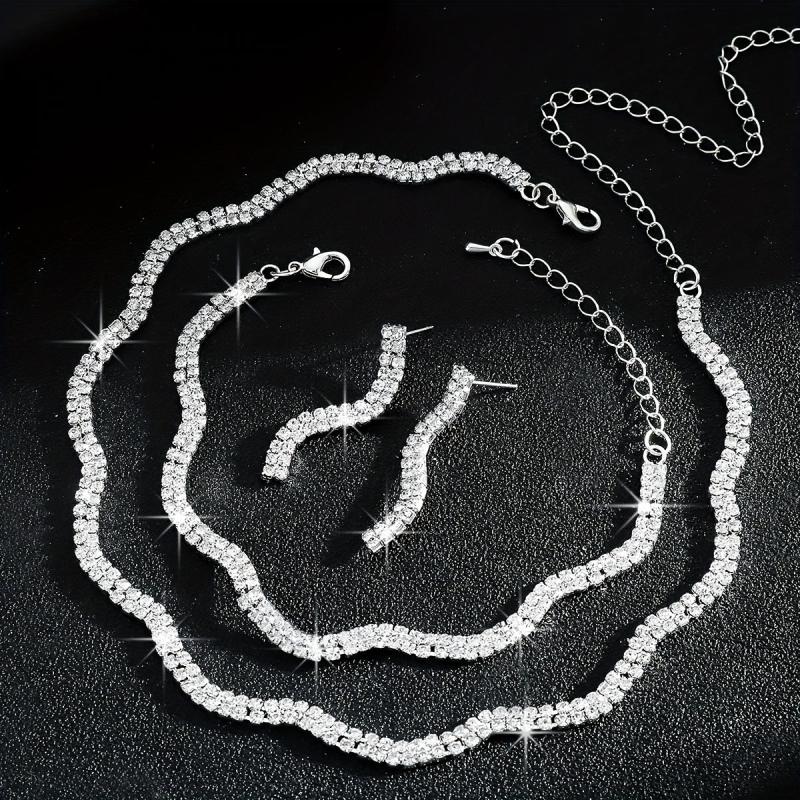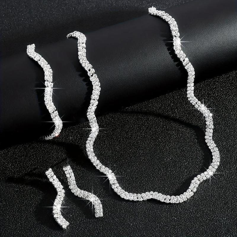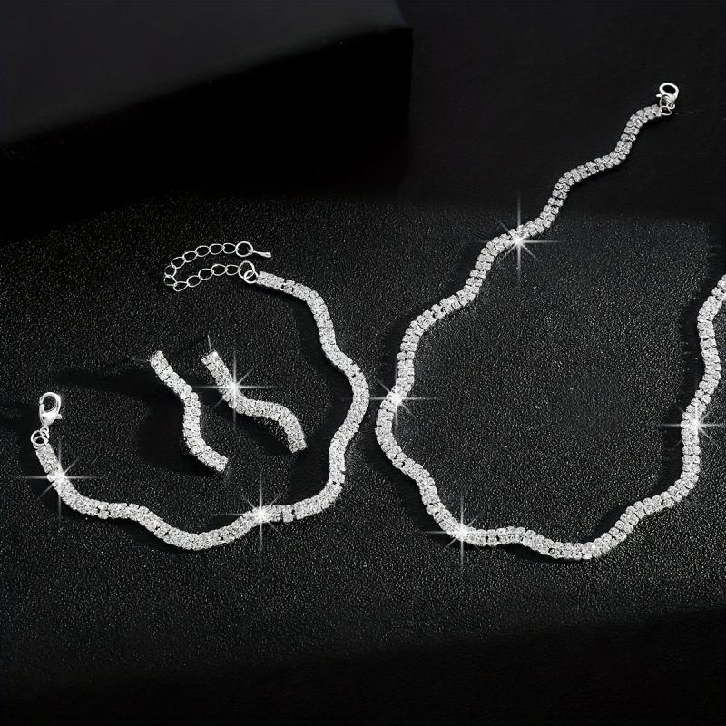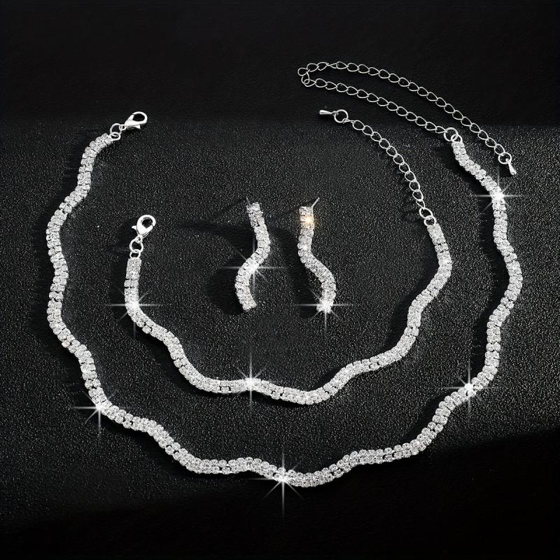 This stunning jewelry set includes a necklace, bracelet, and earrings made of copper with golden plating, adorned with beautiful rhinestones. Perfect for adding sparkle to your outfit at parties and banquets.