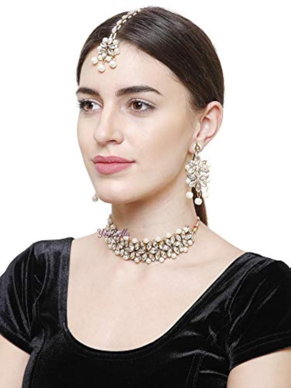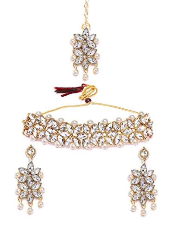 Elegant plated choker necklace with pearl set, perfect for wedding and bridal occasions.