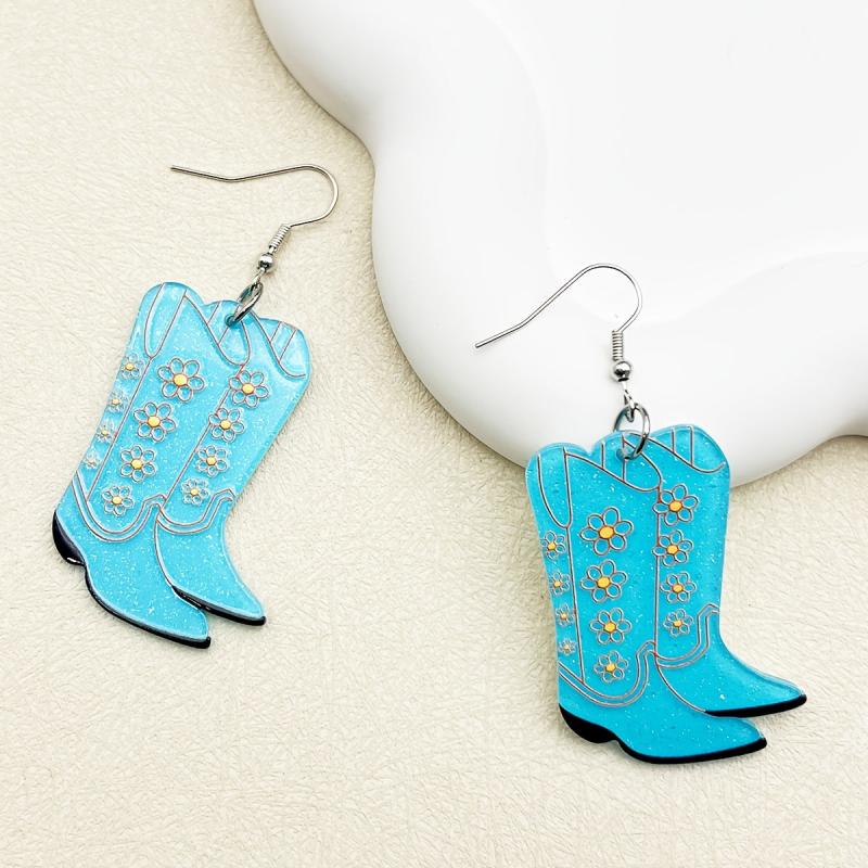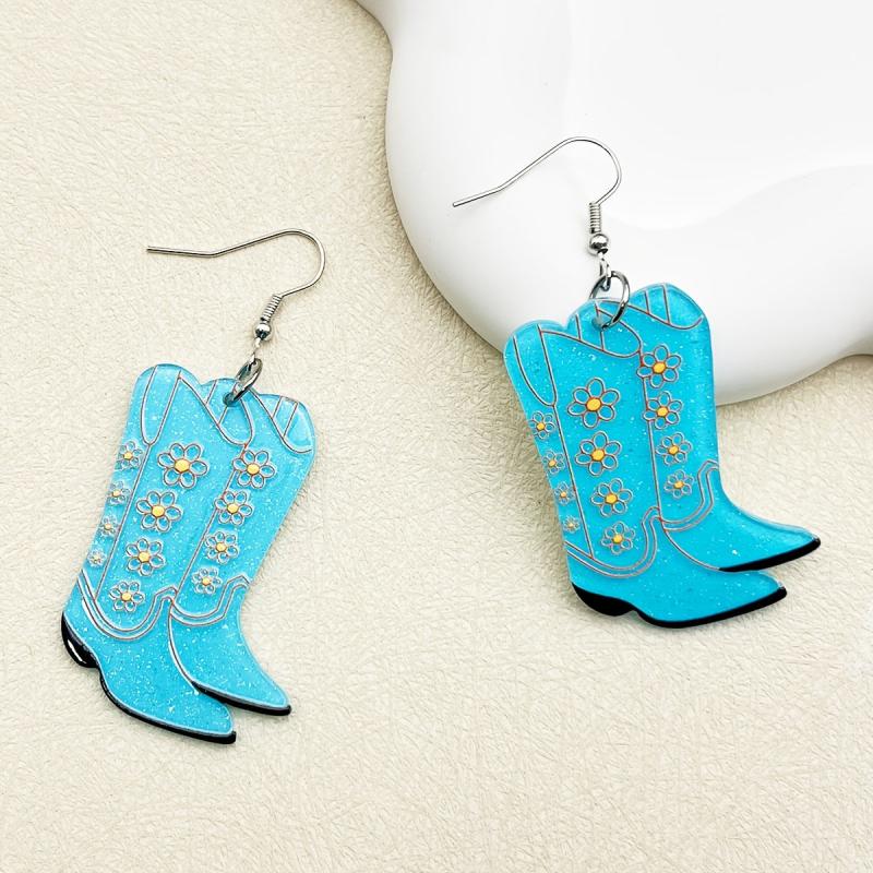 Add a touch of Western flair to your outfit with these statement earrings featuring a cowboy boot design. The turquoise glitter acrylic and floral embellishments make them stand out.
