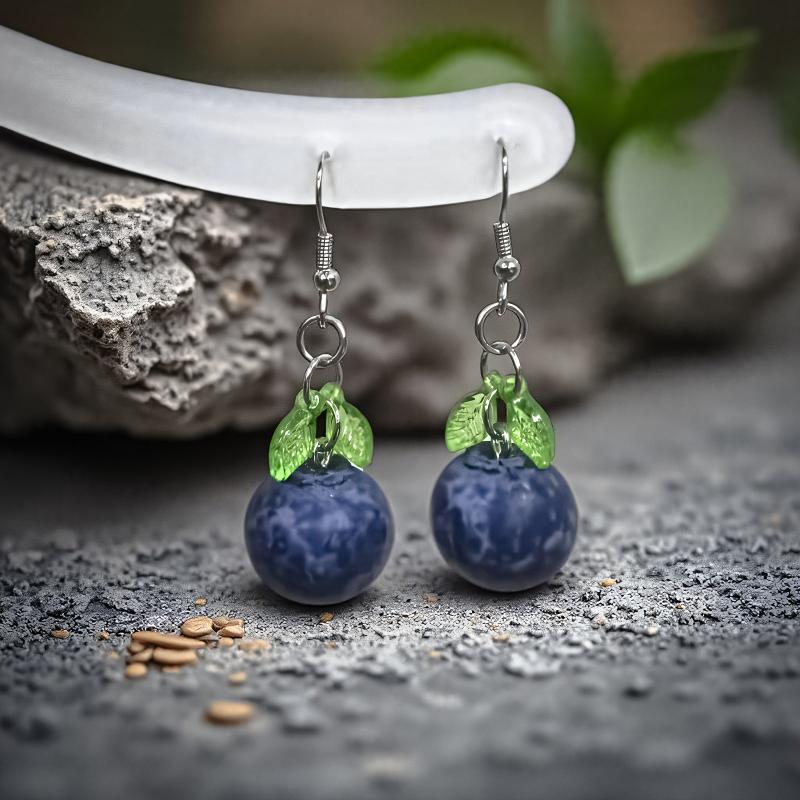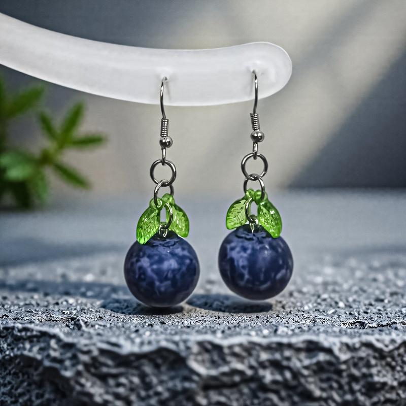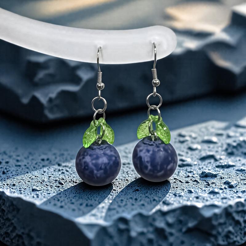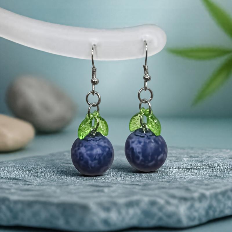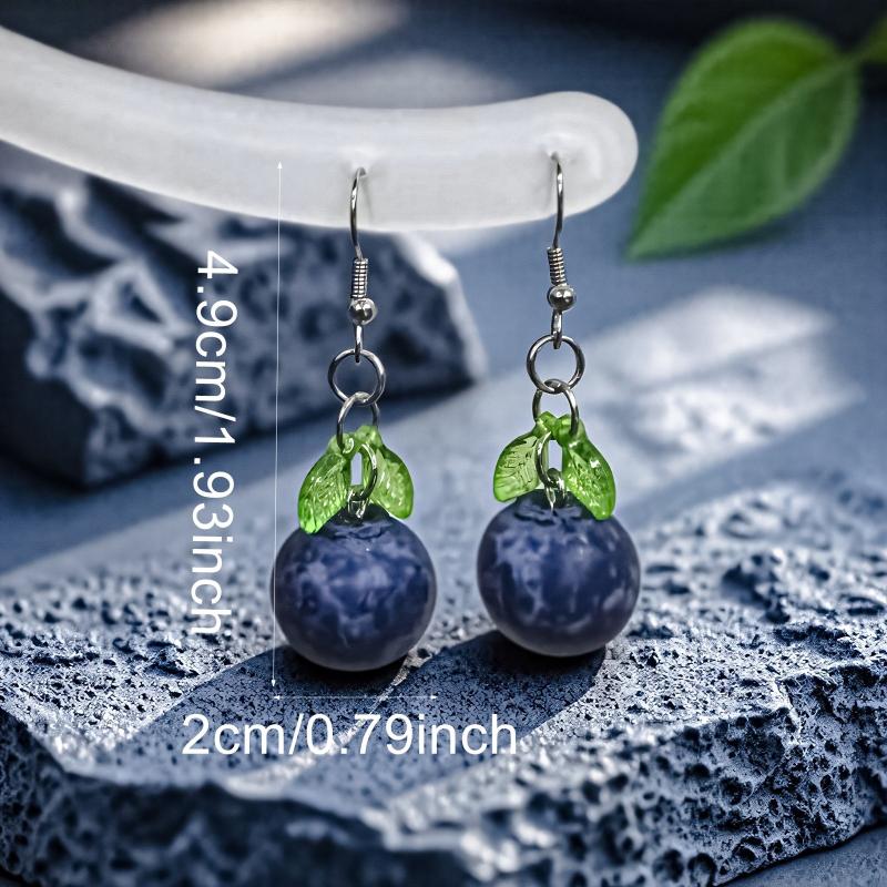 These gorgeous dangle earrings feature realistic blueberry designs made of resin with green leaves. Perfect for daily wear or vacation outfits.