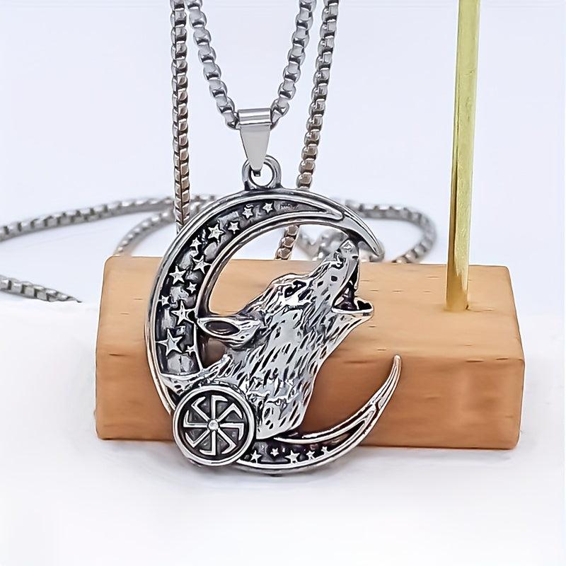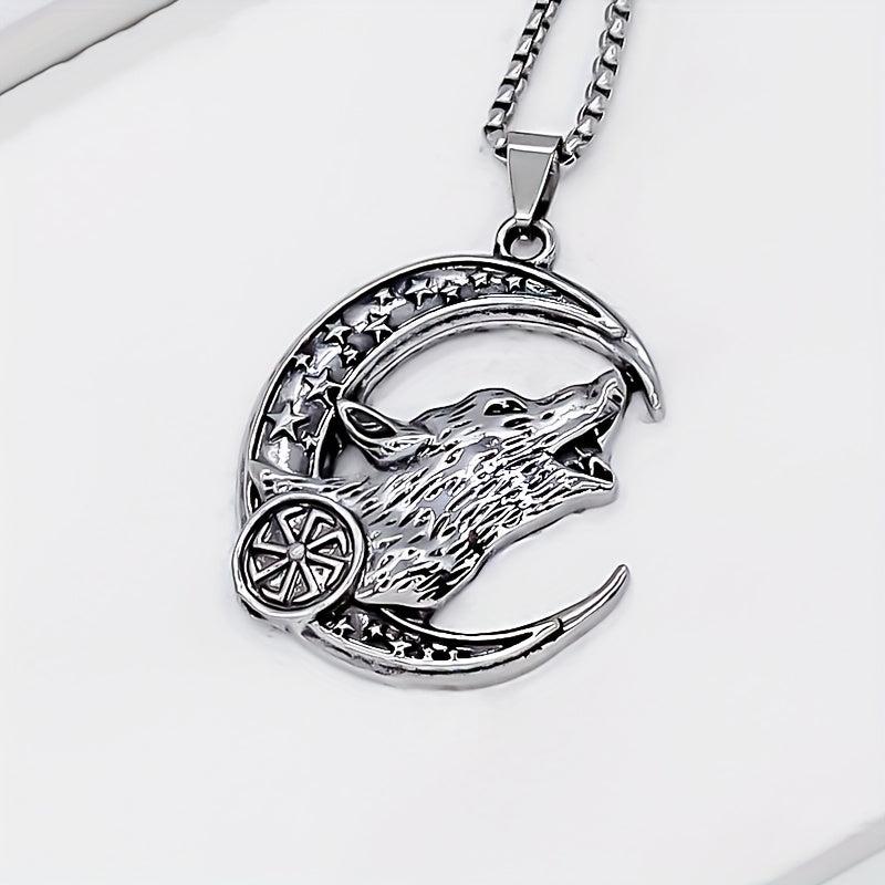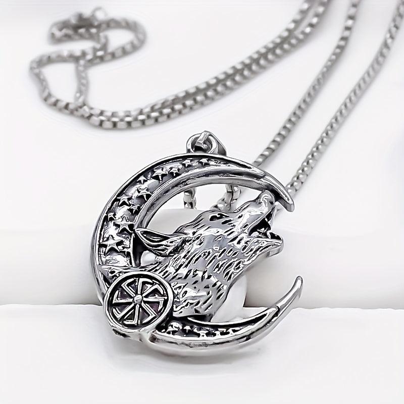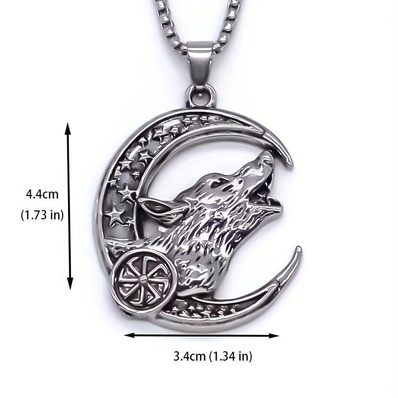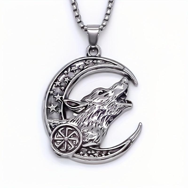 This stylish necklace features a howling wolf and crescent moon design, perfect for casual attire.