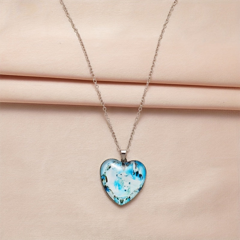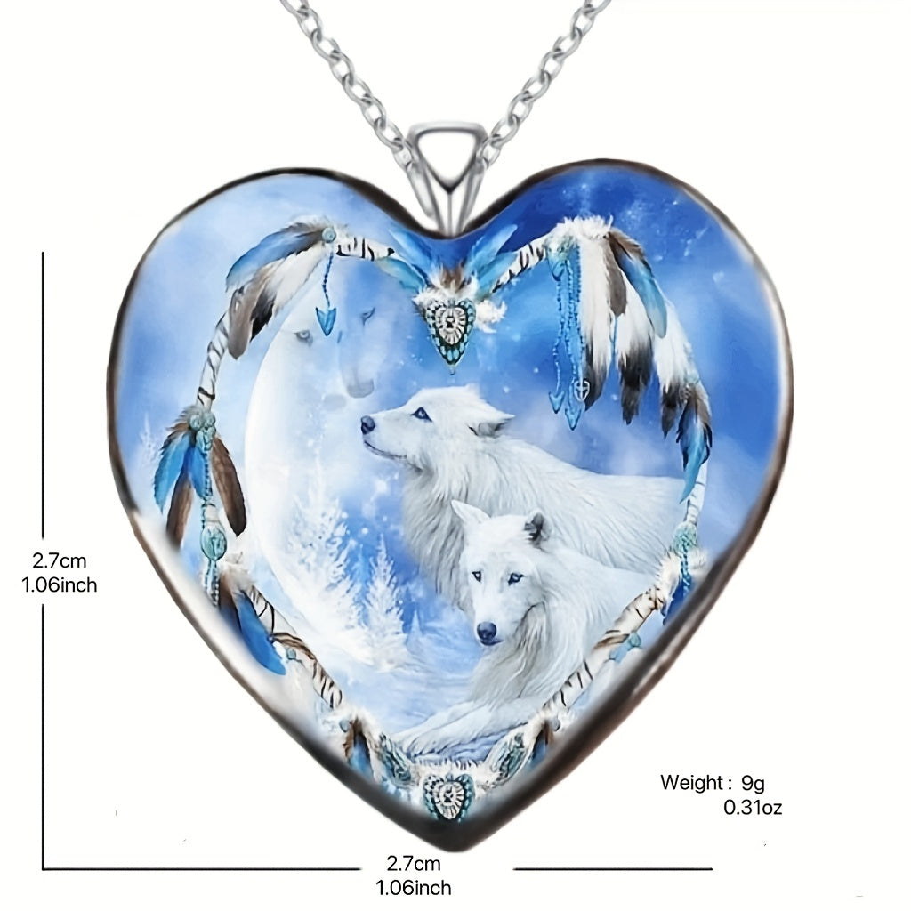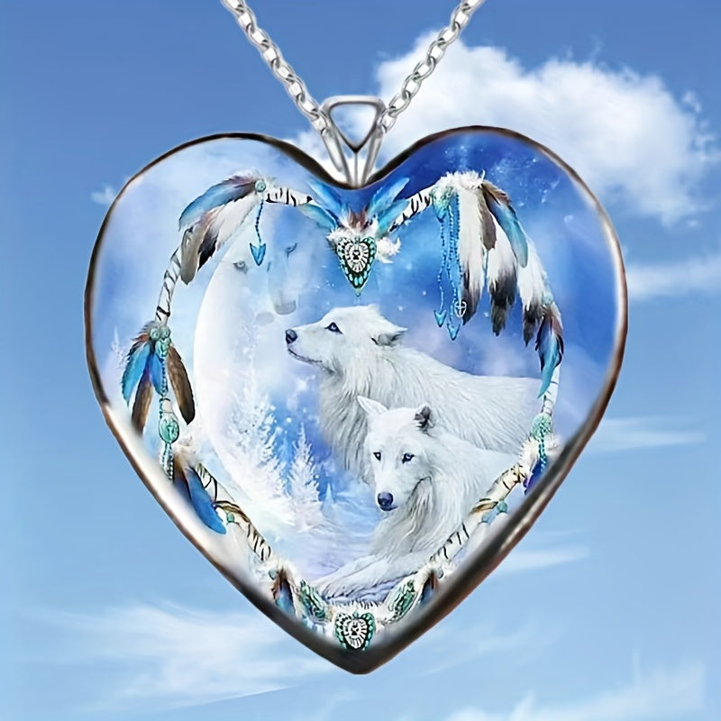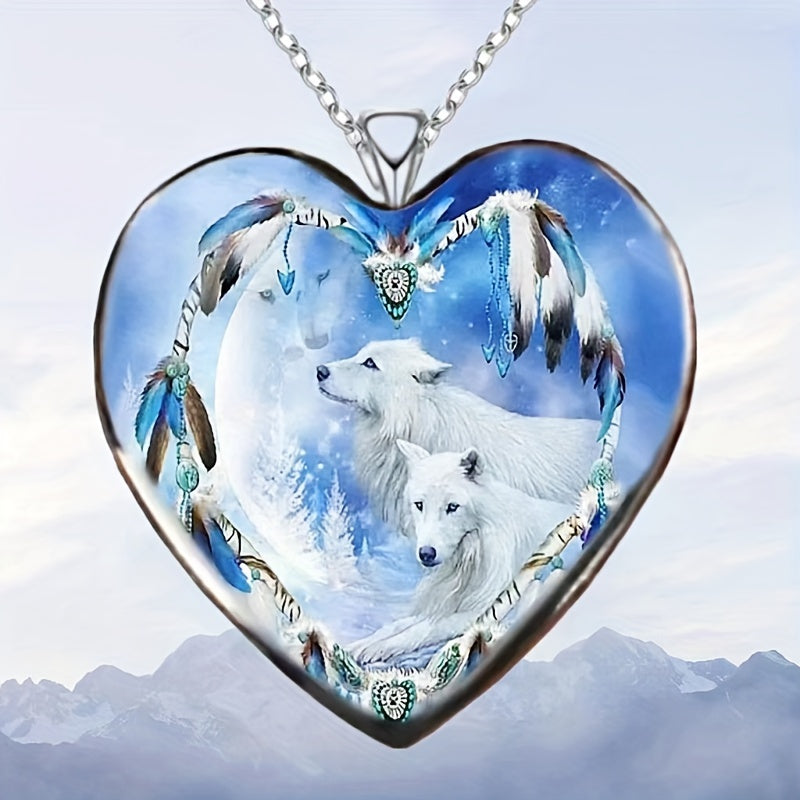 This unique necklace features a zinc alloy pendant in the shape of a heart with a snow mountain and wolf design. Perfect gift for men or women on Thanksgiving, Christmas, or birthdays.