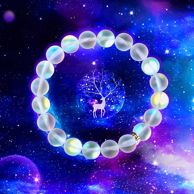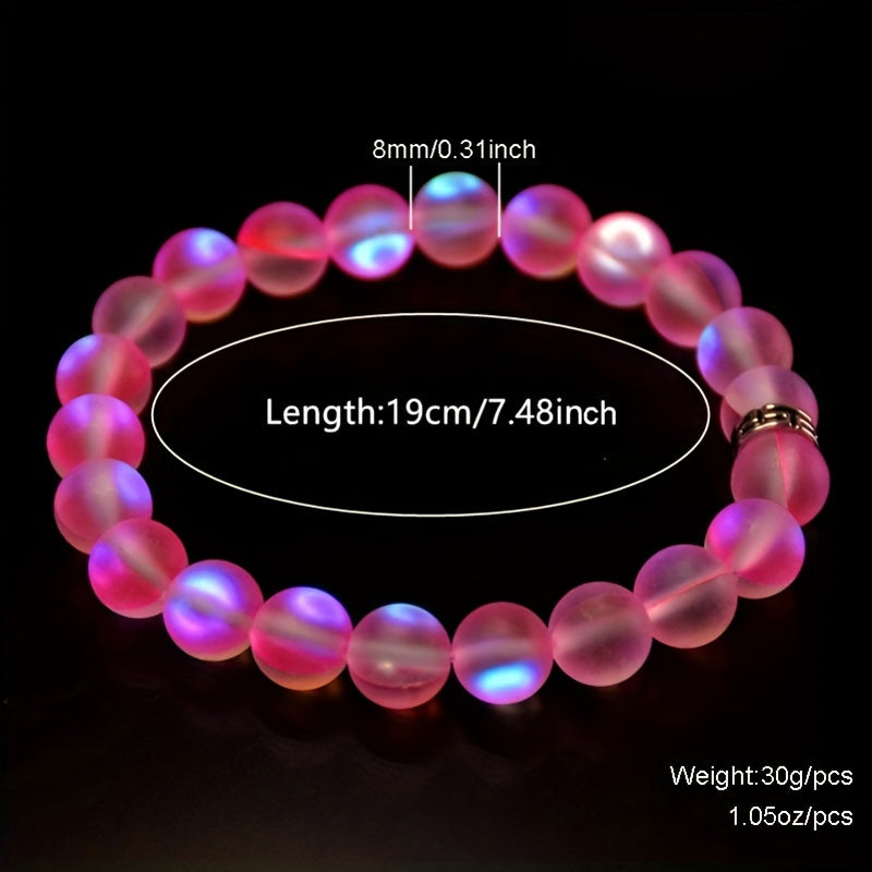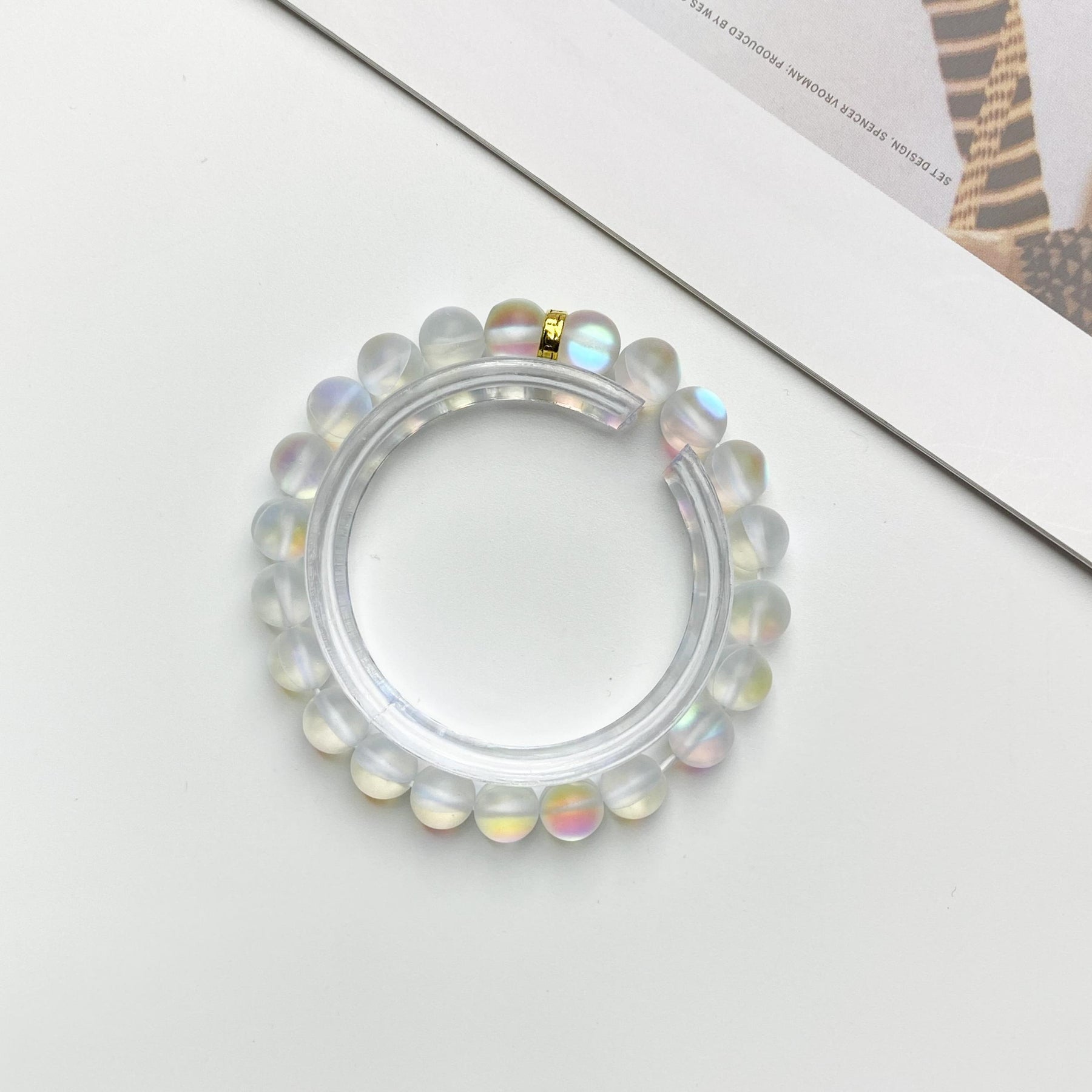 This bracelet features natural beads that mimic moonstone with a frosted smooth finish. It is a stylish accessory that adds a touch of elegance to any outfit.