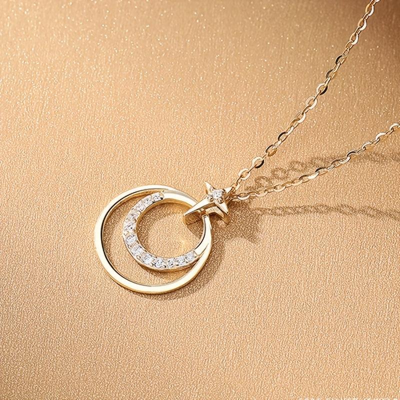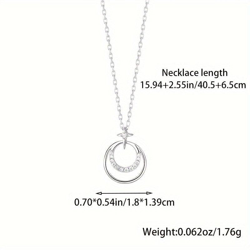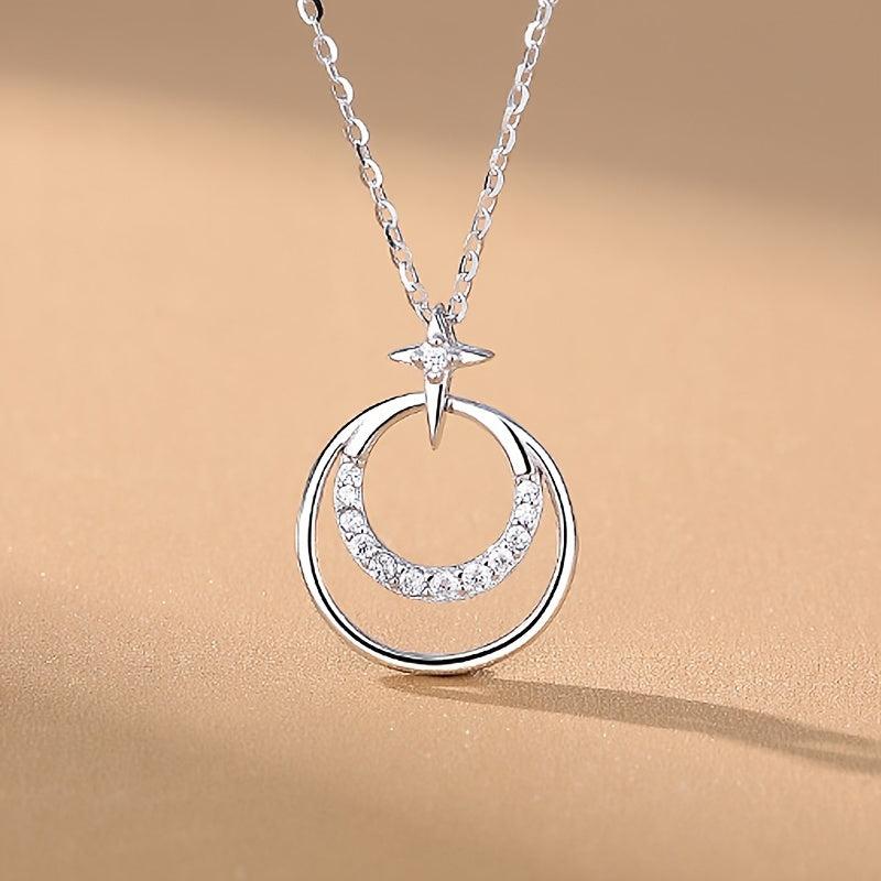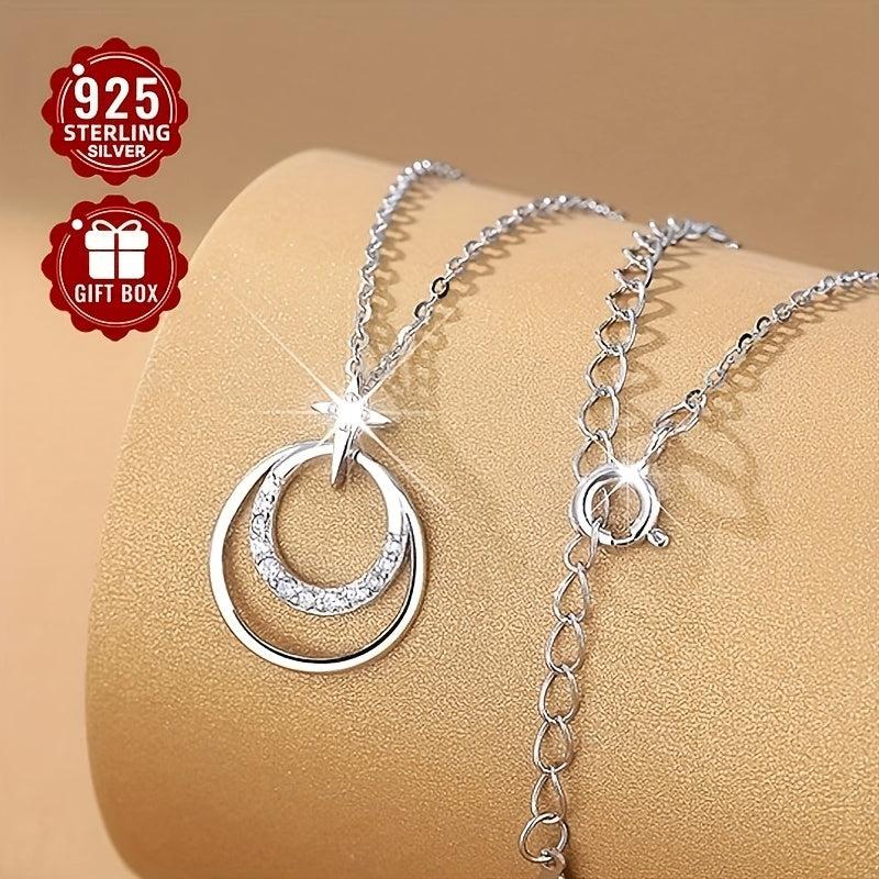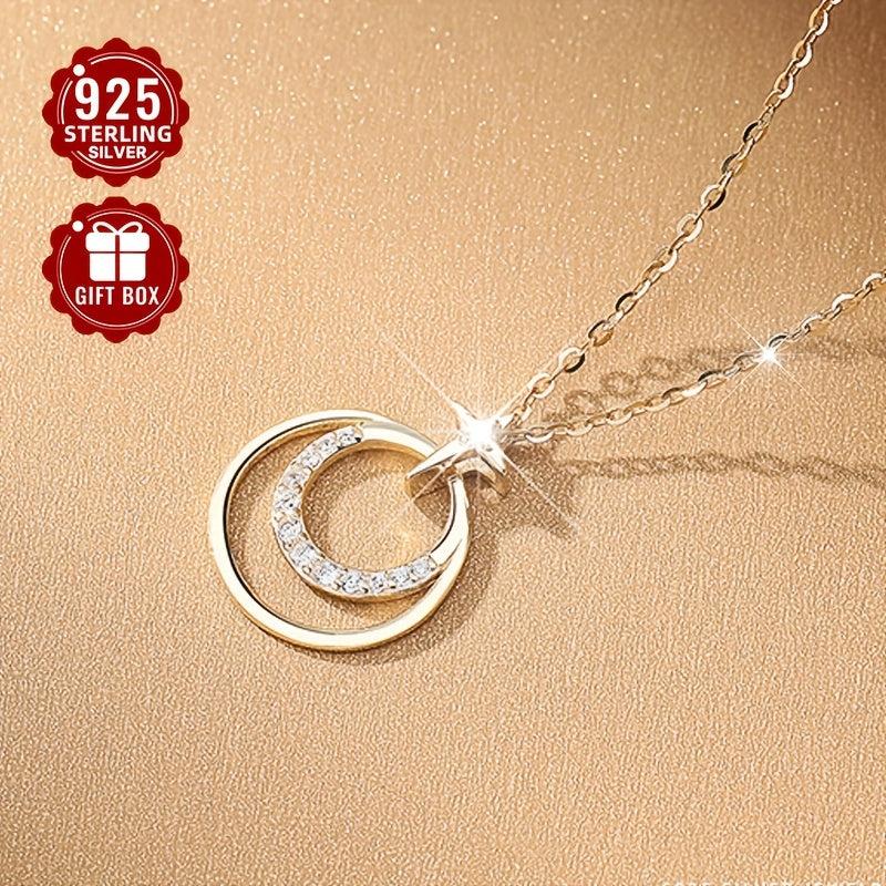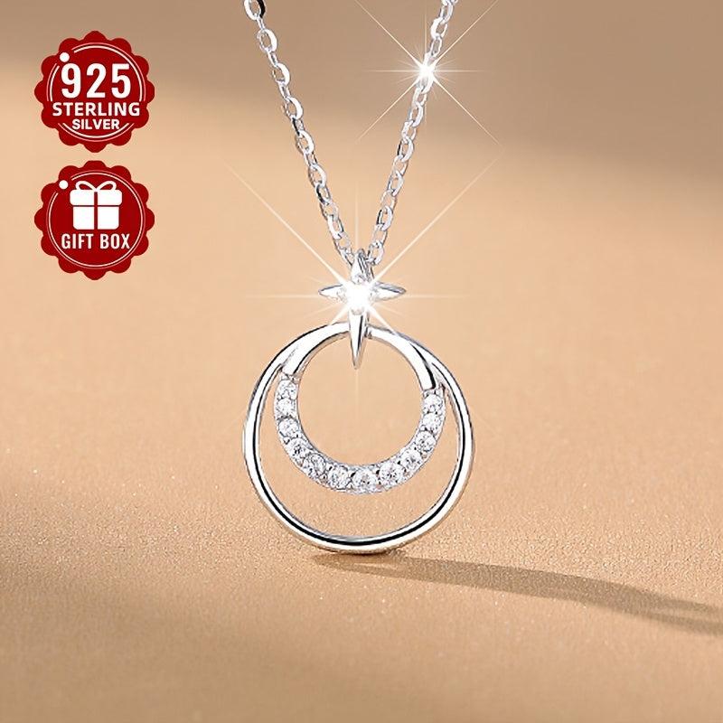 This stunning pendant necklace features a double ring design with synthetic zirconia stones and is made of high-quality 925 sterling silver.