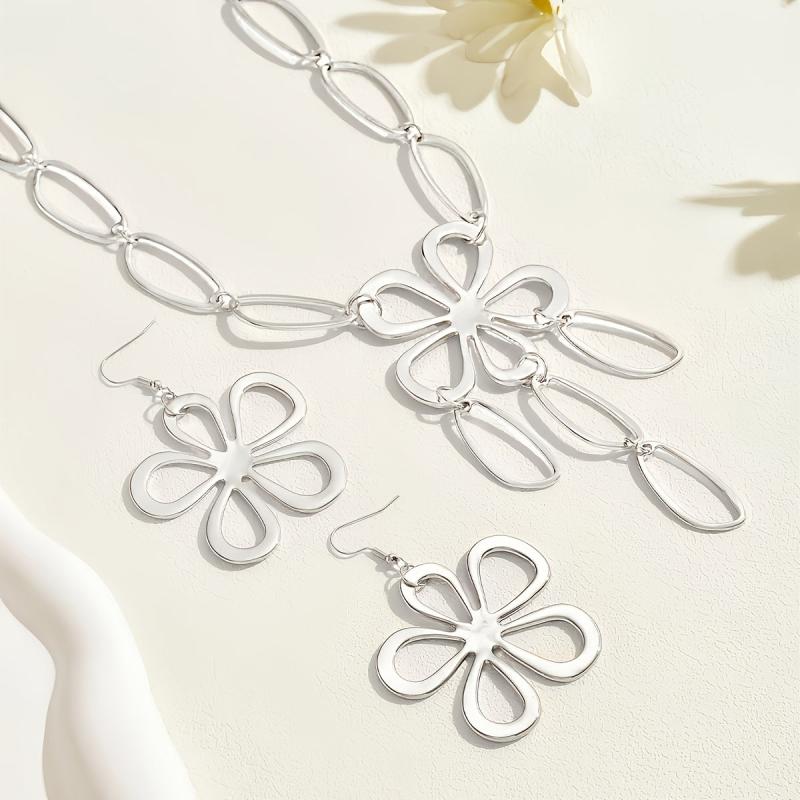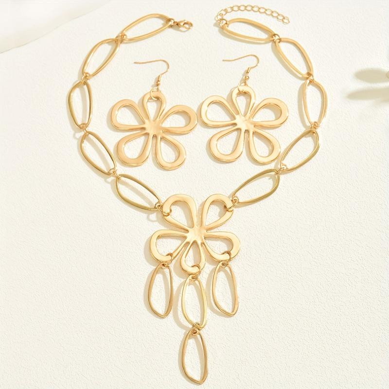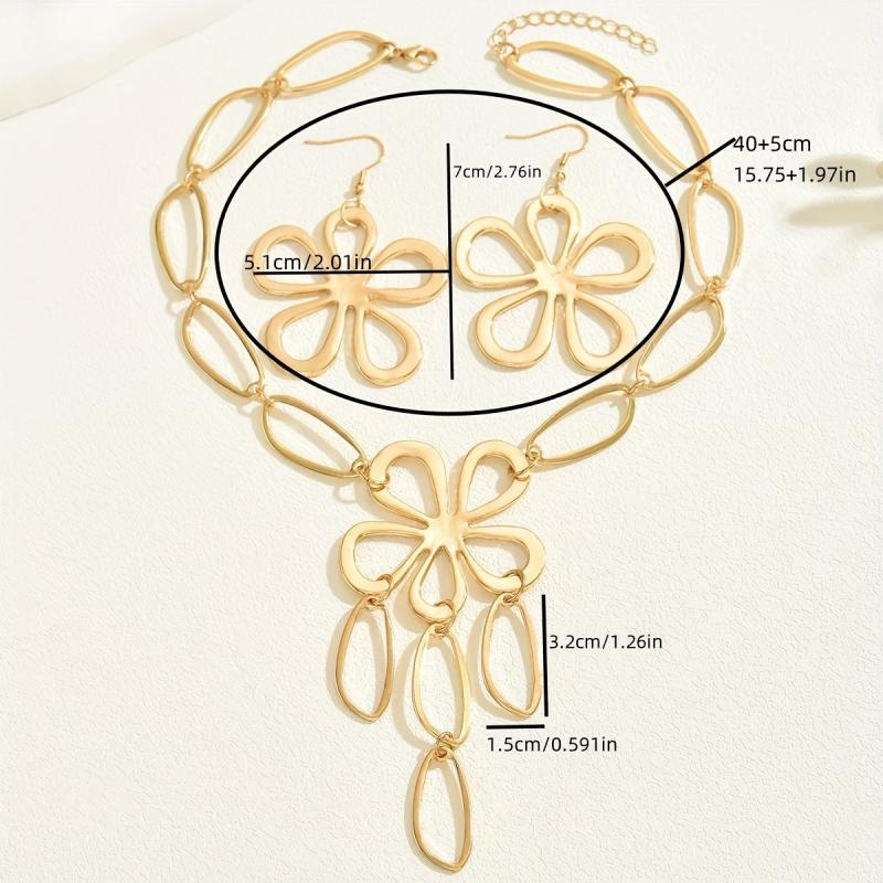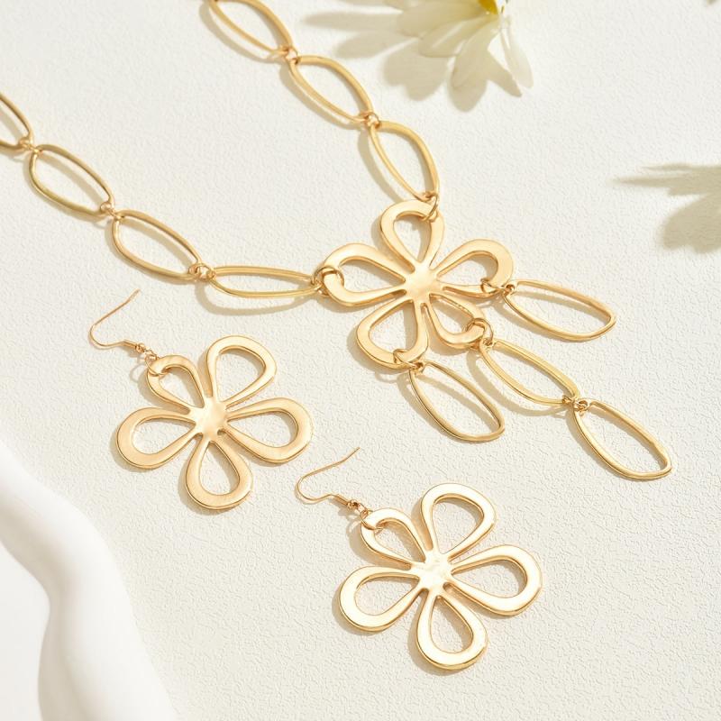 3-piece set of golden geometric hollow flower oval buckle chain tassel necklace and earrings that can be worn daily or for parties.