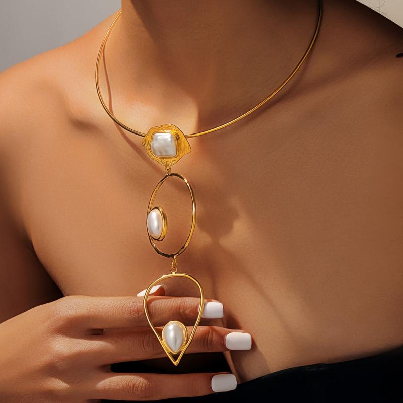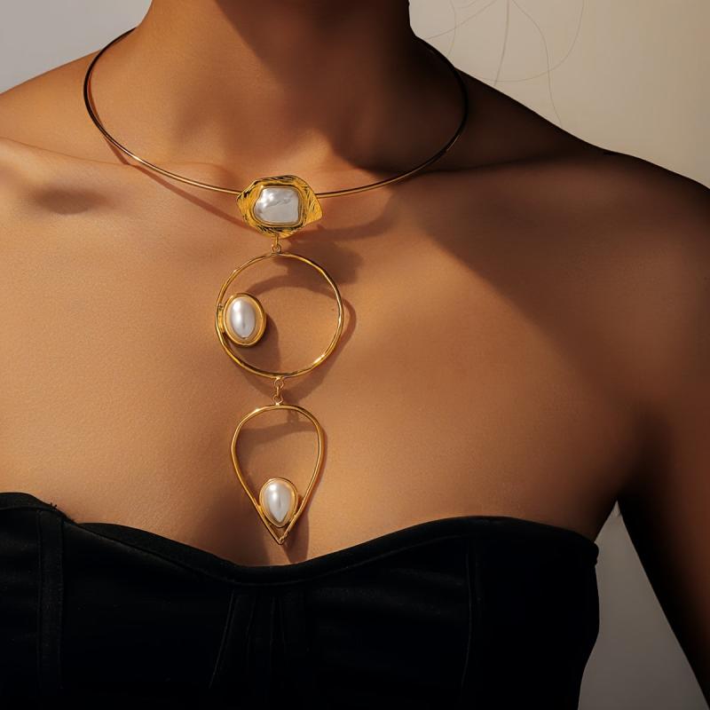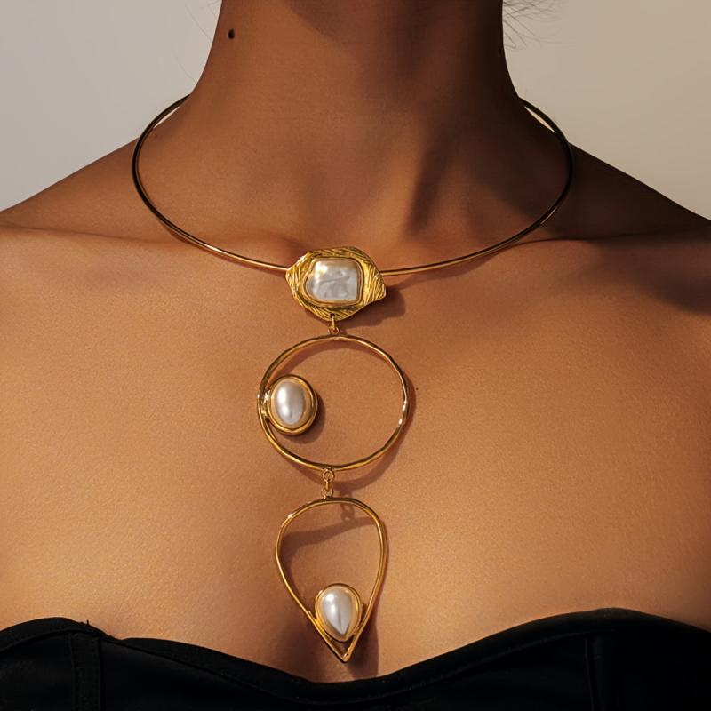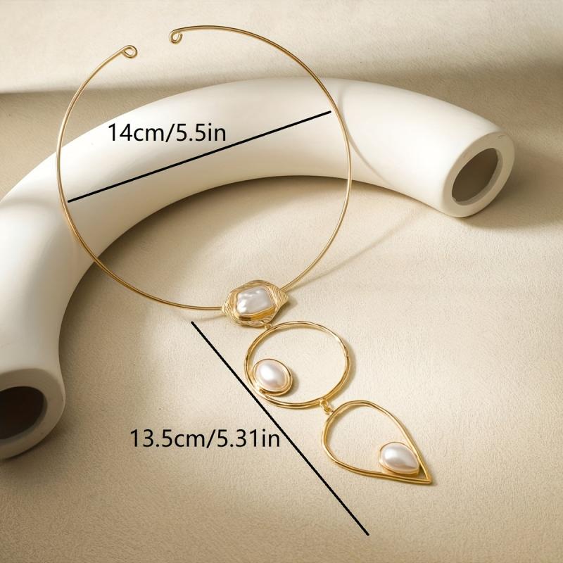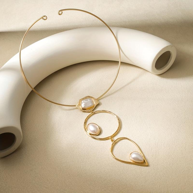Elevate your style with this trendy collar necklace featuring an irregular geometric shape design and a mix of round and teardrop metal rings inlaid with acrylic artificial pearls.
