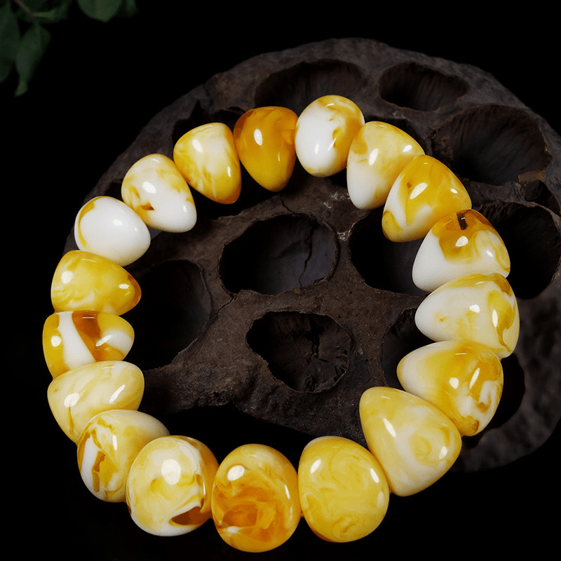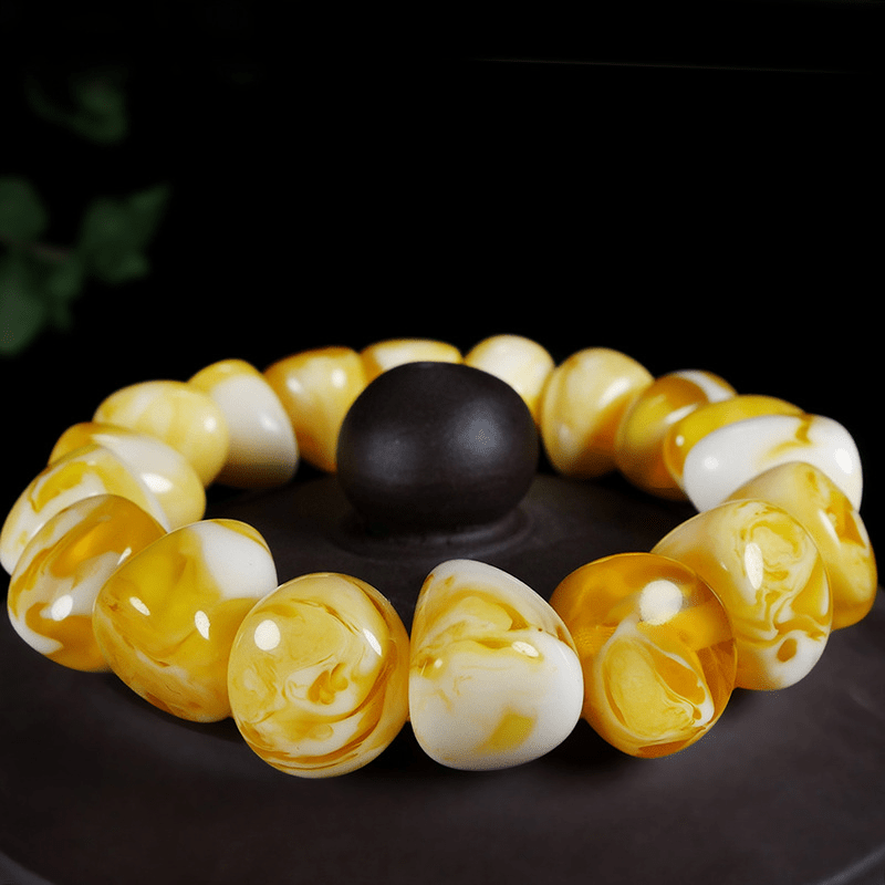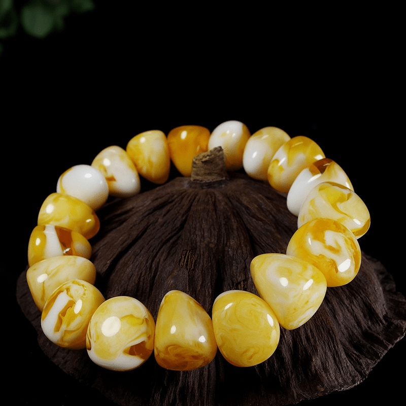 Enhance your wrist with this unique handstring featuring a combination of honey wax and pearl elements. Add a touch of elegance to any outfit.