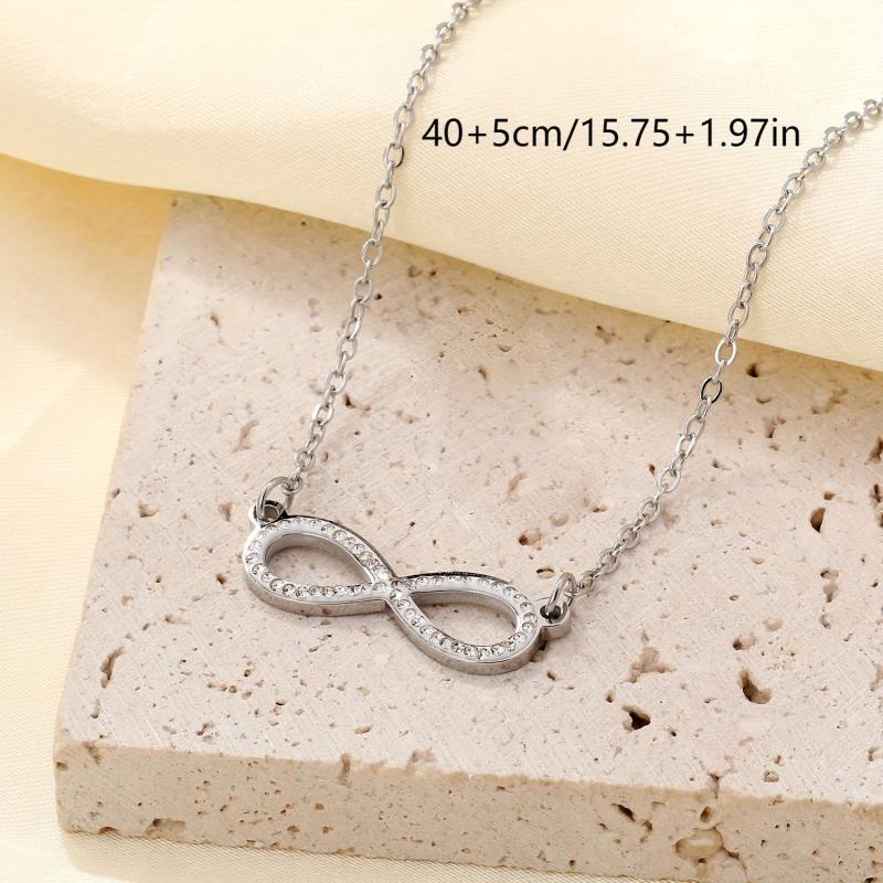 This elegant necklace features a delicate infinity symbol pendant adorned with sparkling stones. It is crafted from high-quality stainless steel, making it durable and resistant to tarnishing.