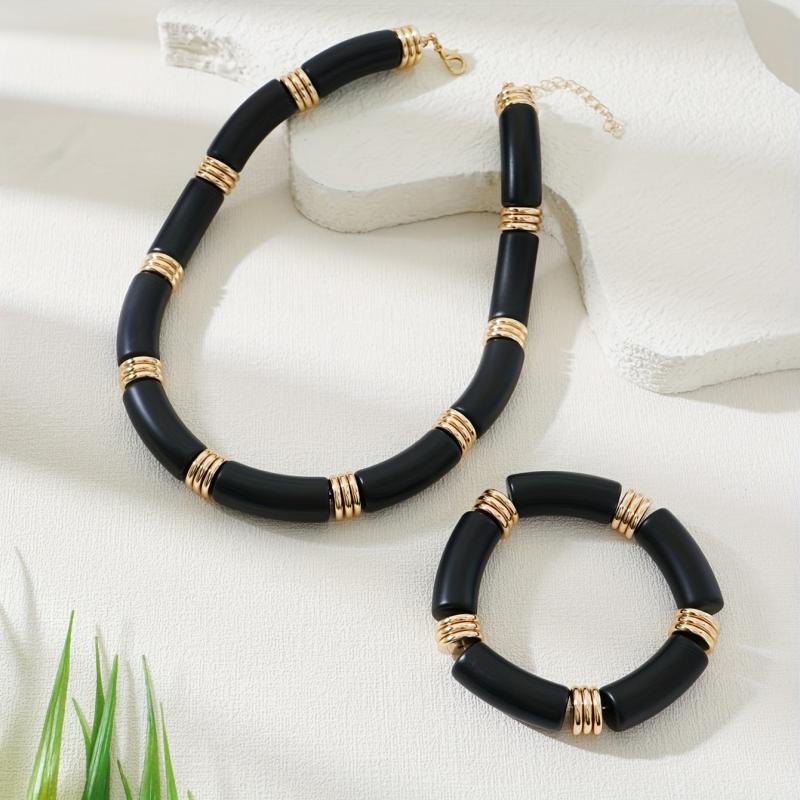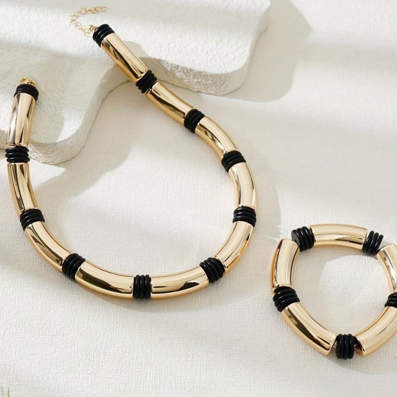 Complete your look with this stylish and minimalist two-piece jewelry set designed with a vintage touch. The set includes a necklace and bracelet made of curved cylinder and flat round beads along with golden dual accessories.