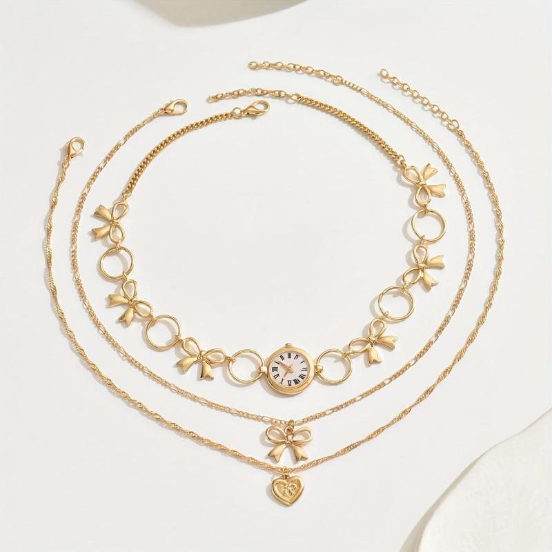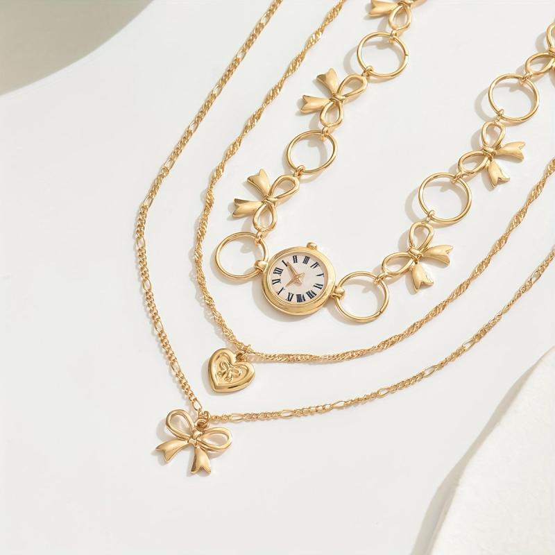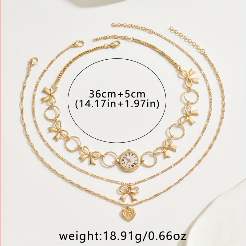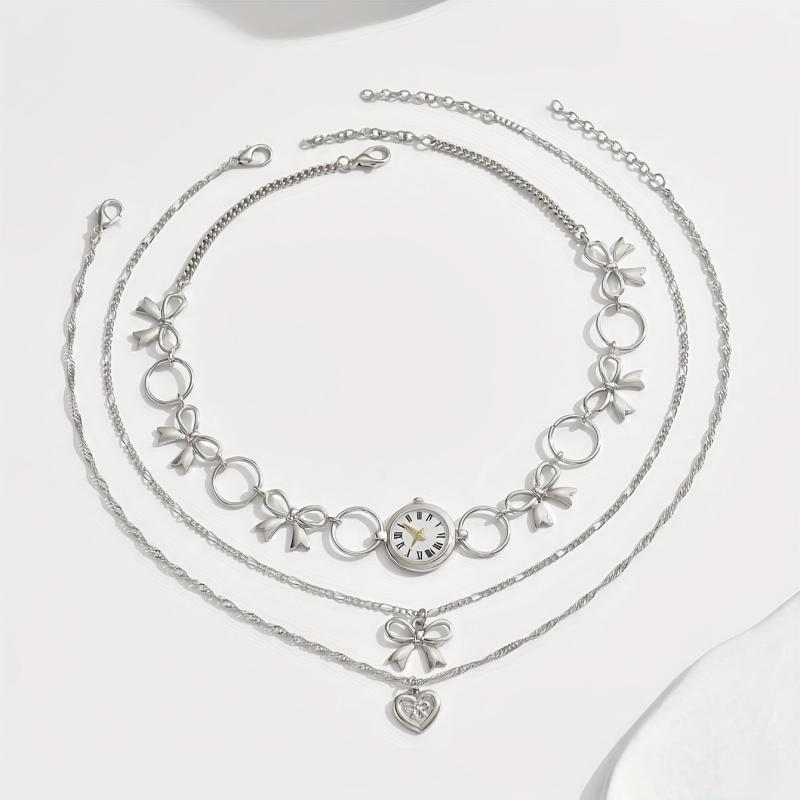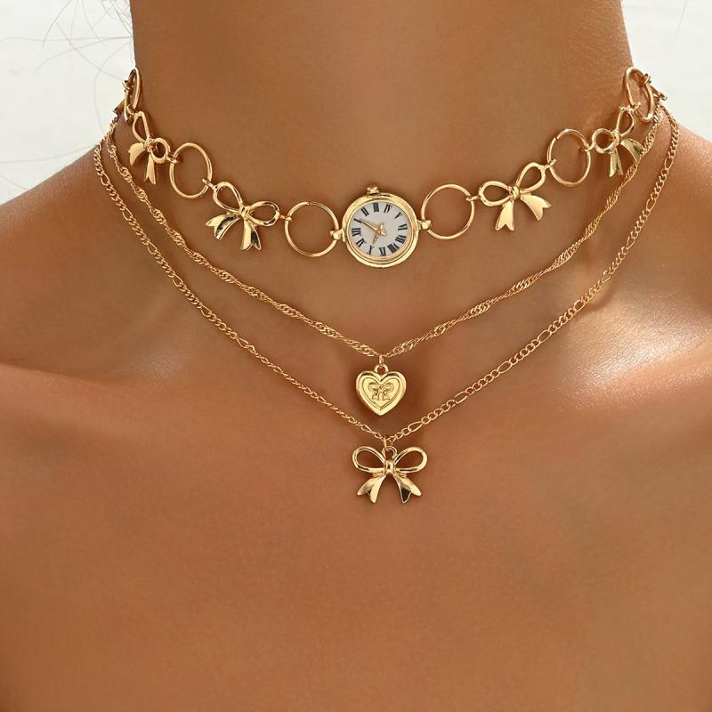 Elevate your style with this bohemian retro layered chain necklace featuring heart bow and vintage clock pendants. Perfect for casual attire, parties, or as a thoughtful gift.