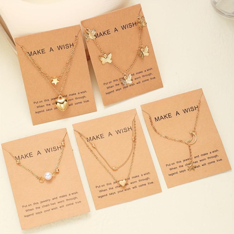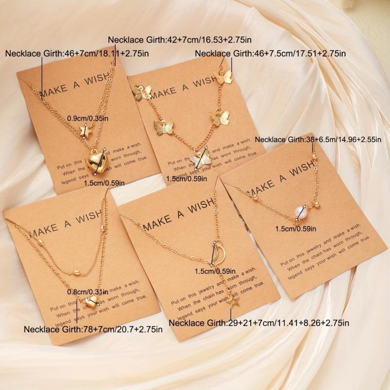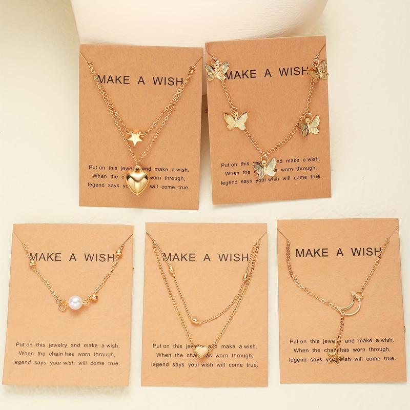 Elegant pendant necklace set made of zinc alloy with heart, star, moon, and butterfly designs adorned with faux pearls. Perfect for daily wear, dates, vacations, and parties.