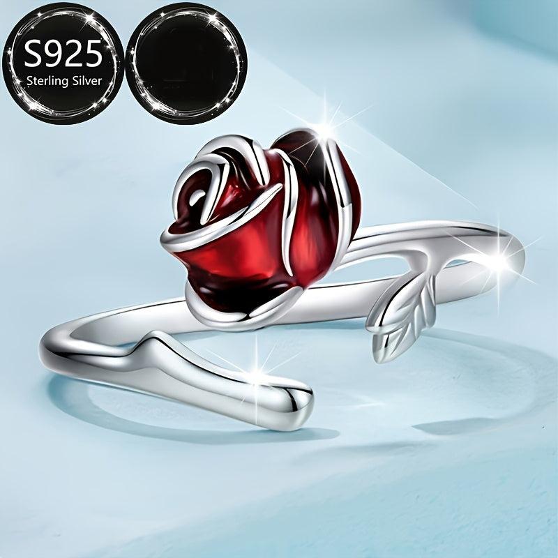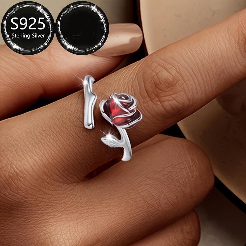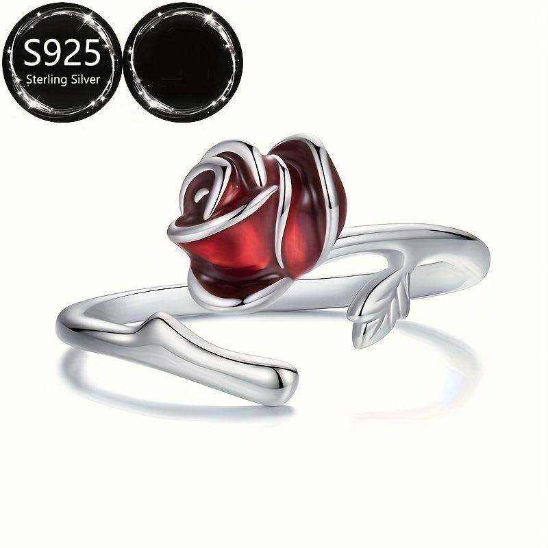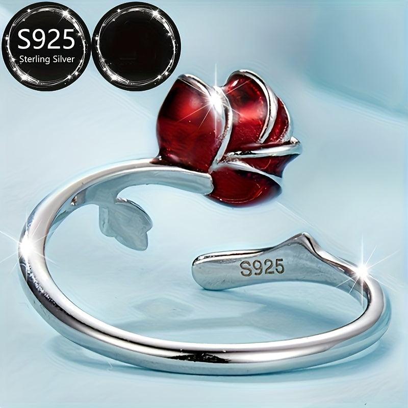 This elegant open ring features a red rose design, made of pure s925 silver. It is adjustable to fit any finger size. Perfect for parties or as a gift to a good friend.